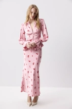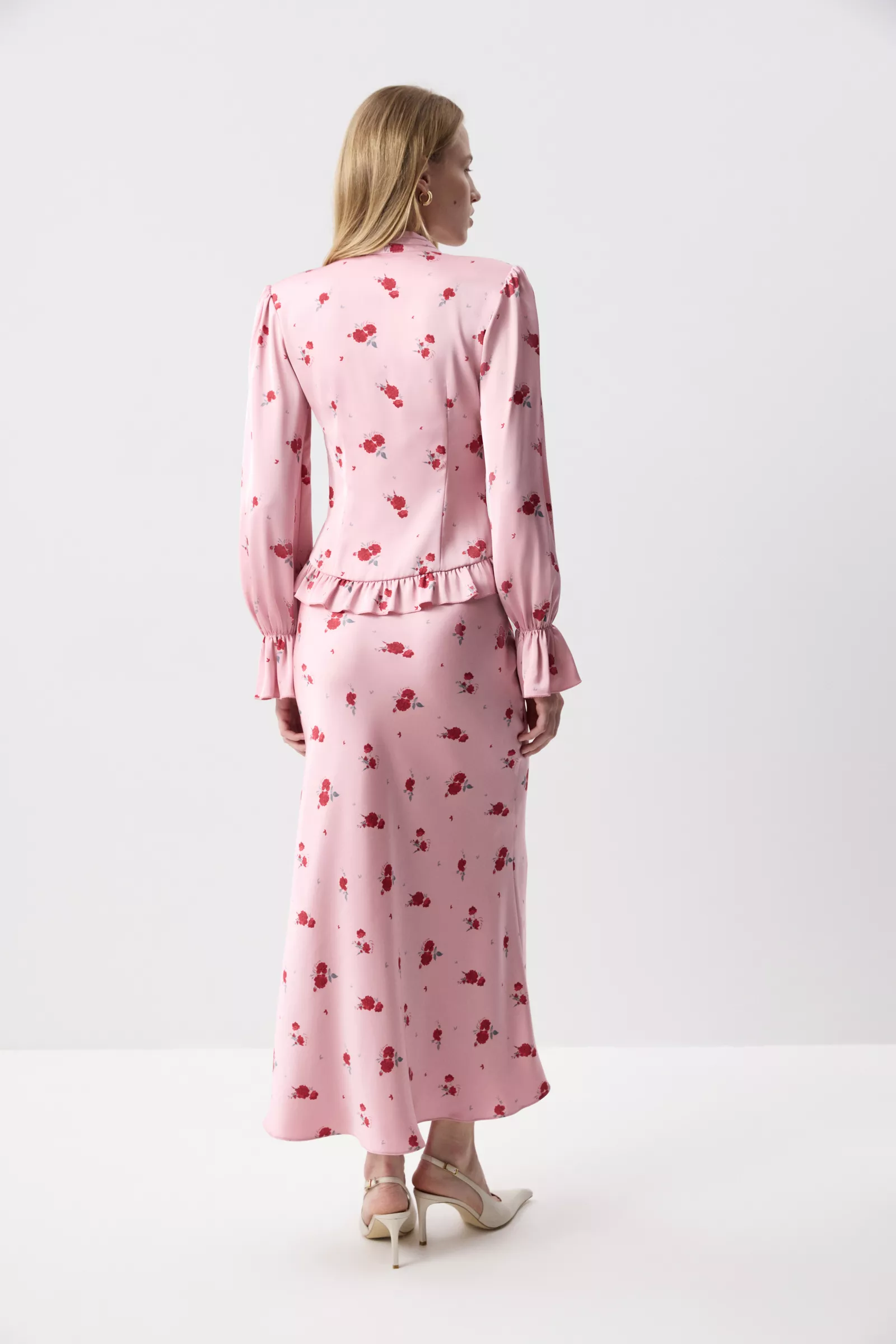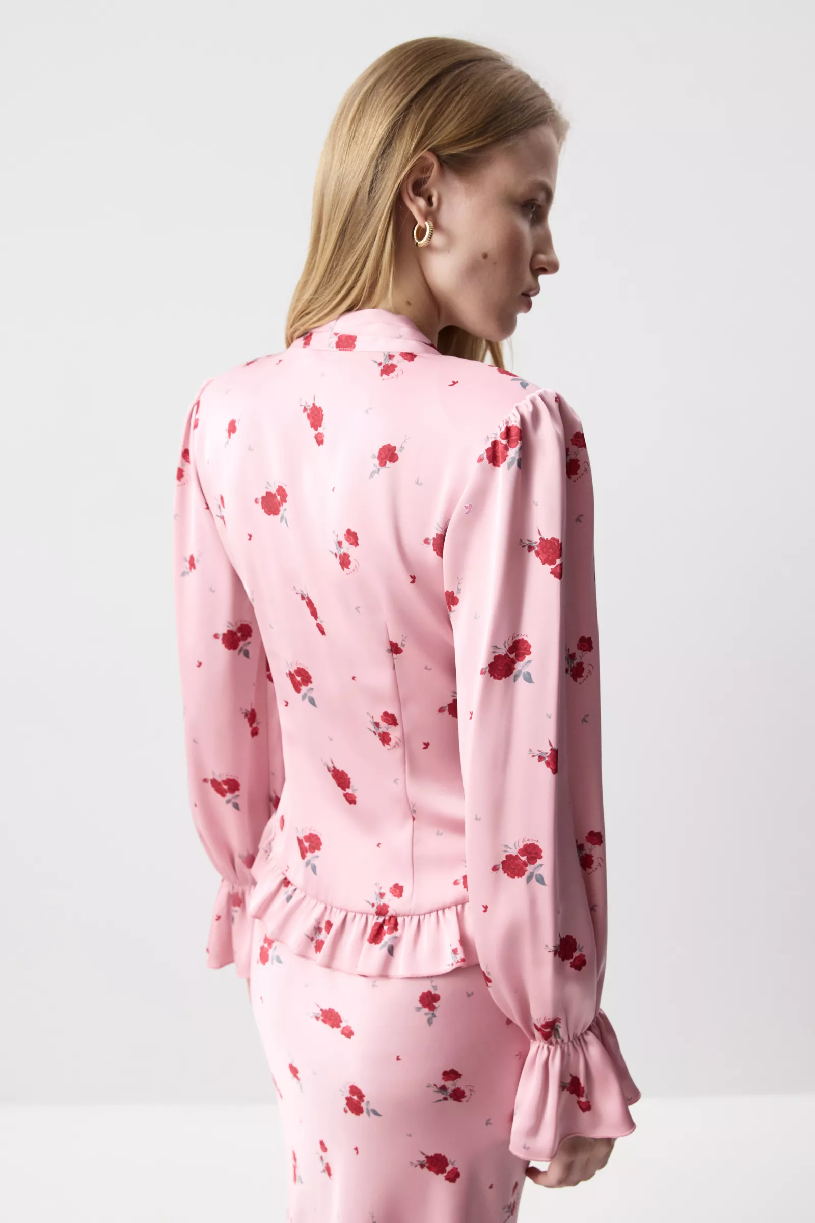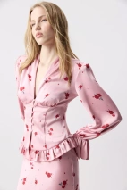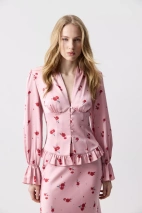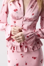 Сочетайте блузу с комплектной юбкой из идентичной ткани. Рукава с лёгким объёмом и сборкой по низу добавляют мягкости, а деликатная рюша по нижнему краю придаёт модели романтичное настроение и завершённость. Сочетайте как с классическими костюмами, так и с нарядными юбками и брюками.