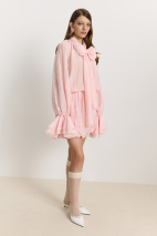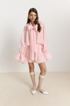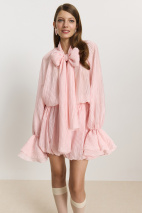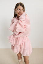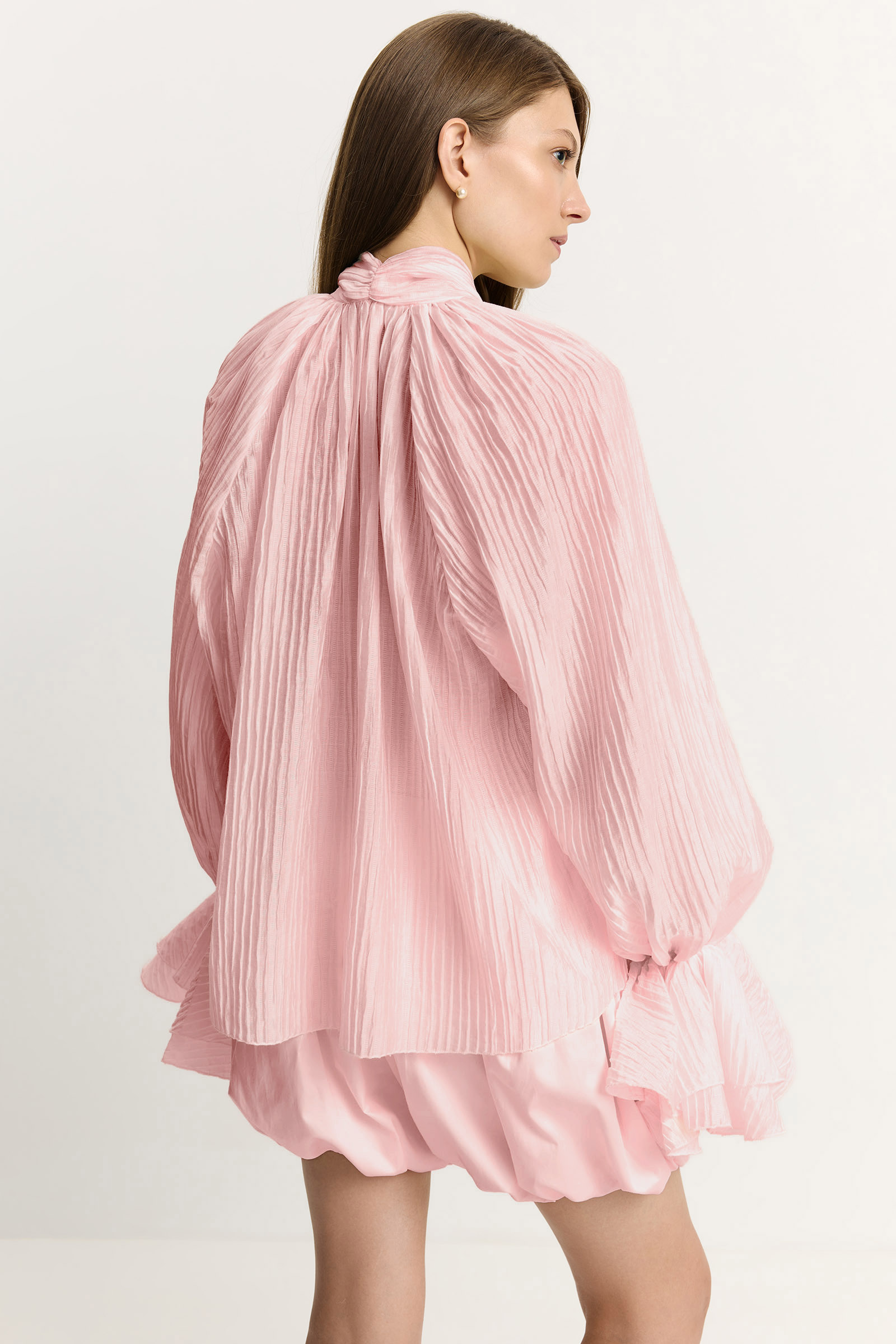 Воздушная блузка из полупрозрачной гофрированной ткани. С лентами, которые вы можете оформить в бант или оставить ниспадающими. Объемные рукава с легкими сборками и резинками на манжетах добавляют нежности и объема.