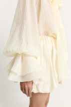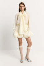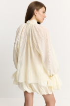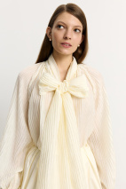 Воздушная блузка из полупрозрачной гофрированной ткани. С лентами, которые вы можете оформить в бант или оставить ниспадающими. Объемные рукава с легкими сборками и резинками на манжетах добавляют нежности и объема.