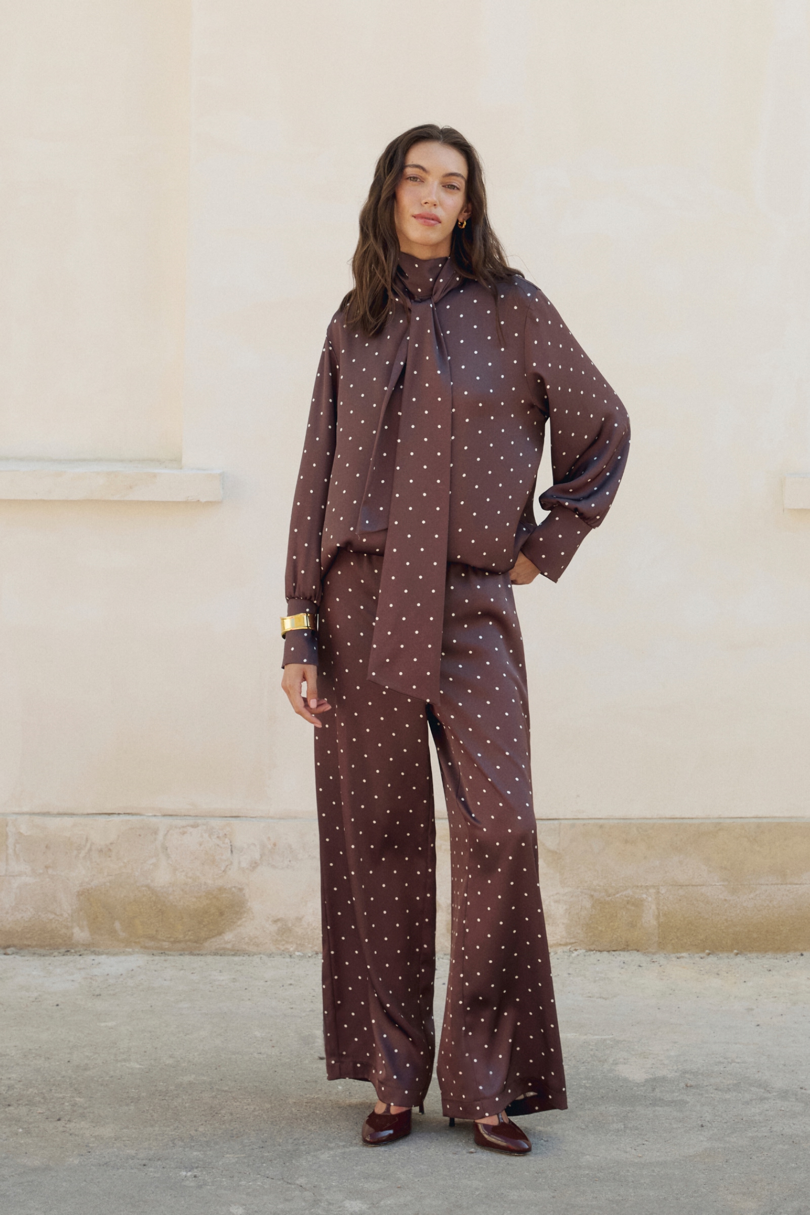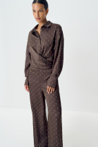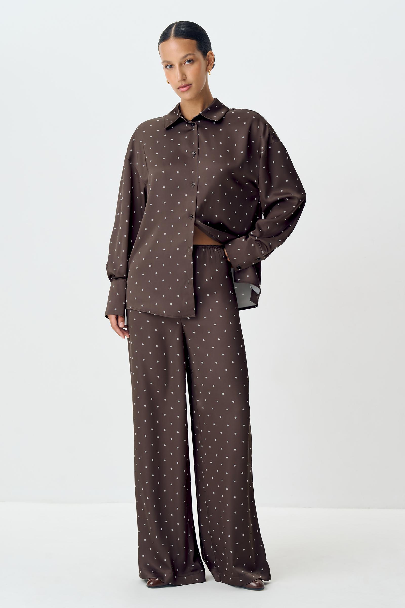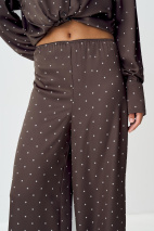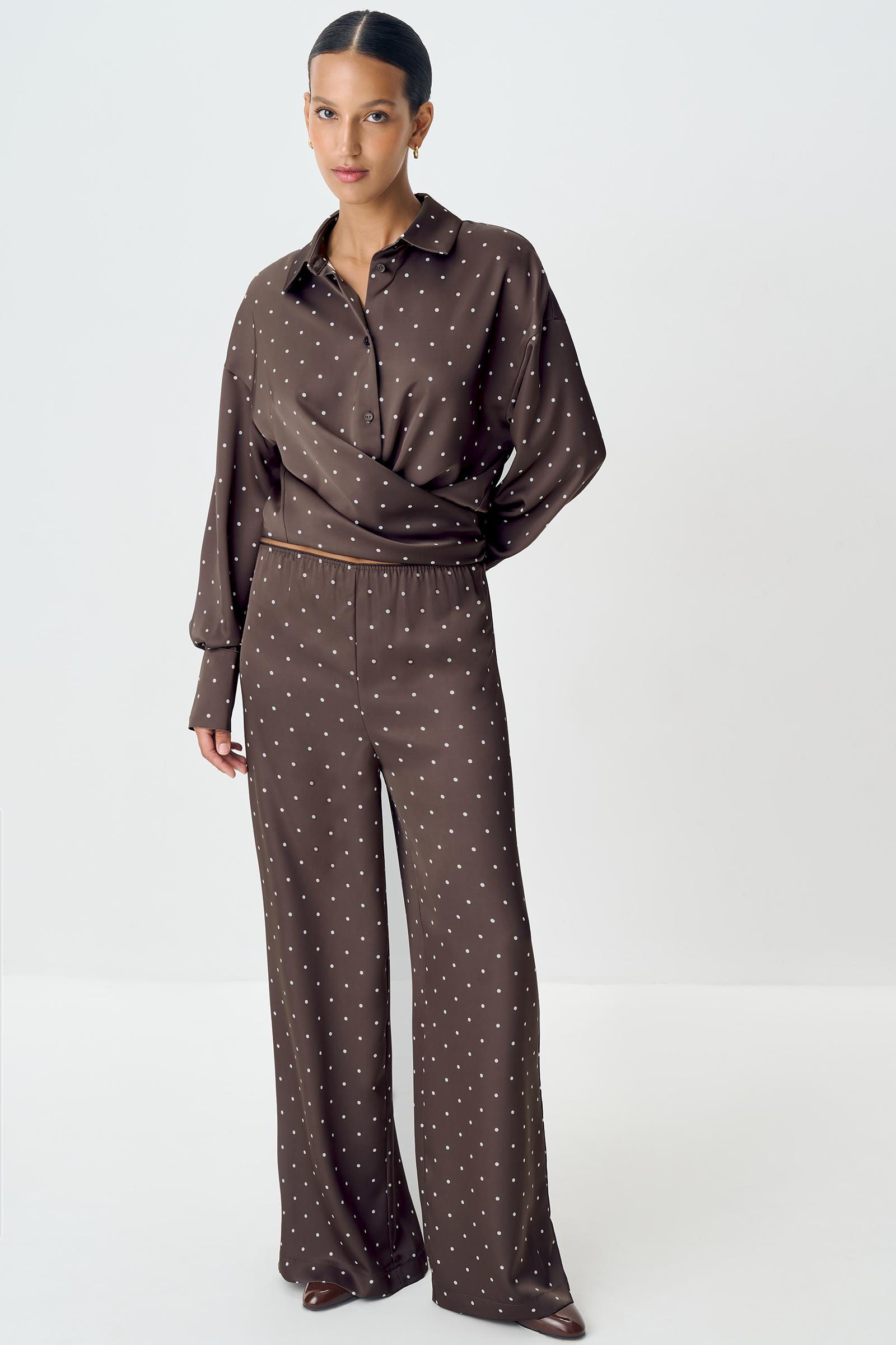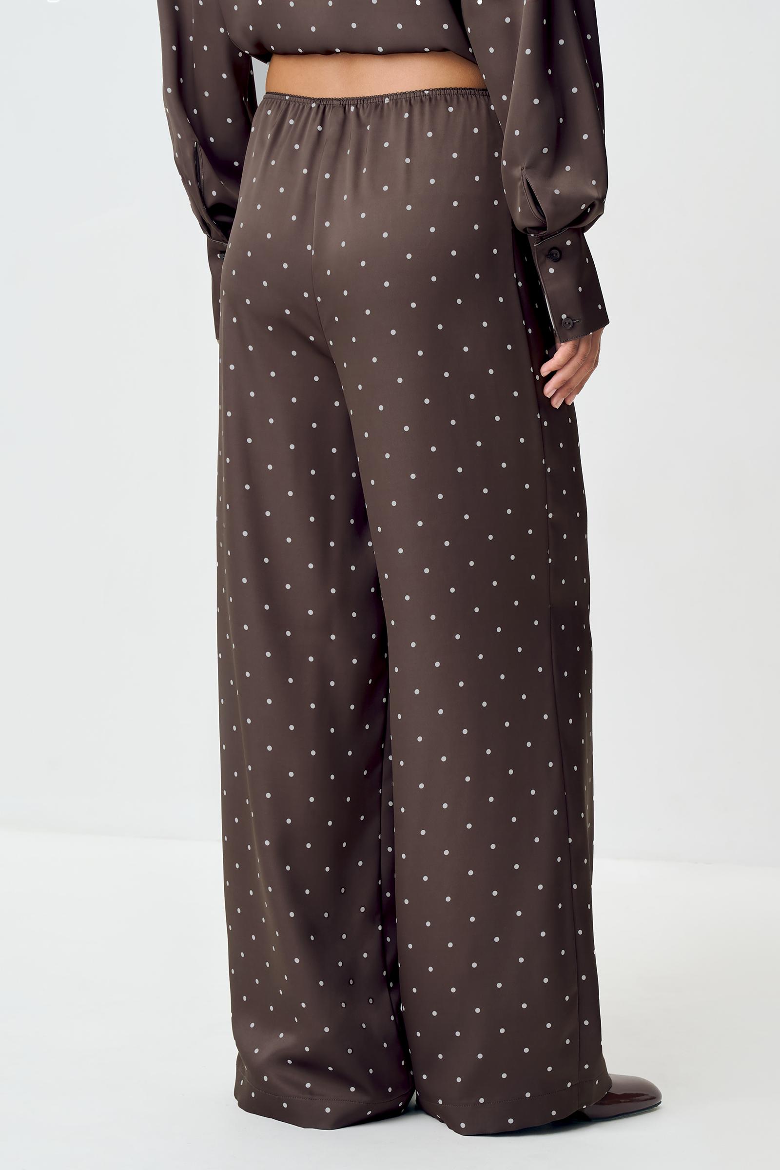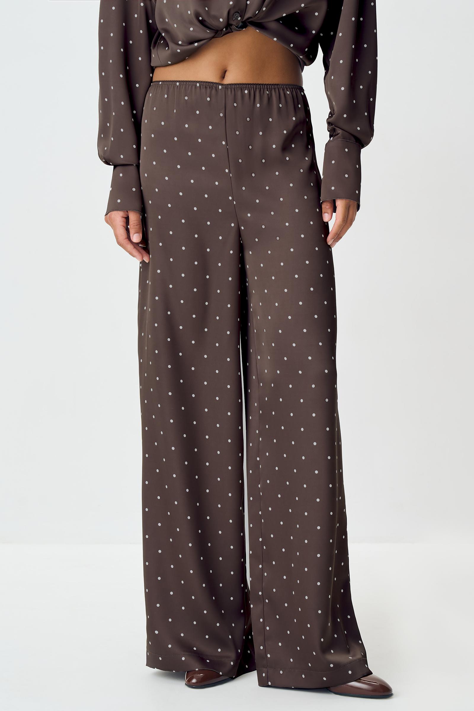 Прямые широкие брюки из сатина с гороховым принтом. Широкая подгибка по линии низа. По линии талии декоративная резинка с фестонами. Мягкая струящаяся ткань, с вискозой в составе, добавляющая легкость в образ.