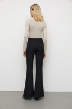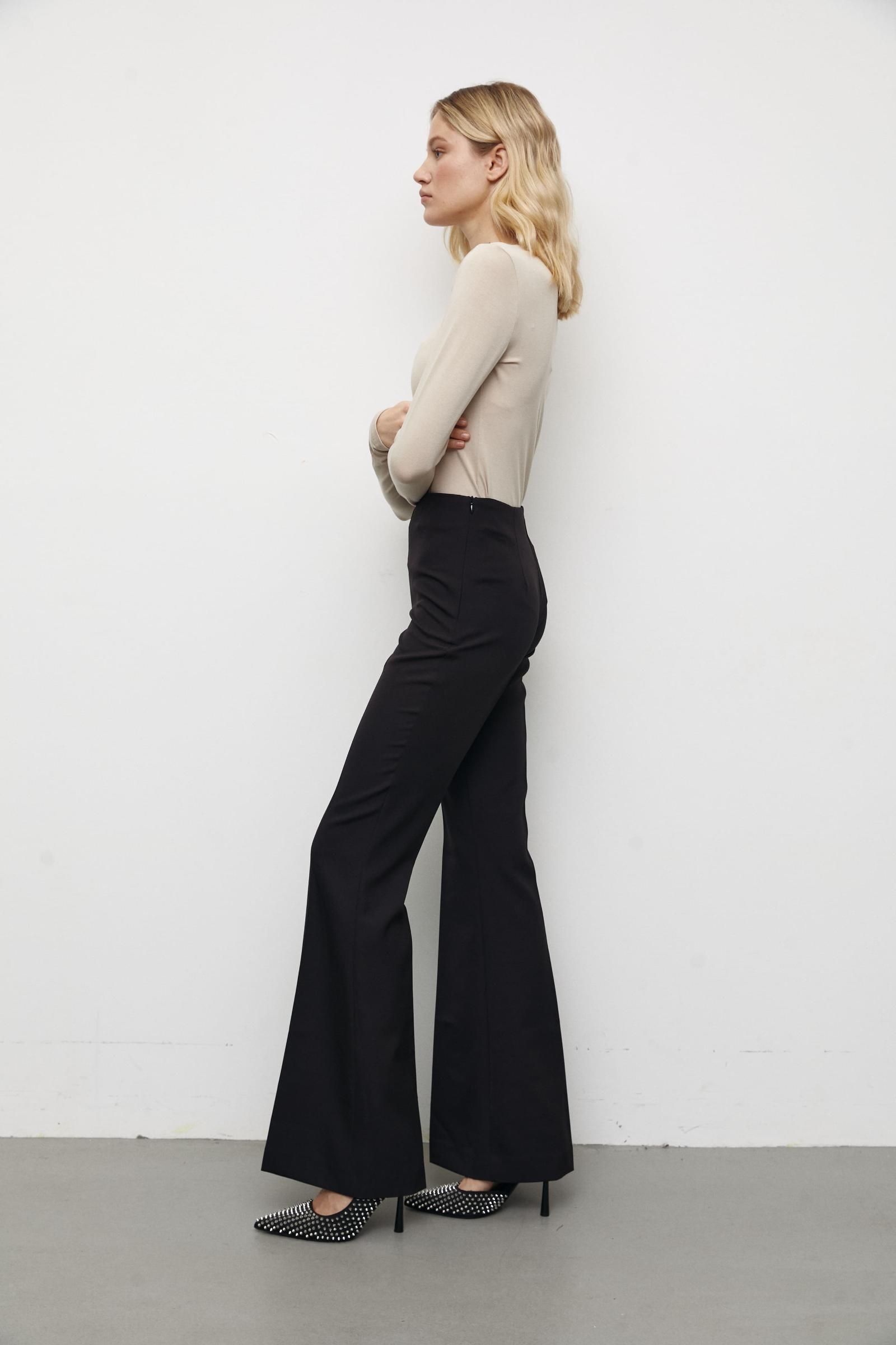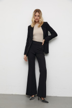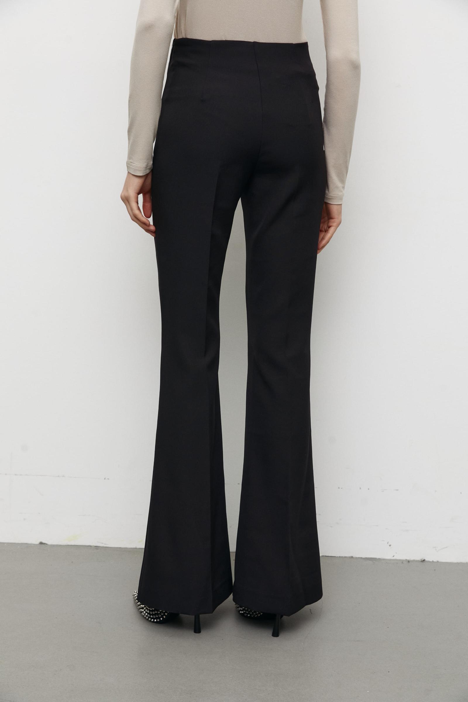 Классические брюки-клеш на высокой посадке. Облегающий силуэт делает акцент на линии талии и деликатно подчеркивает линию бедер. Крой модели визуально удлиняет ноги, а стрелки добавляют классических линий. Приятная телу ткань не мнется и хорошо держит форм.