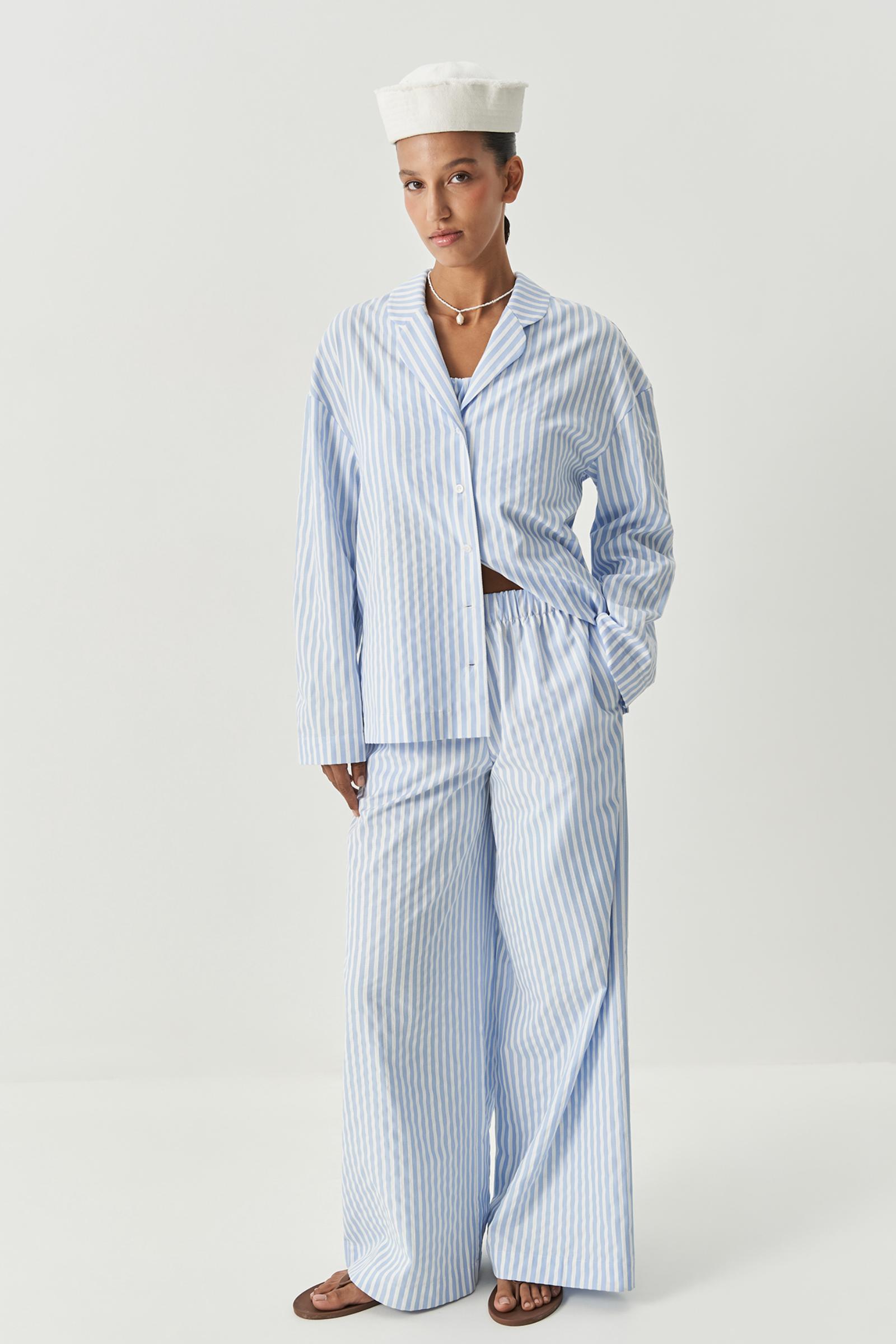 Хлопковые брюки с имитацией гульфика в полоску. Легкие свободные брюки на широком эластичном поясе, с тремя декоративными пуговицами на гульфике и одной на поясе, что отсылает изделие к бельевому стилю. Брюки с карманами в боковых швах.