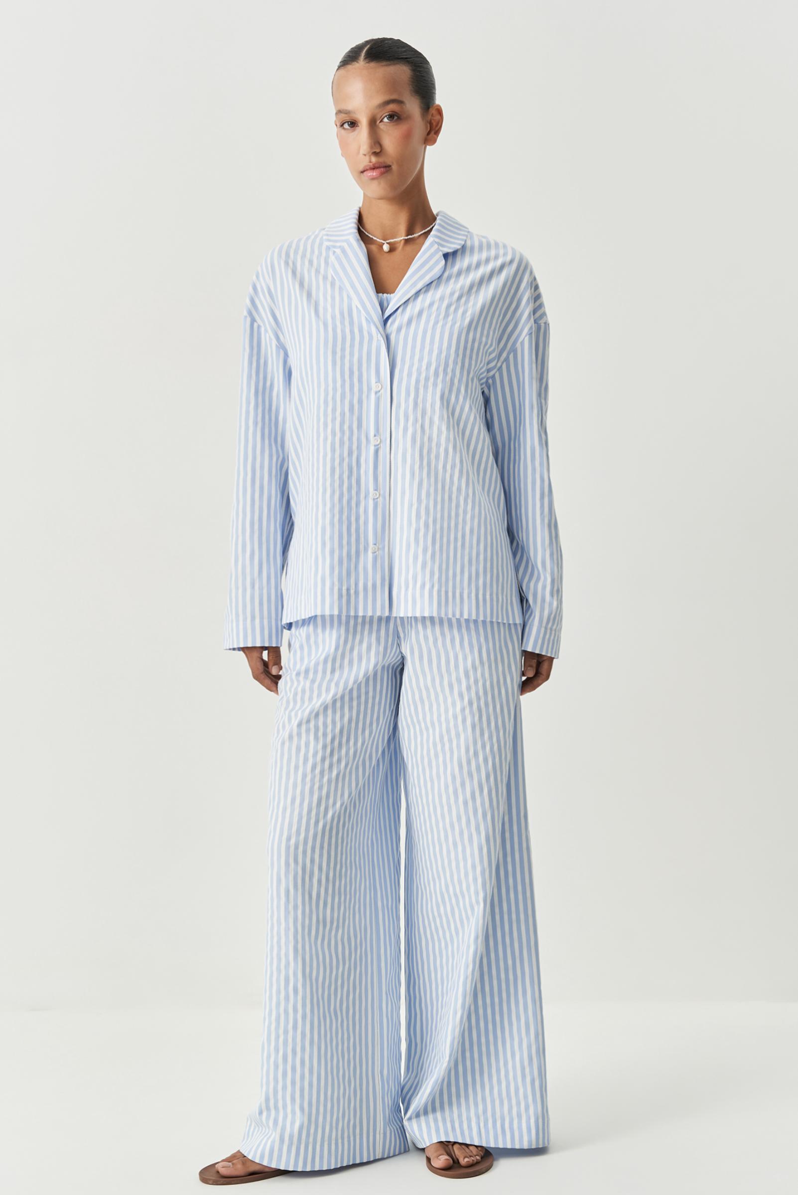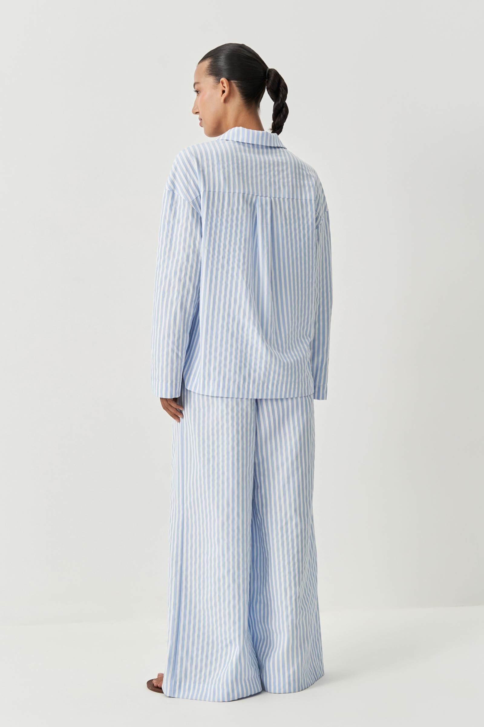 Брюки словно созданы для расслабленных и неторопливых выходов. Составьте комплект в рубашкой в тон, которую можно носить застегнутой или расстегнутой с топом-бандо. Легкие брюки, несмотря на их сезонность, можно продолжить носить и с наступлением осени, например, с поло с длинным рукавом или свитером, делая акцент на разных фактурах.
