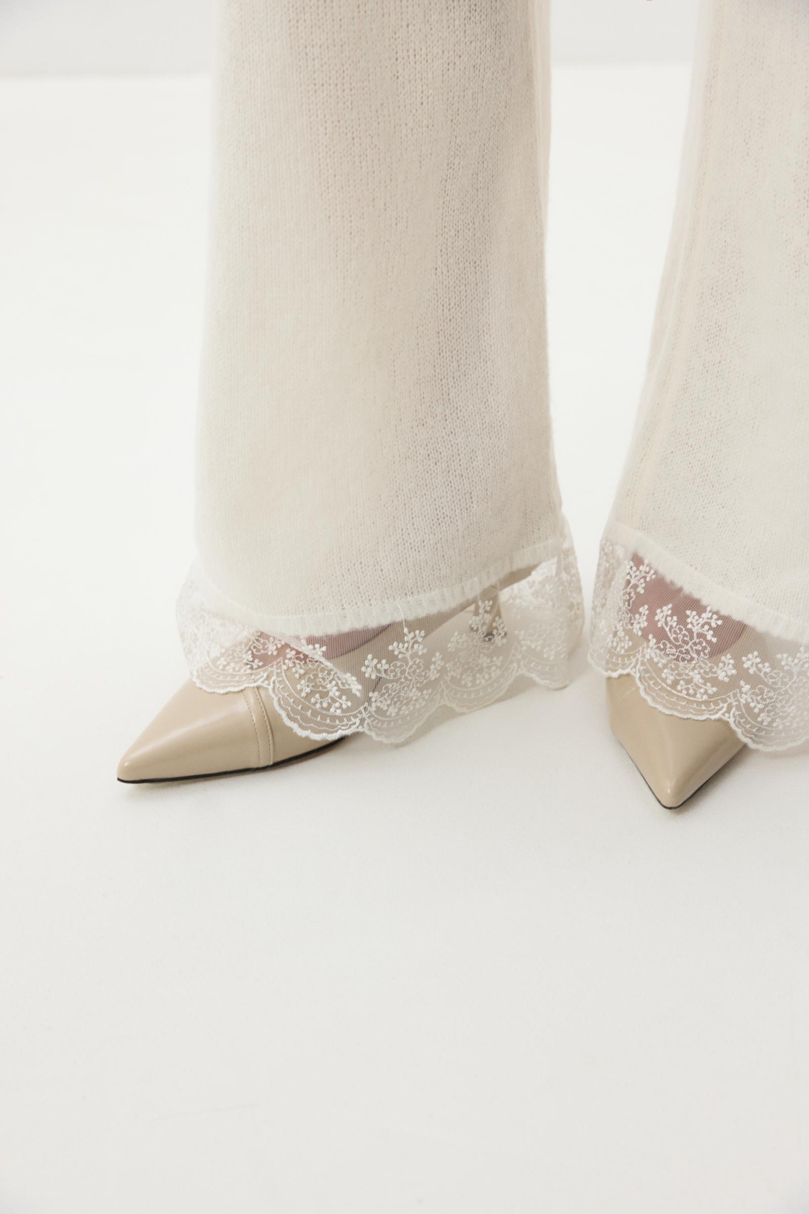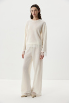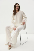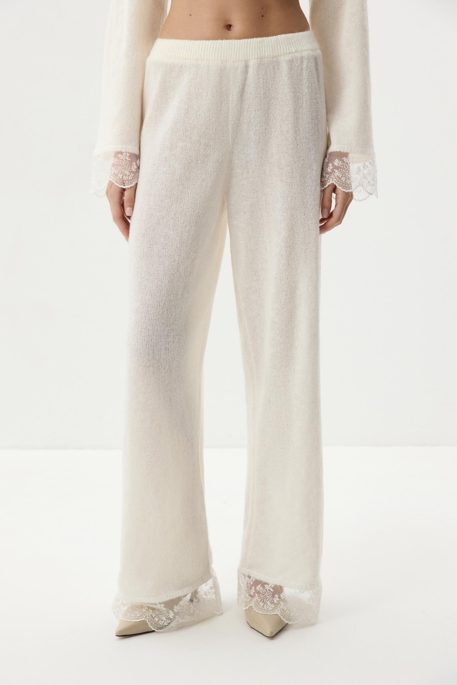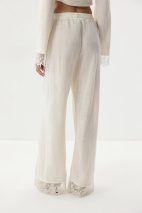 Ажурные брюки из мягкой пряжи с мохером в составе. Прямой объемный силуэт и эластичный широкий пояс позволит сочетать брюки в уютные хоум образы. Брюки декорированы широким воздушным кружевом, что добавляет изделию легкости.
