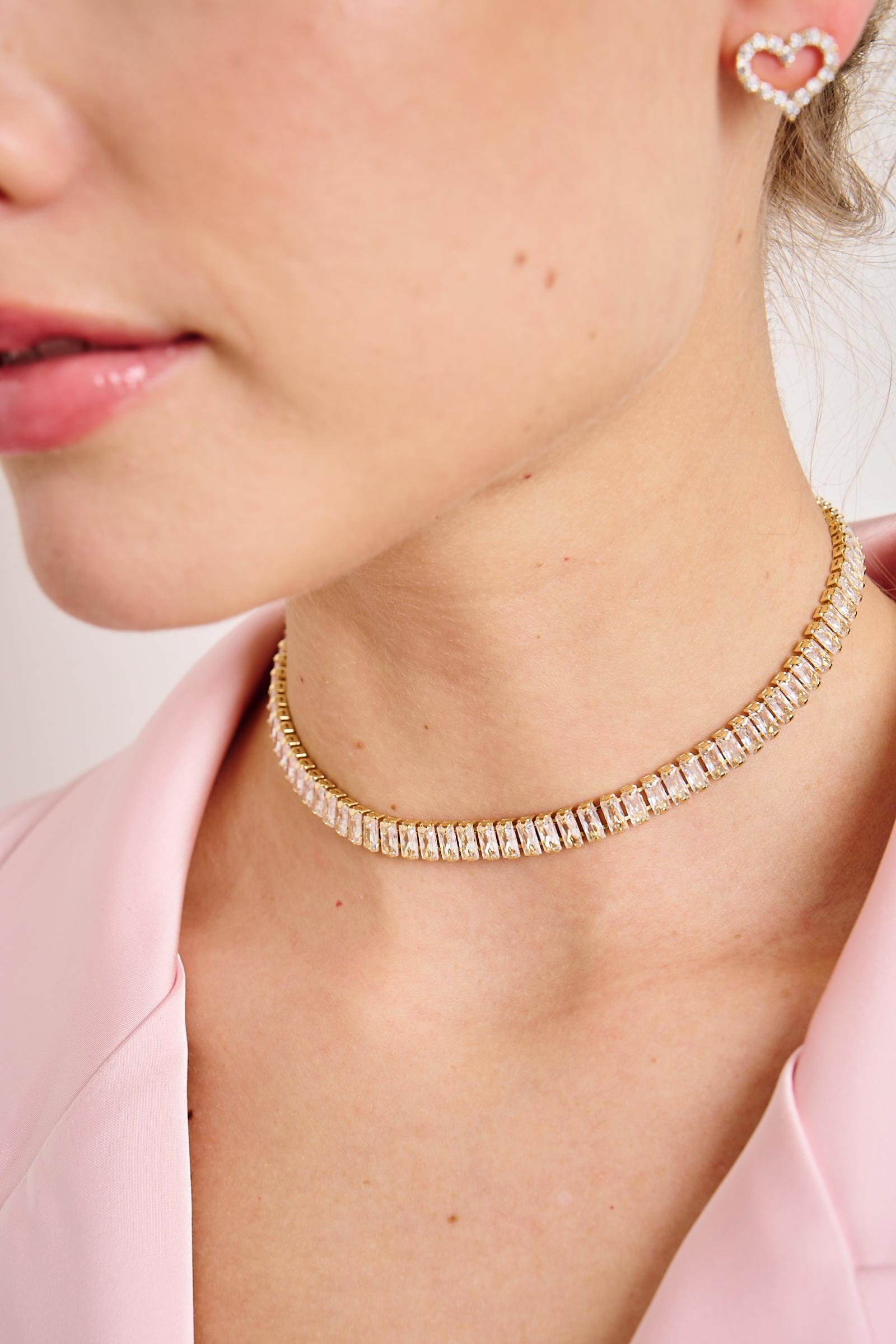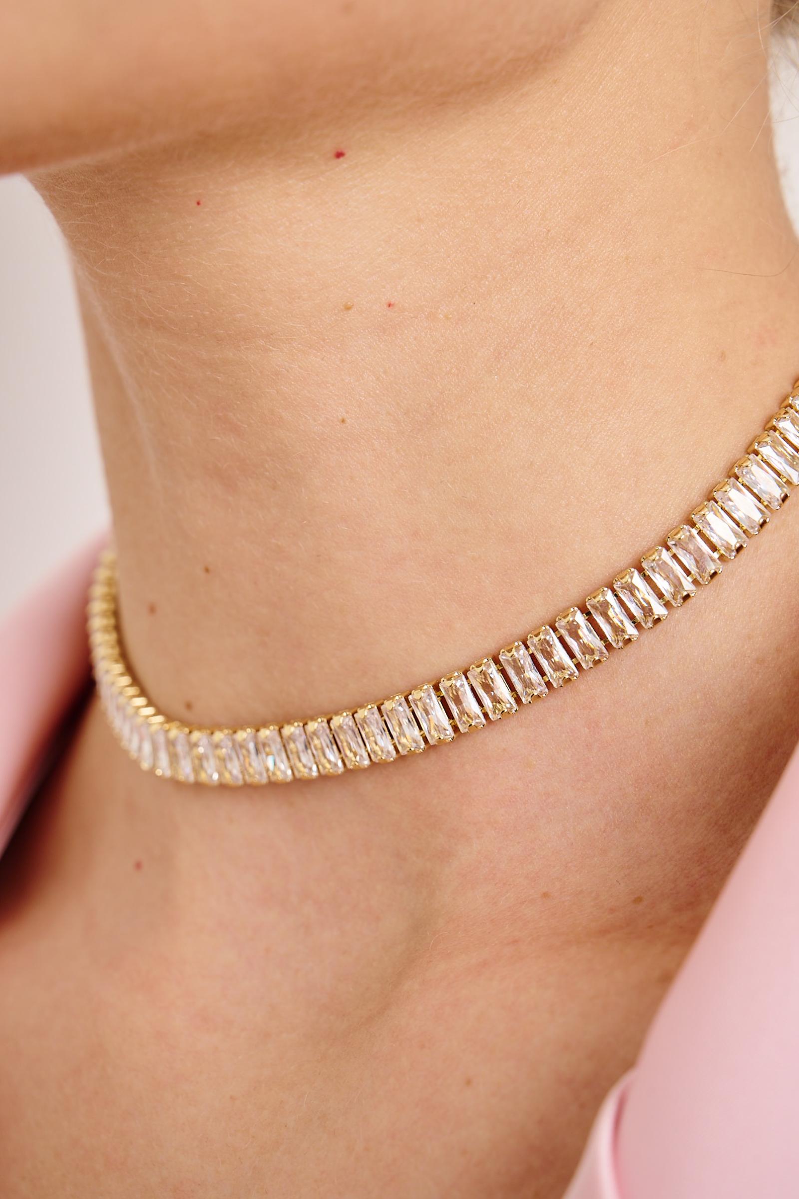 Колье-чокер разбавит ваши строгие образы с блузками и белыми рубашками, а также станет отличным дополнение к вечернему наряду в комплекте с браслетом-дорожкой и кольцом-дорожкой со стразами.
