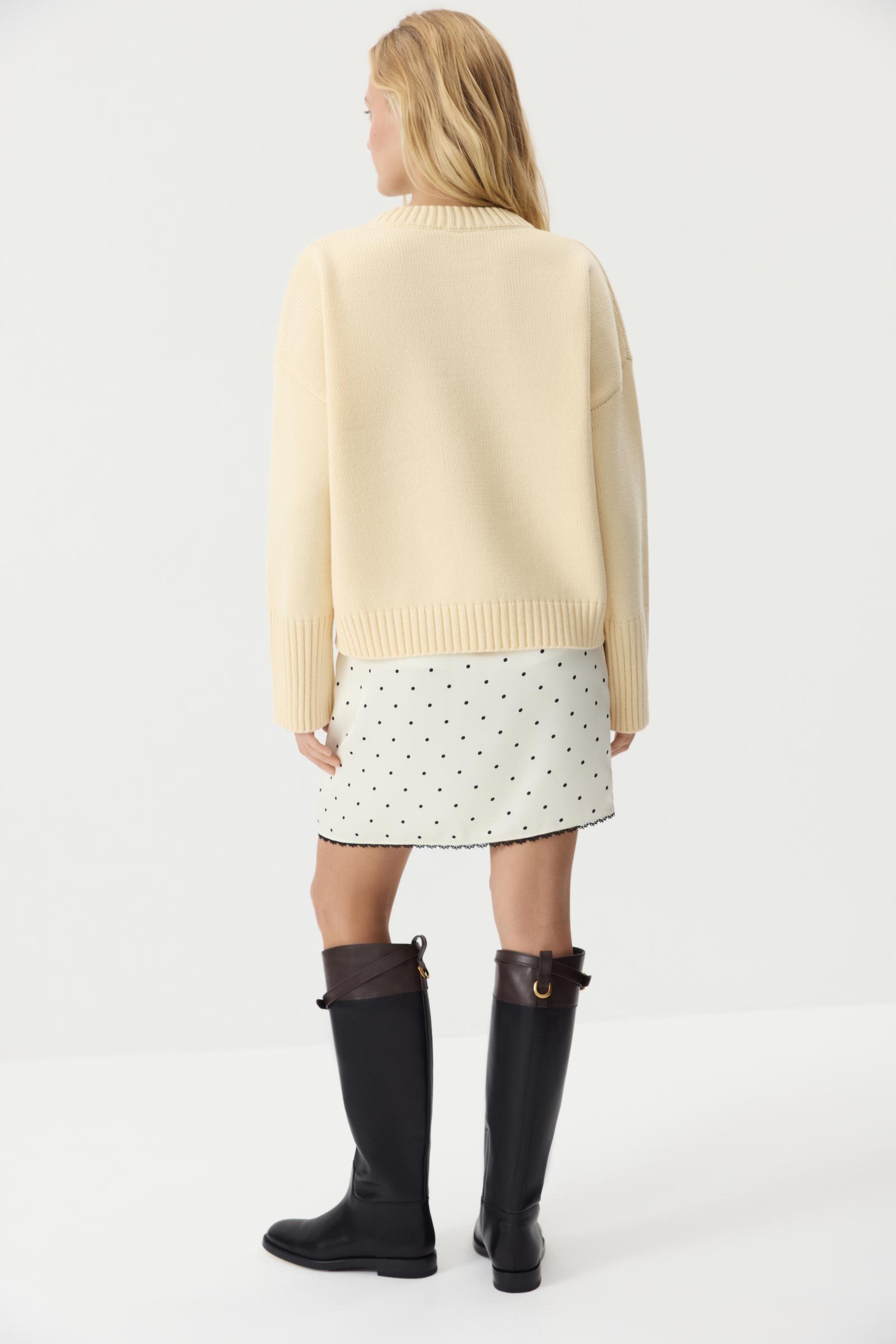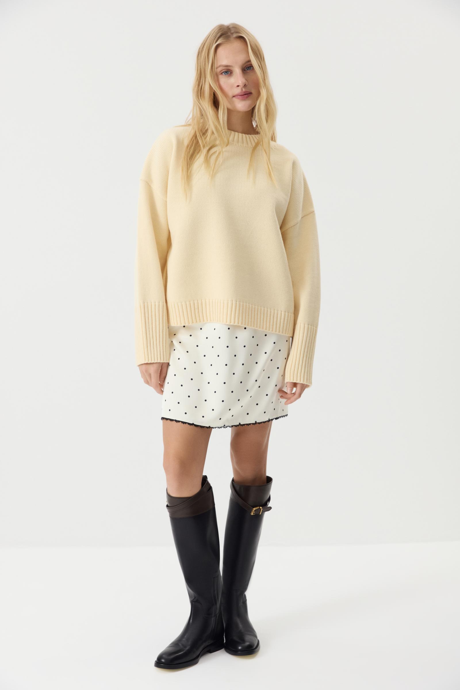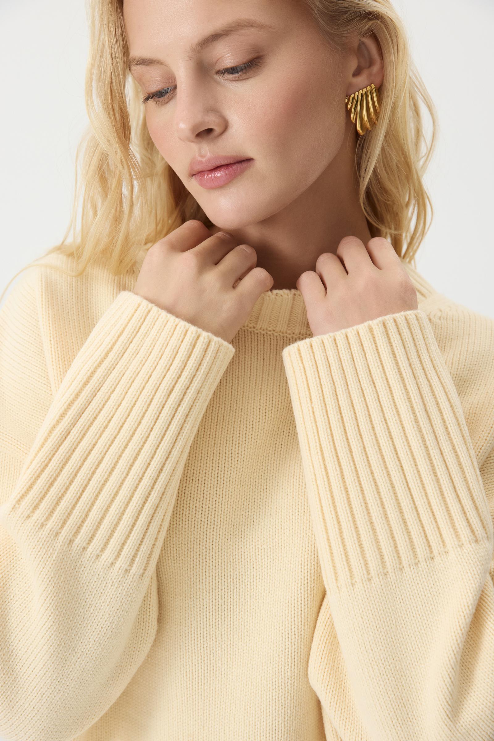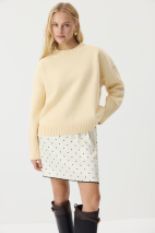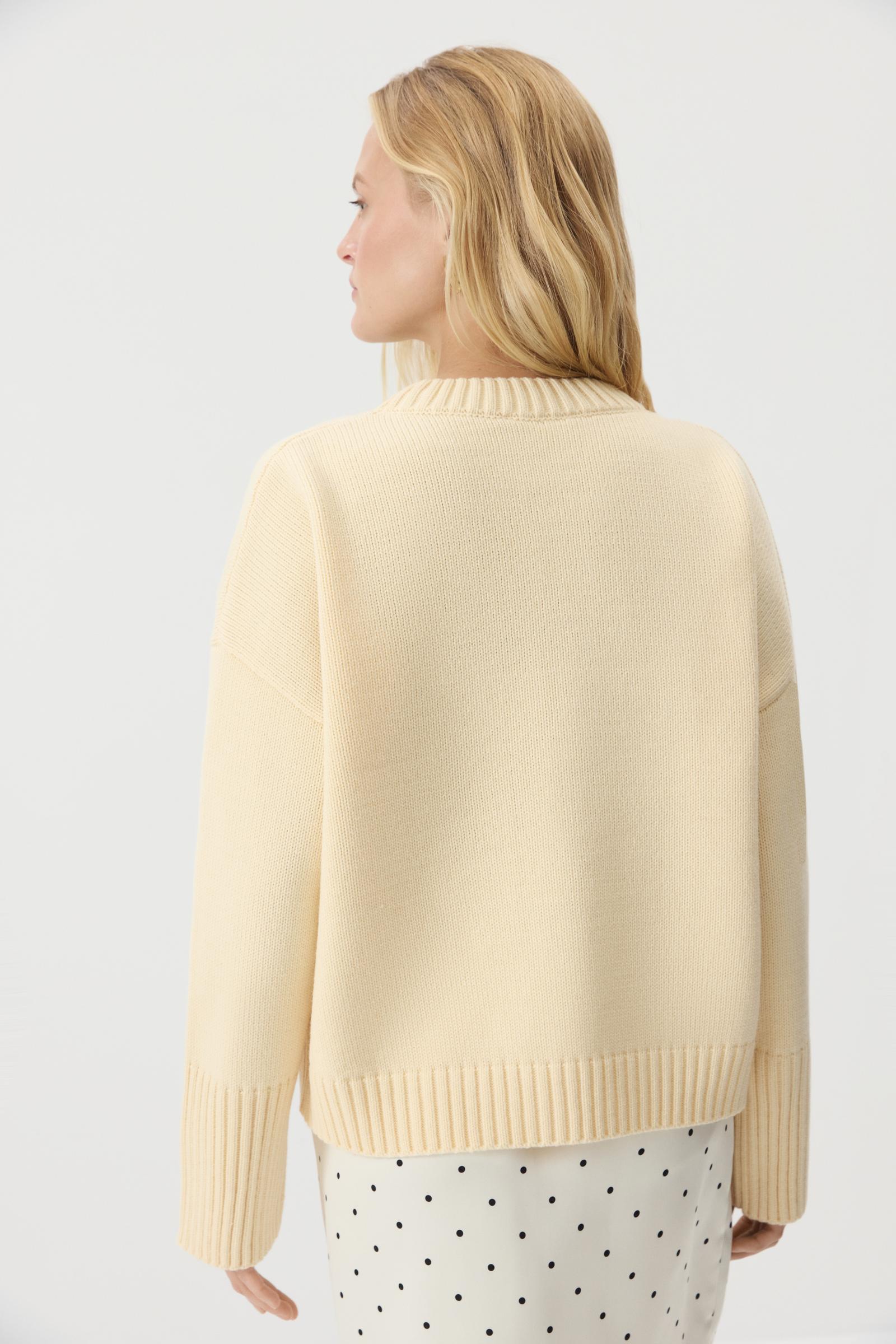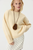 Объемный джемпер из плотной пряжи с шерcтью мериноса в составе. Мы сделали силуэт аккуратным и формоустойчивым круглой горловиной и универсальной длины, чтобы джемпер было удобнее носить с верхней одеждой. Джемпер связан в четыре нити крупными петлями, поэтому получается плотным, мягким и очень теплым.