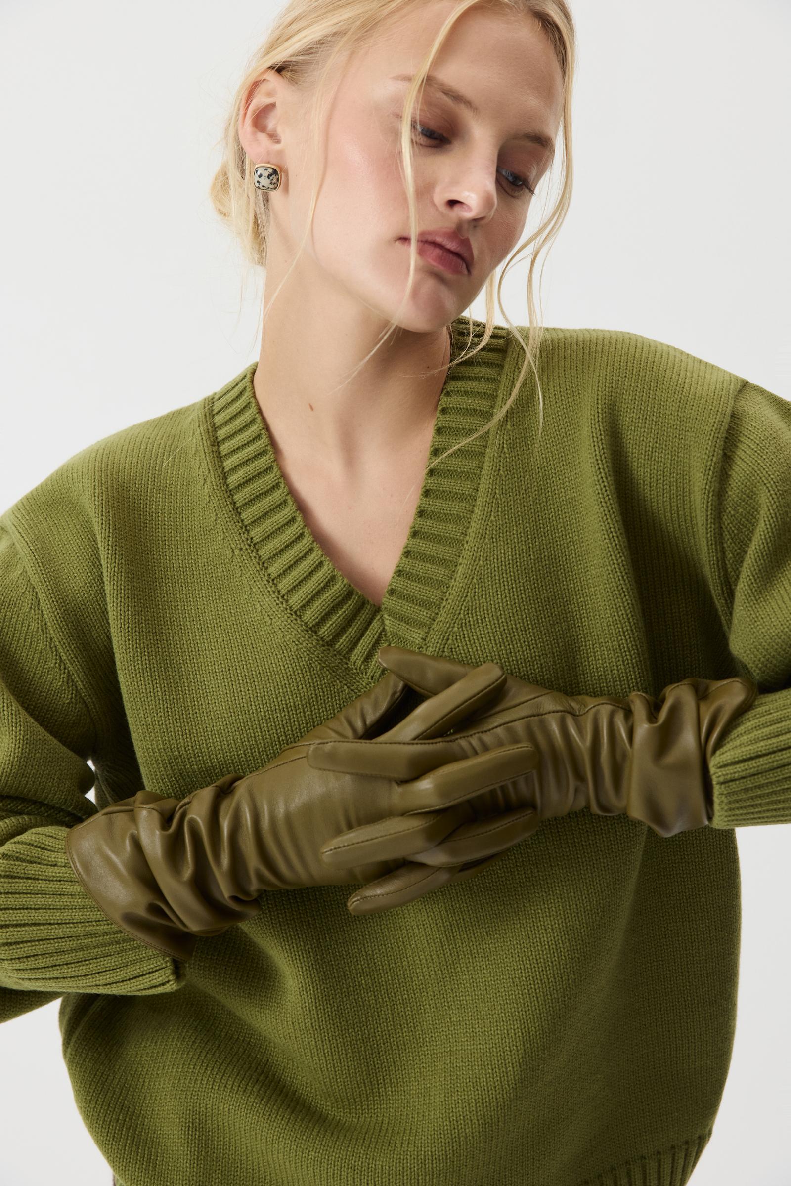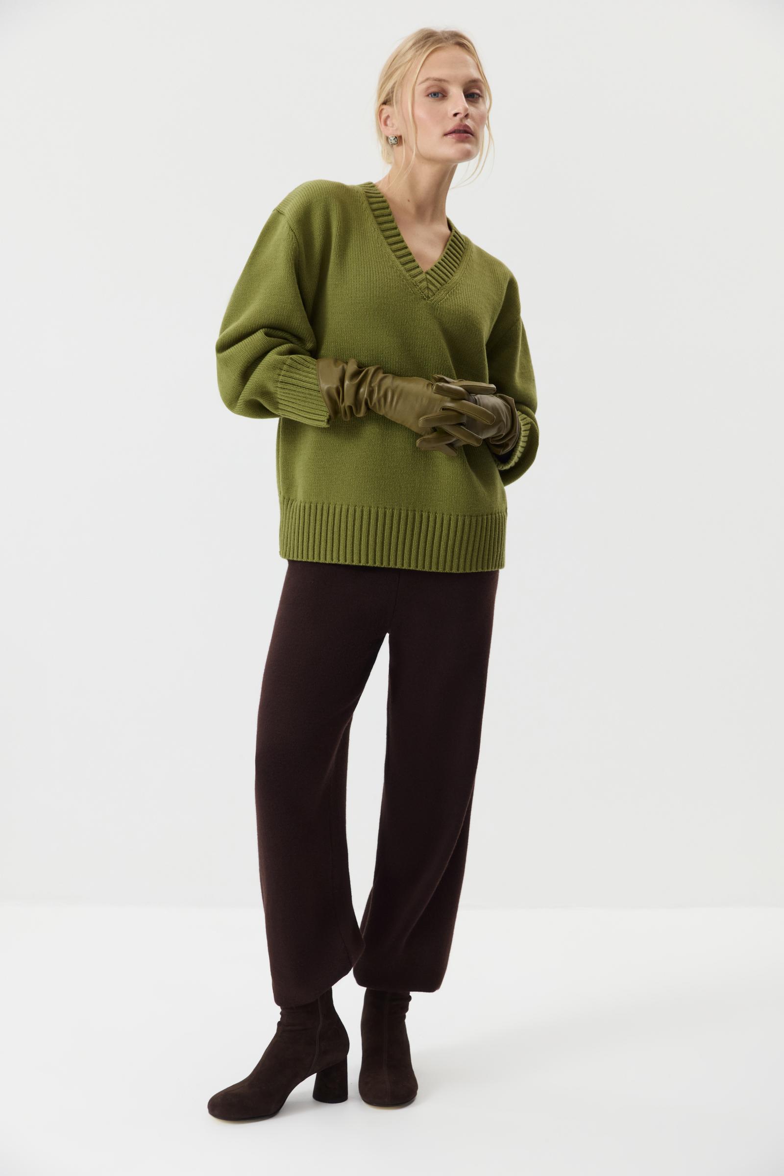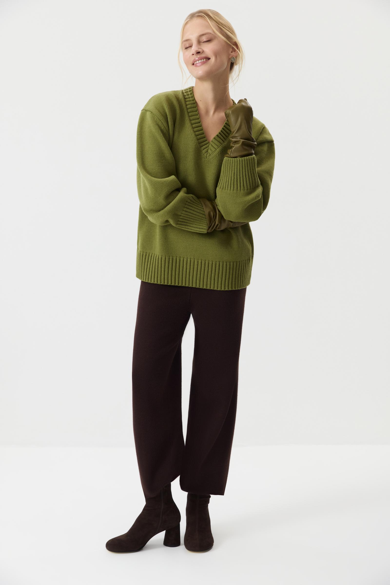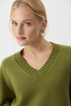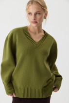 Джемпер с V-образным вырезом станет вашим верным спутником в холодное время года, обеспечивая тепло и стиль одновременно. Выполнен из пряжи с добавлением шерсти, что обеспечивает мягкость, тепло и эластичность материала. Модель отличается прямым кроем, высокими манжетами, округлой формой рукава и спущенной линией плеча. V-образный вырез подчеркивает линию шеи и делает образ более женственным.