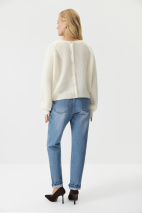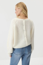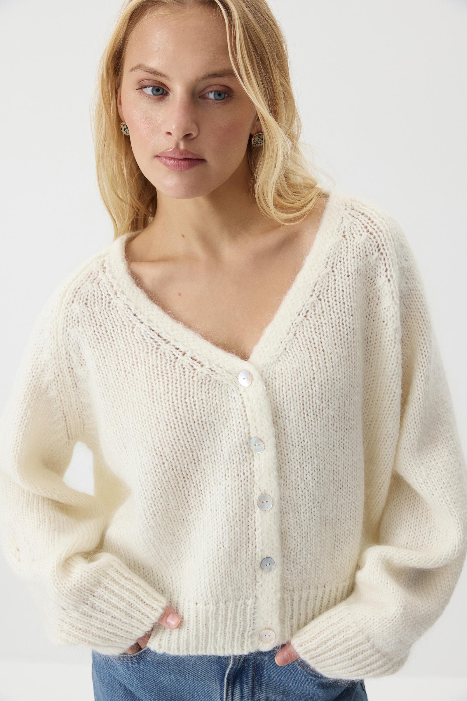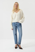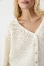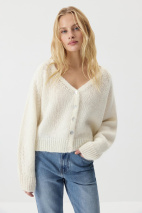Кардиган из мягкой пушистой пряжи свободного кроя с V-образным вырезом. Длинный рукав с широким манжетом по низу. Низ изделия выполнен с эластичной резинкой, что образует аккуратный силуэт. Отличительной деталью изделия является возможность носить его любой стороной. Обе планки на кардигане функциональные, а горловины разные. С одной стороны V-образная горловина, а с другой круглая. Застежка на пуговицы ракушки.