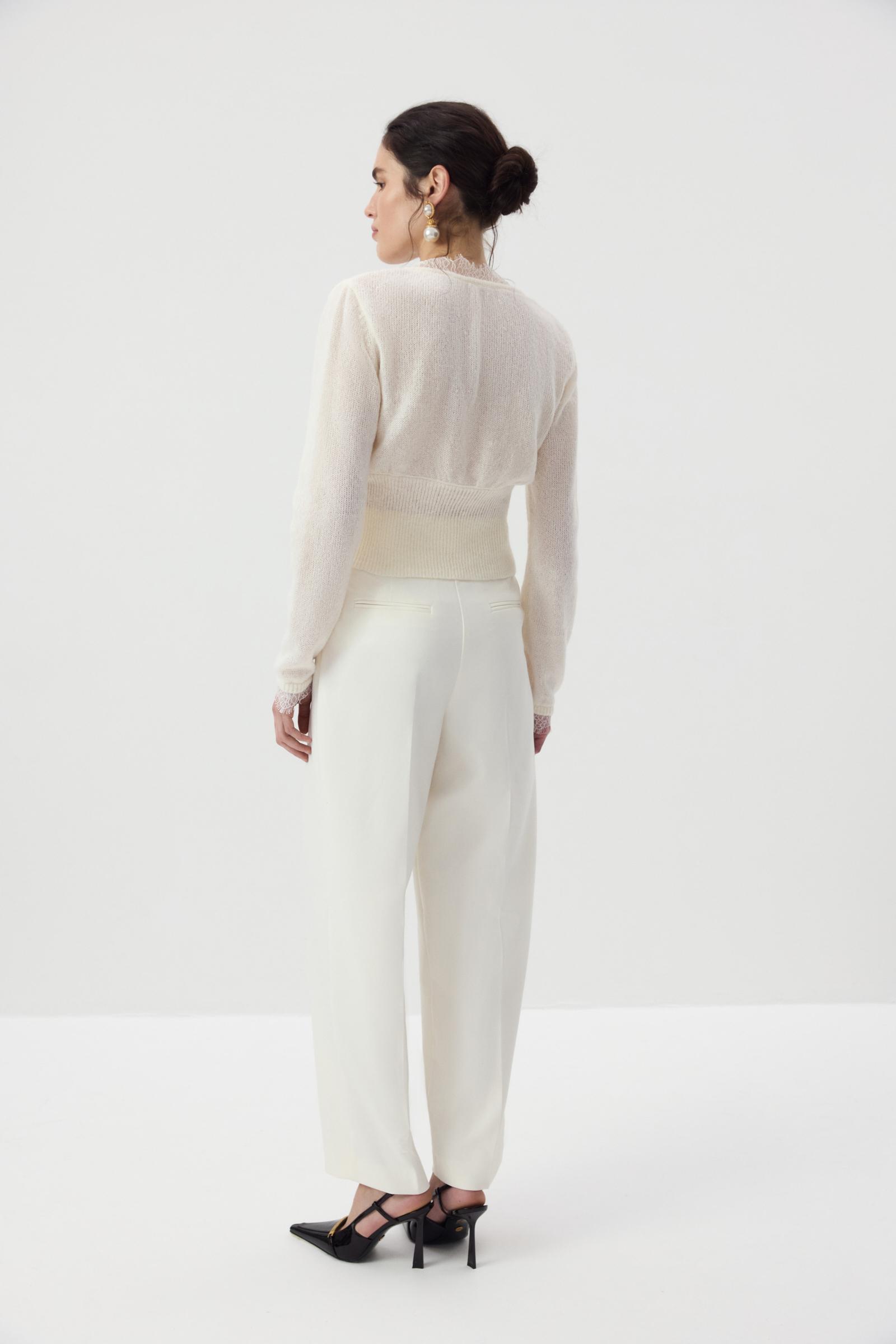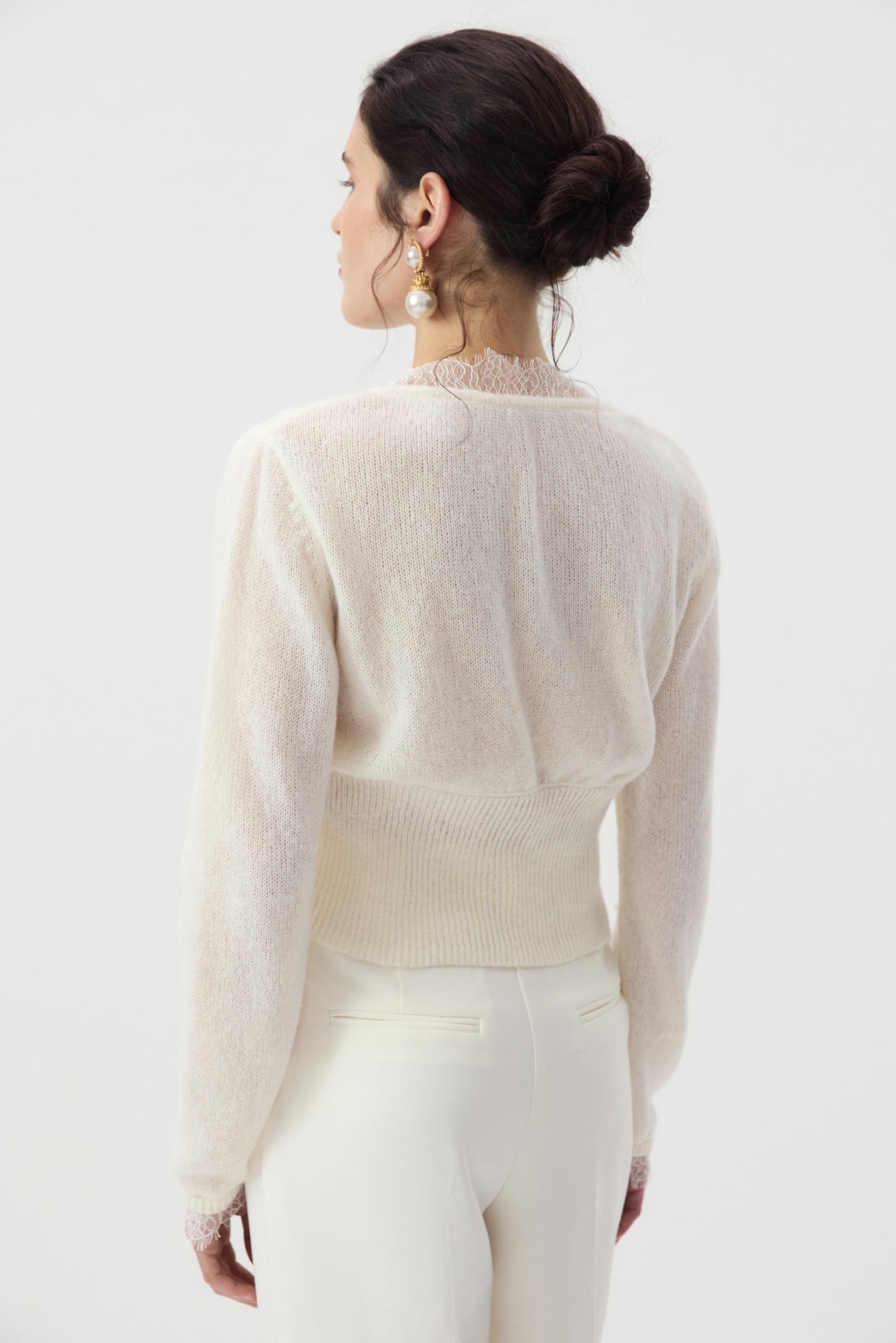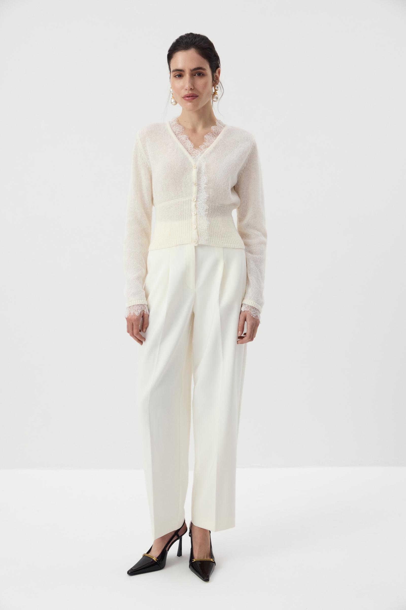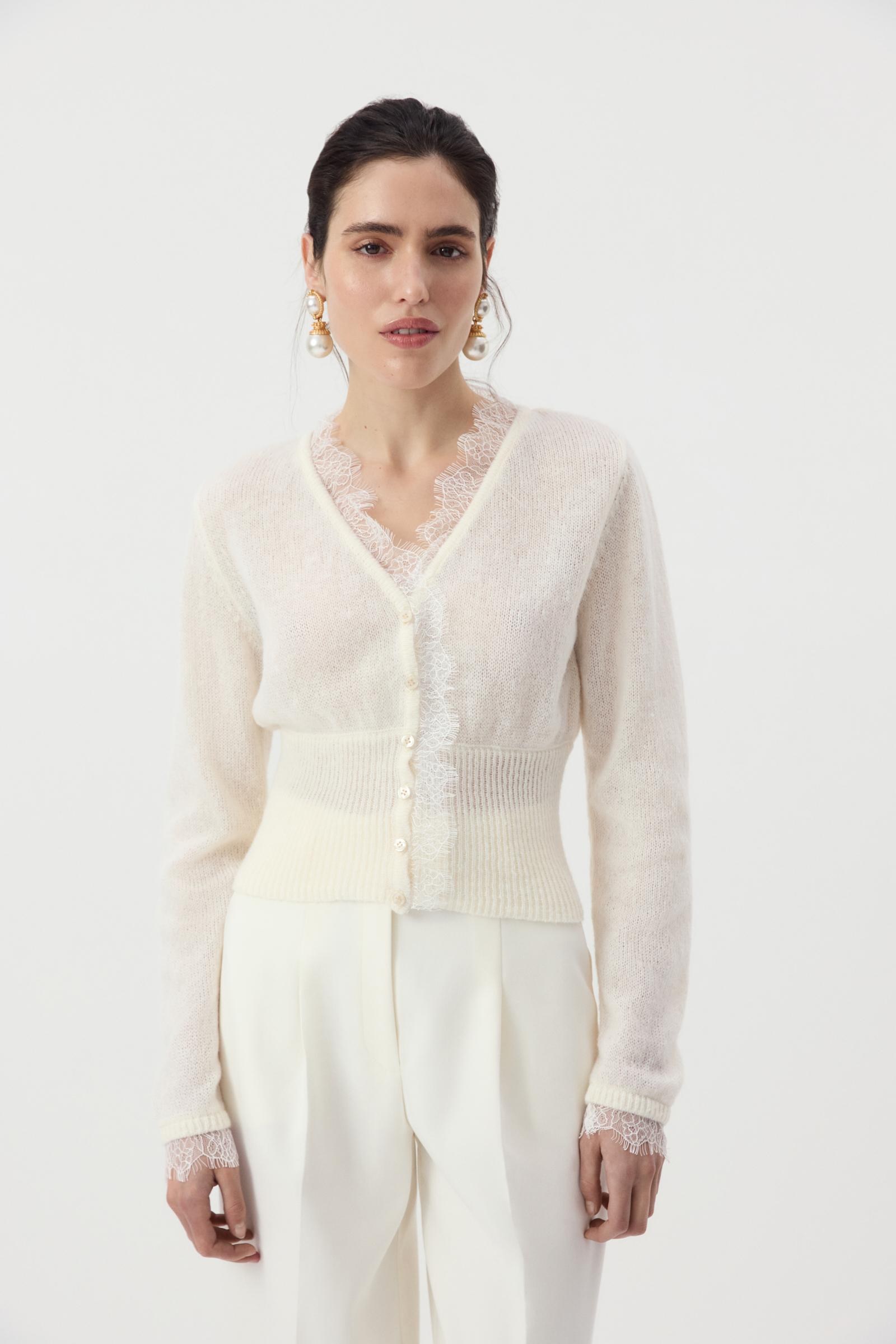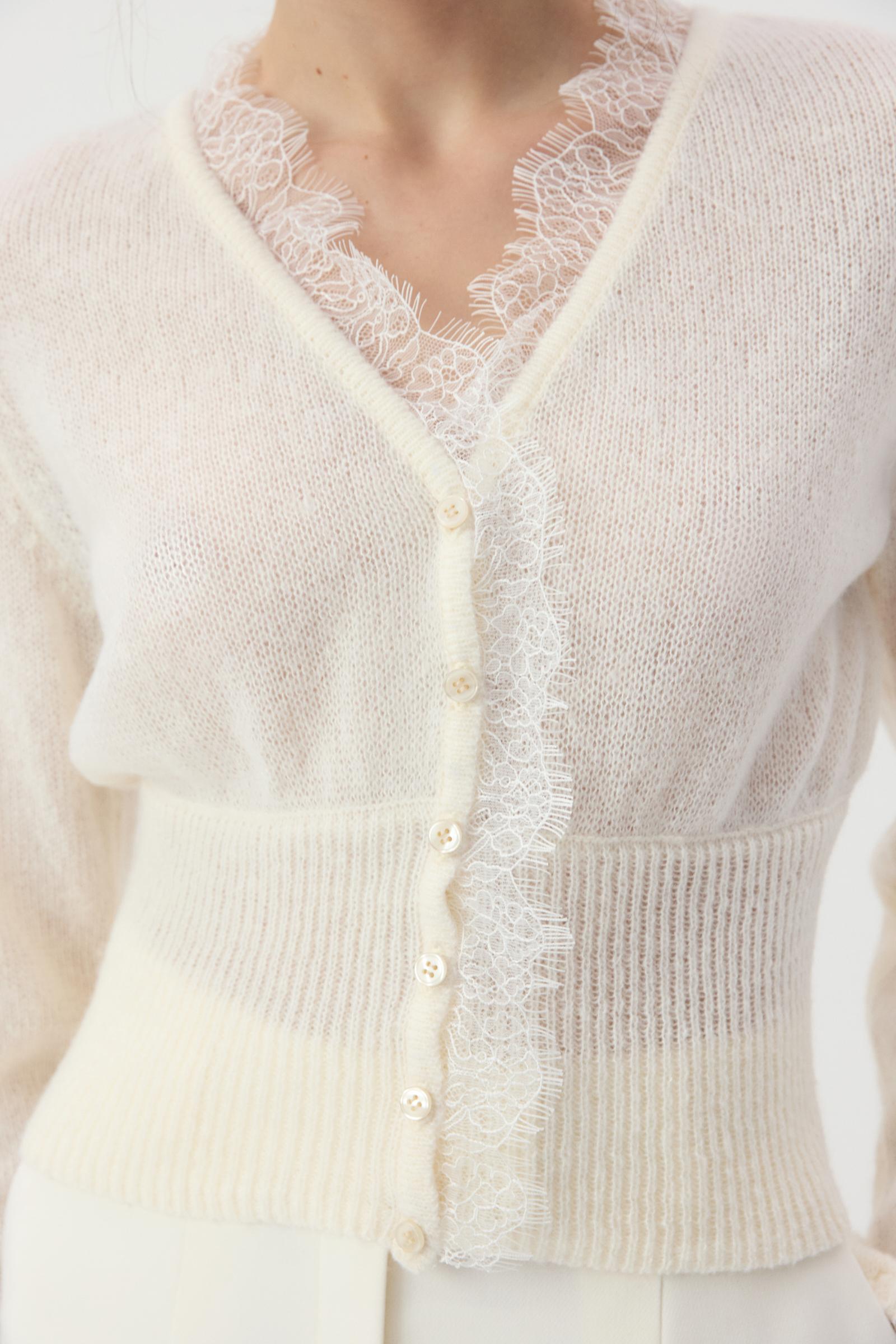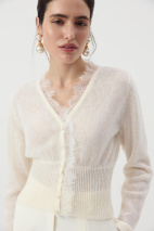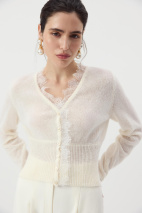 Кардиган из легкой мягкой пряжи с V-вырезом, приталенного силуэта, благодаря широкому рибу по линии низа. Изделие дополнено глубоким V- вырезом, декорировано нежной кружевной отделкой, которая подчеркивает изящный образ. Застежка на петли и пуговицы.
