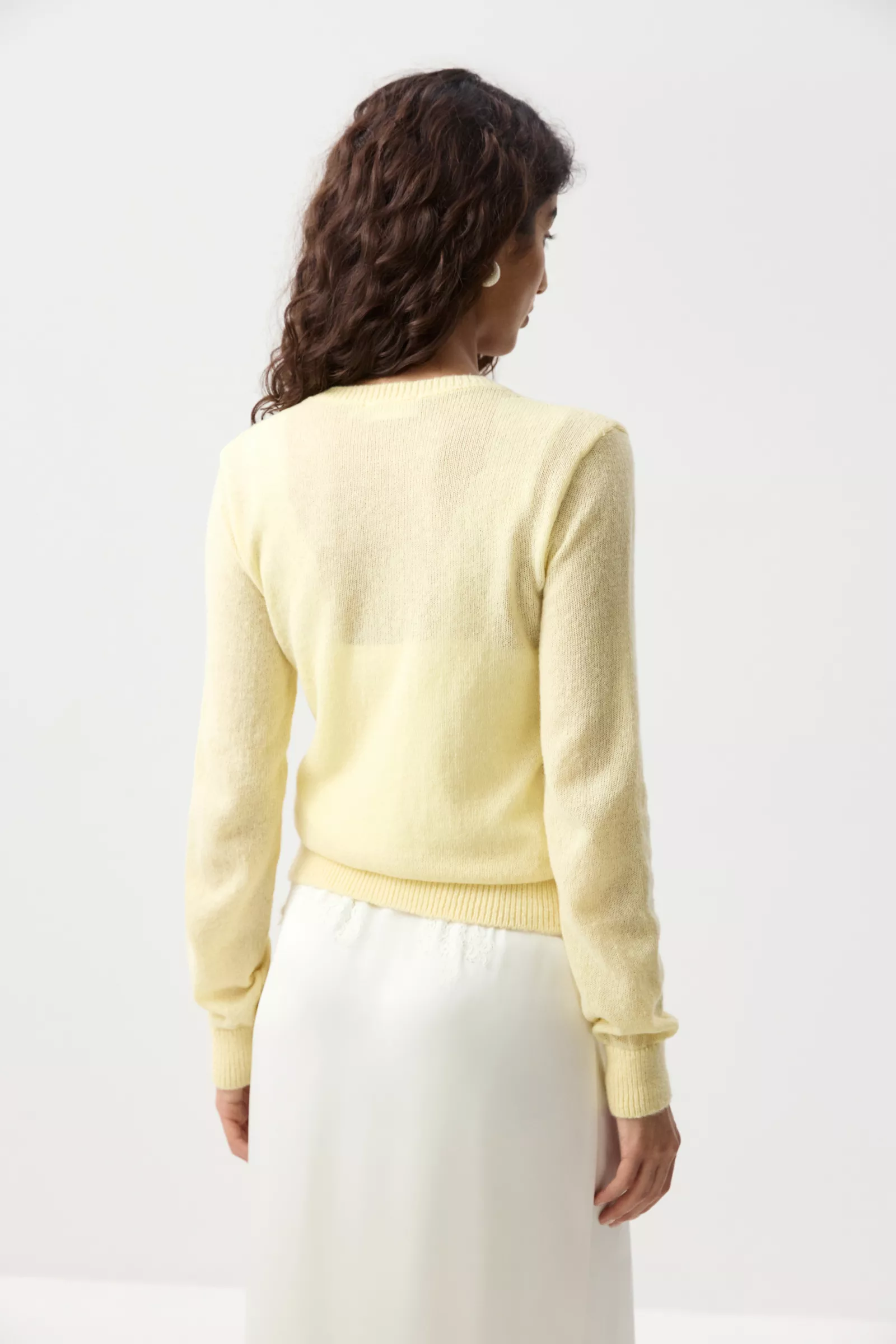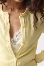 Легкий и аккуратный базовый кардиган — втачные рукава, риб по краям, классический силуэт. Связан мелкими петлями из пряжи, в составе которой 10% мохера. Такой трикотаж получается плотным и пластичным. Застегивается на петли и пуговицы по тонкой планке в тон изделия.