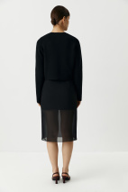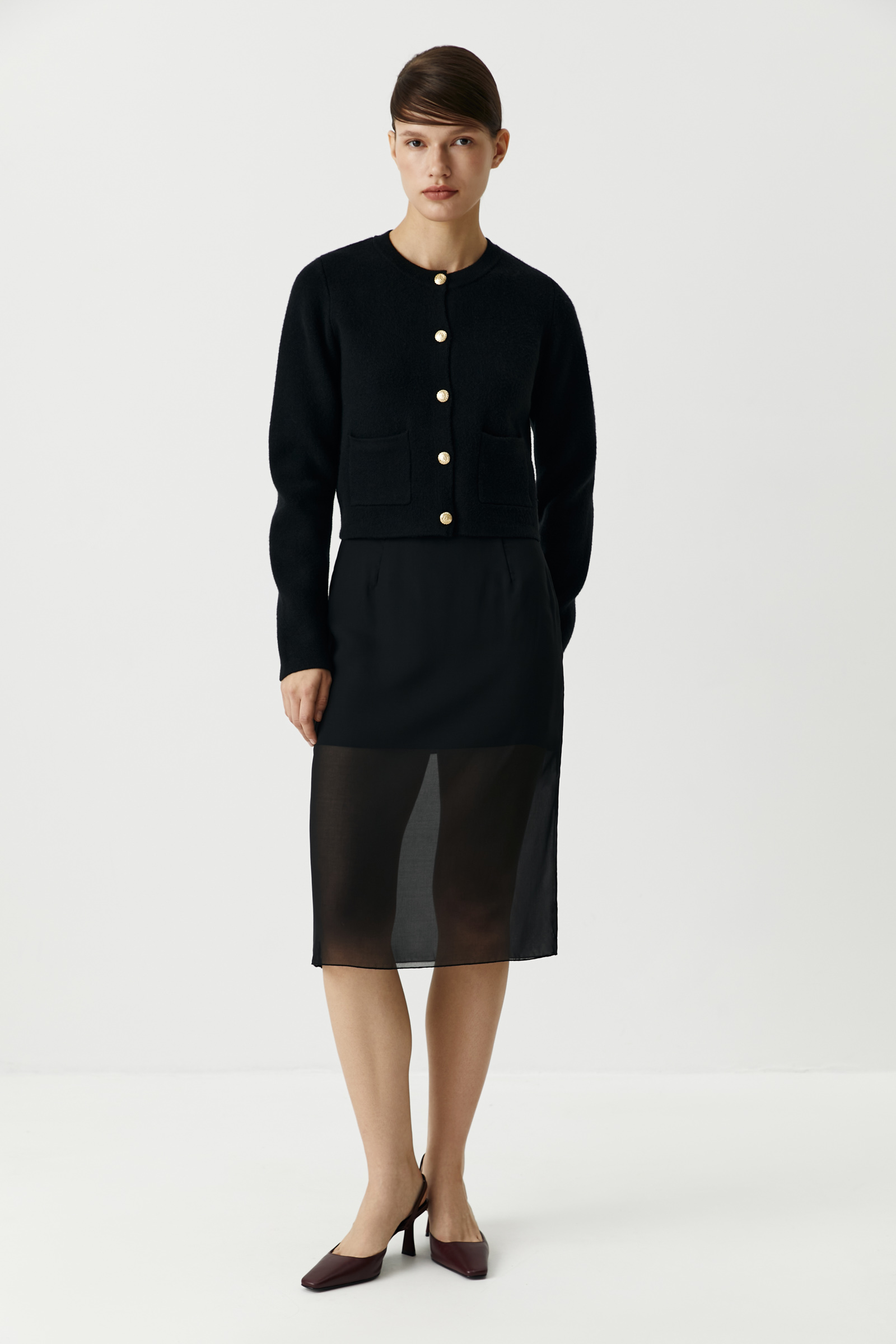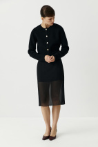 Самый легкий вариант стайлинга – носить кардиган поверх майки с брюками палаццо. Для более интересных образов добавьте кофту с длинным рукавом, юбку из сатина длины миди или мини юбку базовых оттенков. Дополняйте образы обувью на невысоком каблуке, а с похолоданием присмотритесь к высоким сапогам или ботинкам.