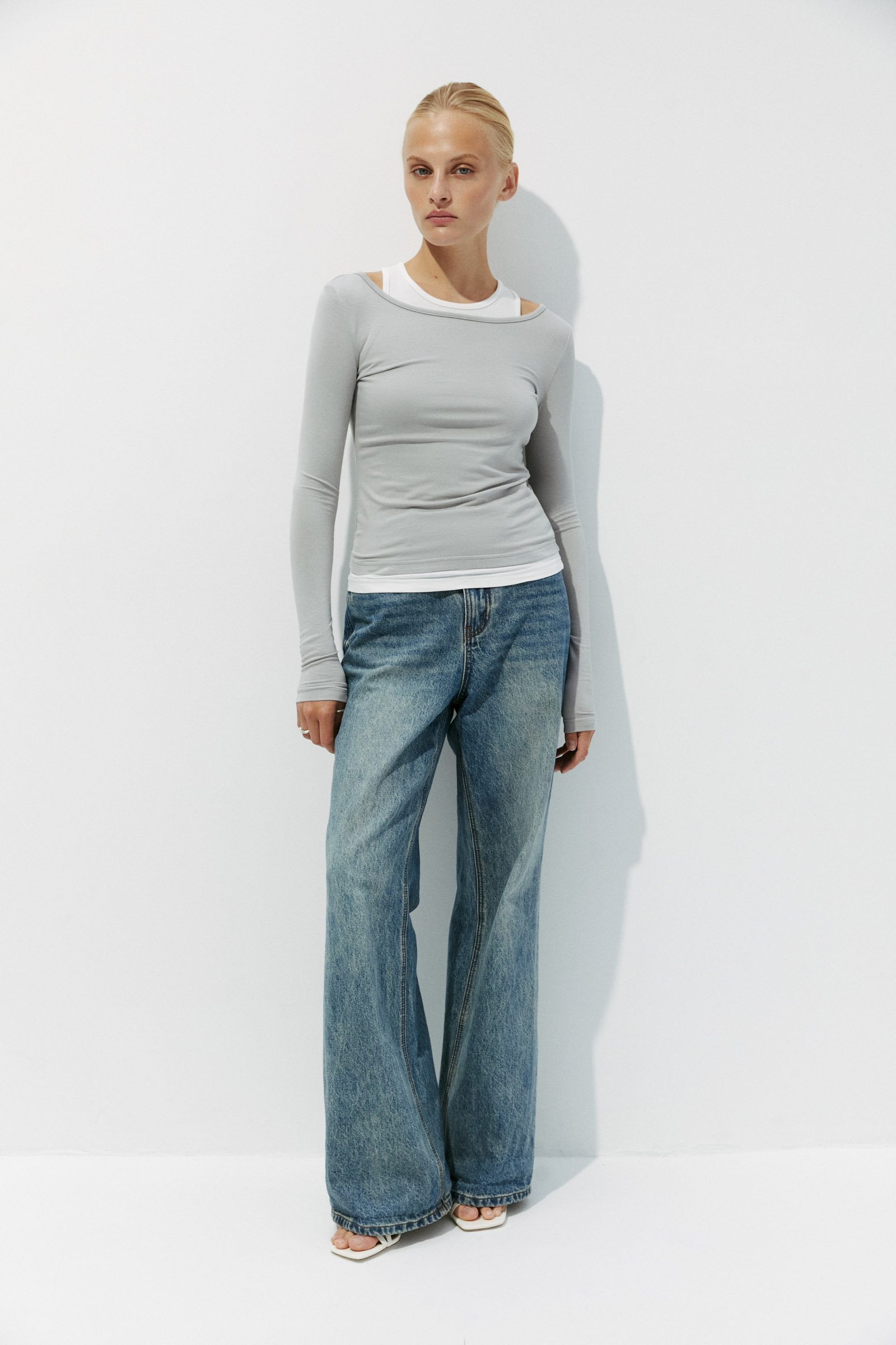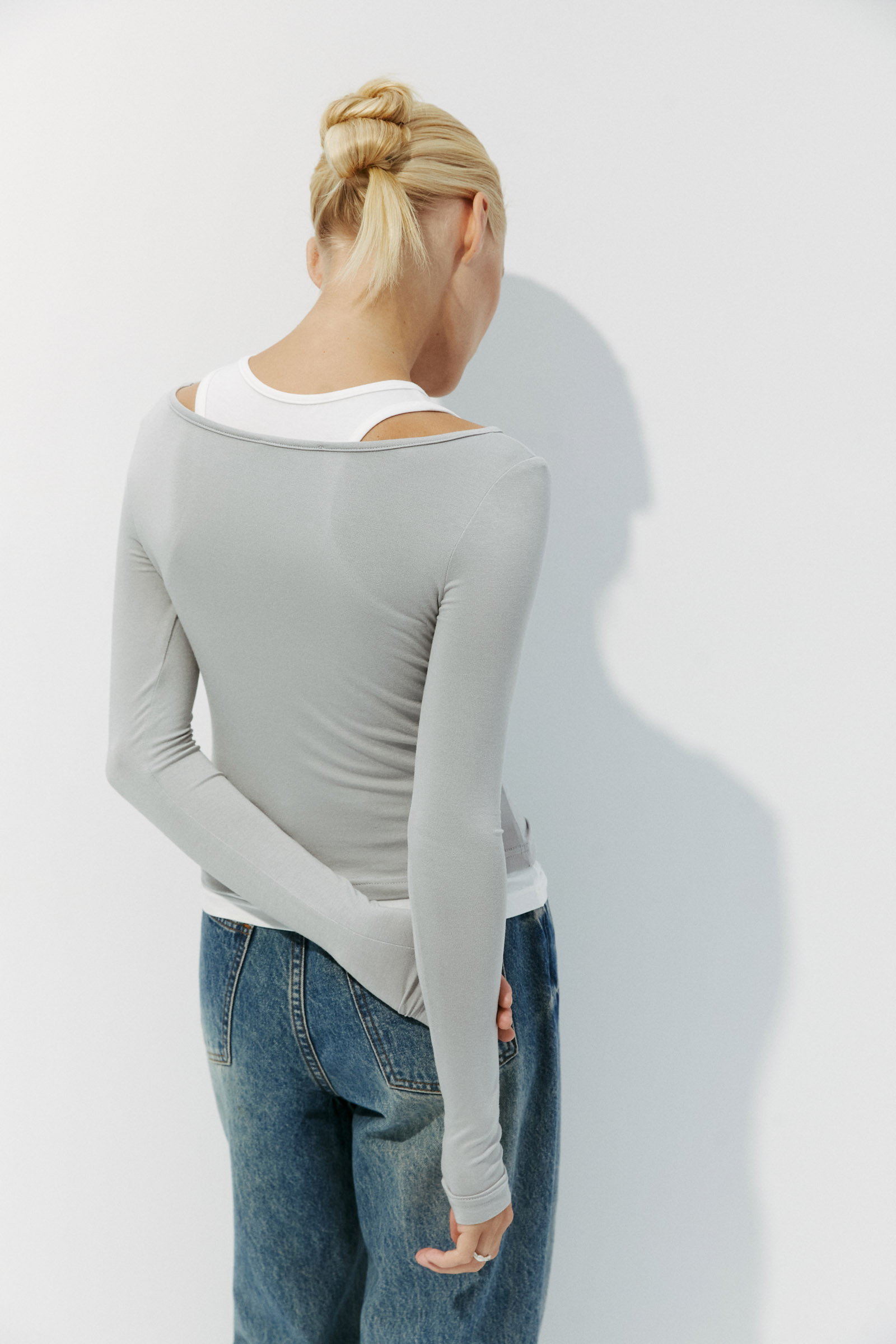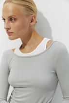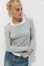 Двуслойный лонгслив в облегающем силуэте. Модель выполнена как комбинация майки с зауженным горлом и лонгслива с длинным рукавом. Несмотря на составную часть, изделие комфортно в носке. Кроеный трикотаж приятен к телу.
