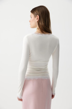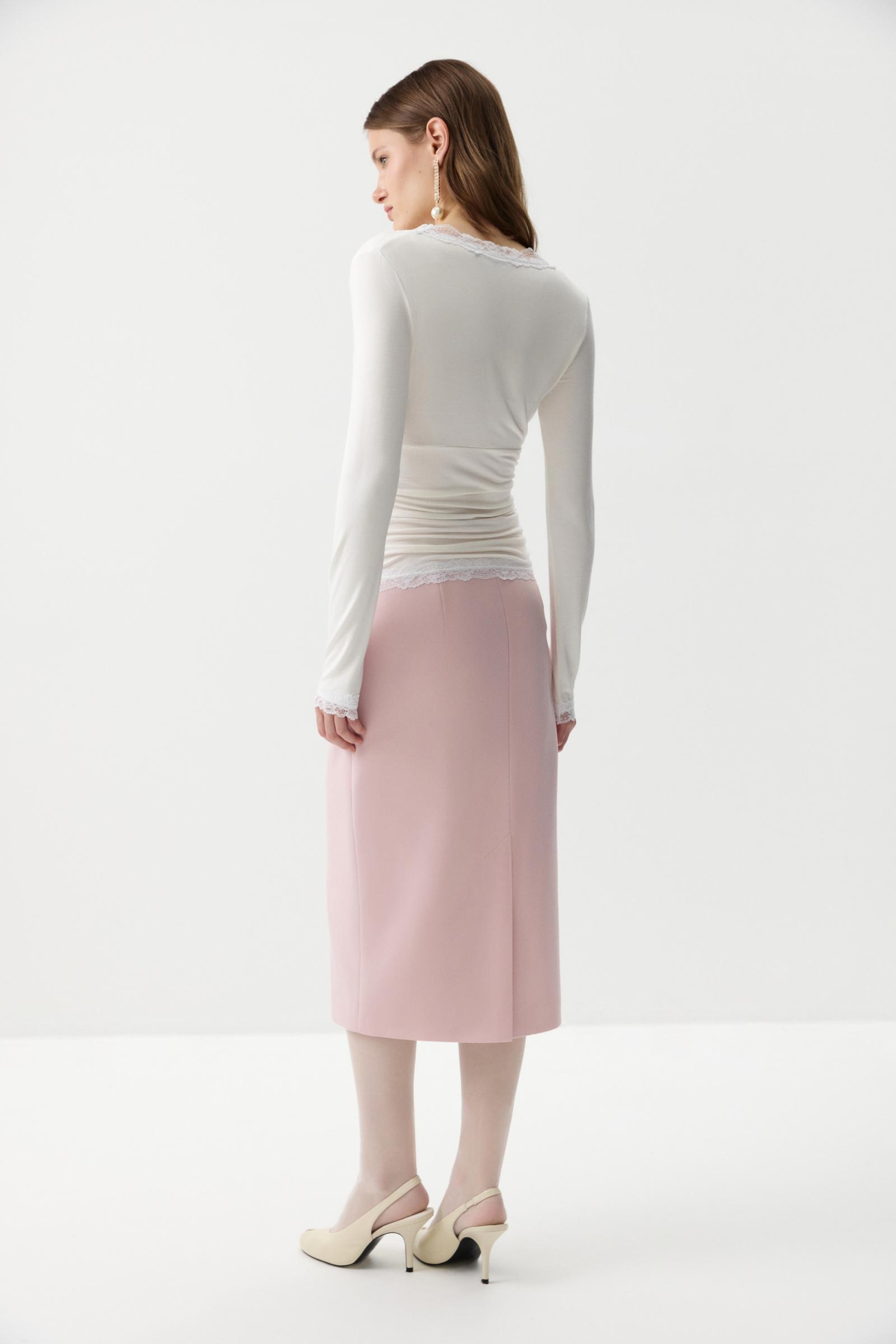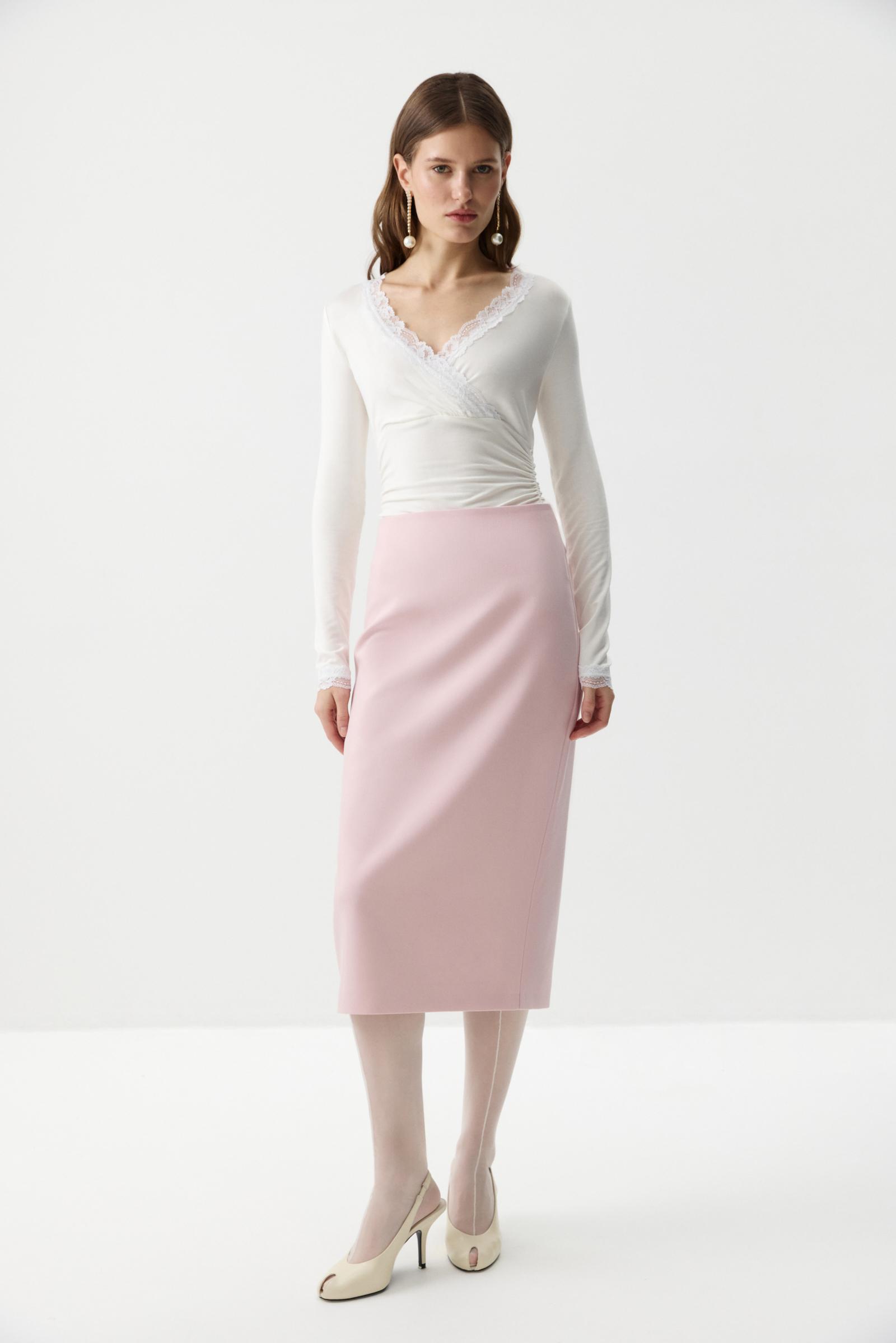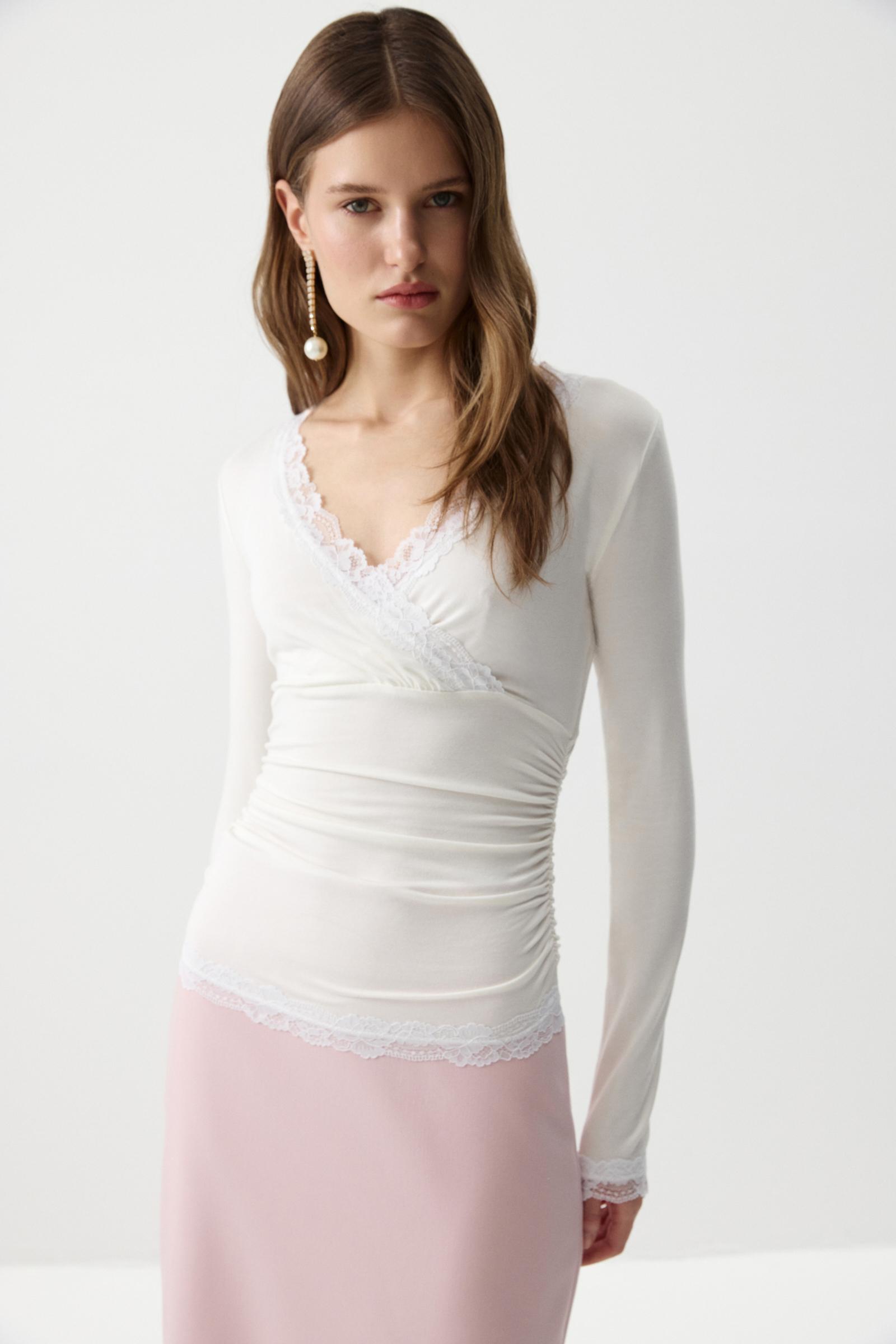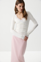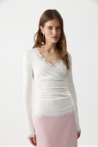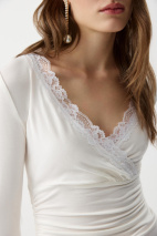 Лонгслив на запáх с кружевом- женственная и элегантная модель из мягкого вискозного трикотажа. V-образный вырез, обработанный кружевом, подчеркивает линию декольте, а отрезная линию под грудью формирует аккуратный силуэт. По боковым швам аккуратная сборка. По низу изделия и низу рукавов кружево.