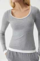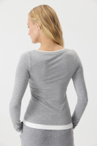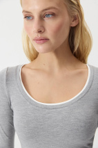Базовый лонгслив из вискозы с длинным рукавом. Изделие облегающего силуэта садится точно по фигуре. Акцент создают контрастные детали имитирующие многослойность и круглая горловина. Лонгслив разработан из приятной к телу вискозной трикотажной ткани.