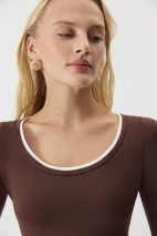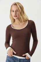 Базовый лонгслив из вискозы с длинным рукавом. Изделие облегающего силуэта садится точно по фигуре. Акцент создают контрастные детали имитирующие многослойность и круглая горловина. Лонгслив разработан из приятной к телу вискозной трикотажной ткани.