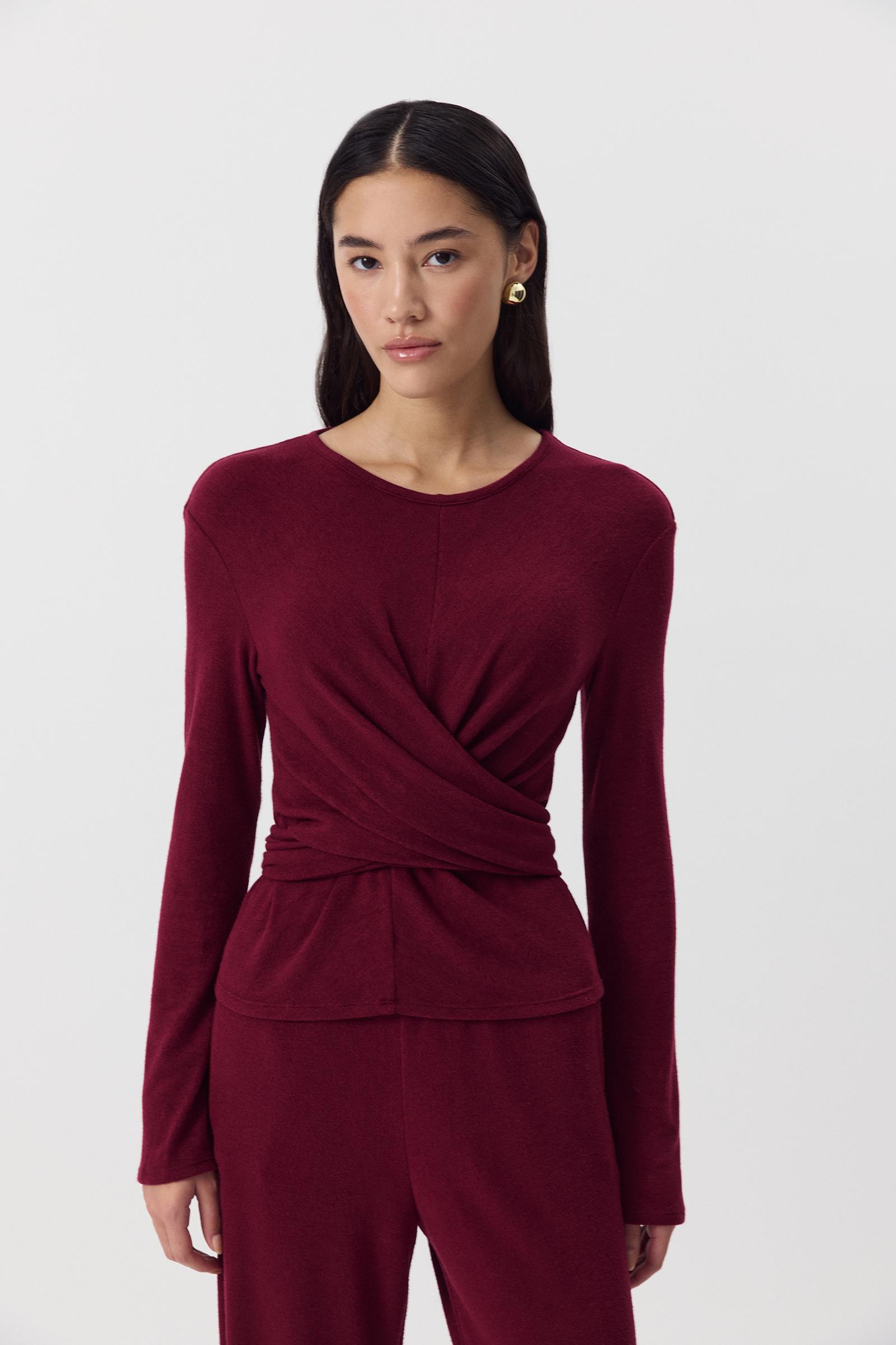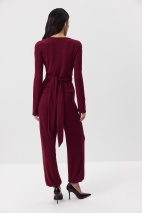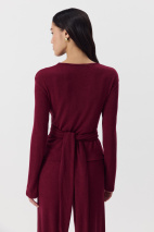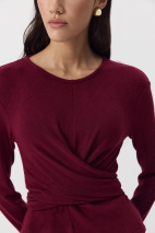 Лонгслив из мягкого свитерного трикотажа. Лонгслив с длинным рукавом и горловиной лодка. По линии талии пояс создающий приталенный силуэт и формирующий акцентную драпировку по переду драпировка, переходящая в удлиненный пояс с возможностью завязать спереди и сзади.