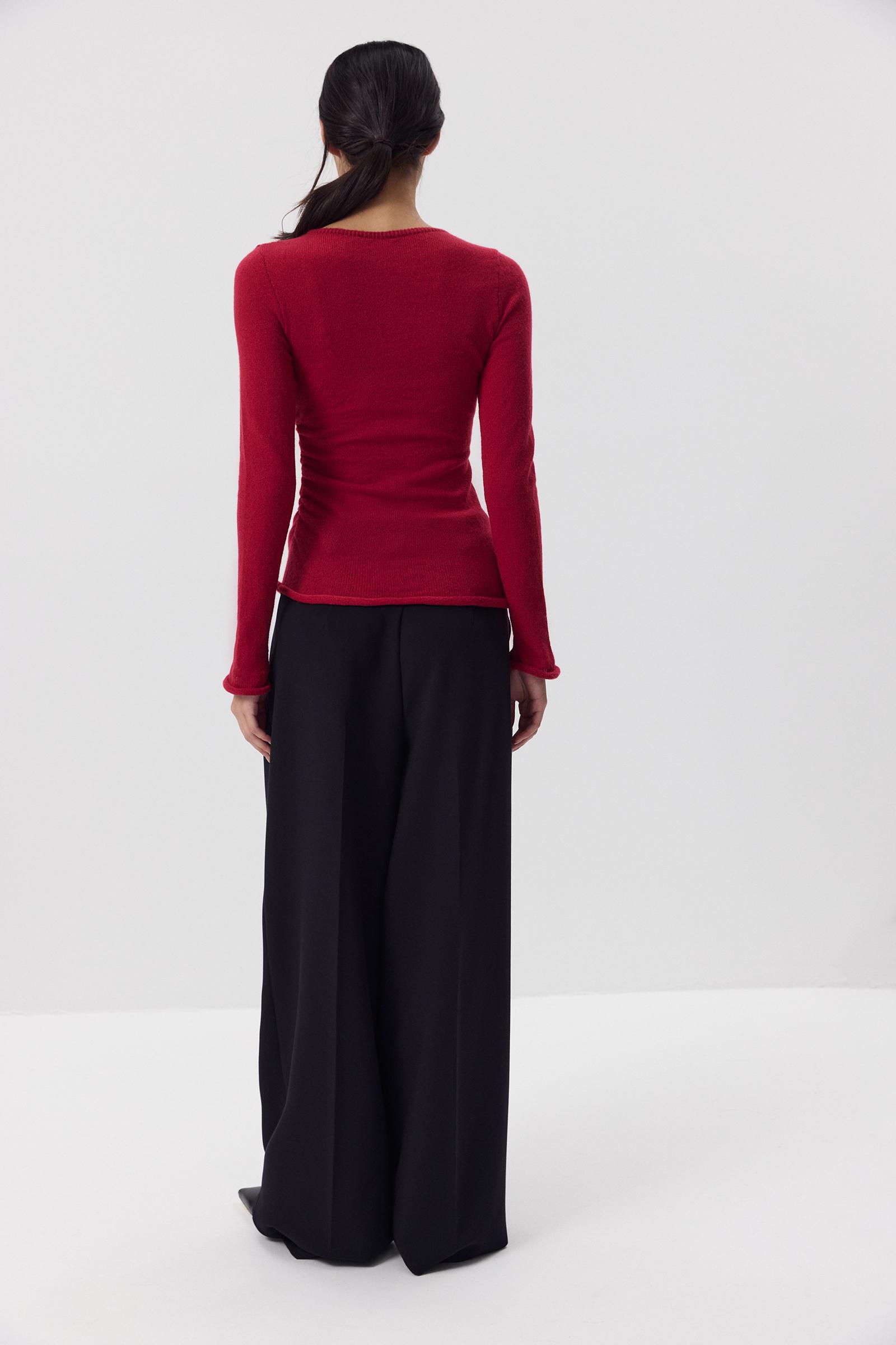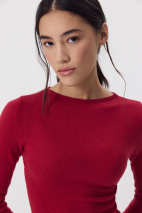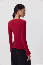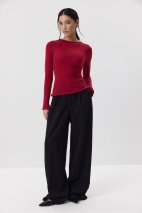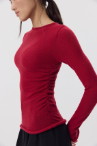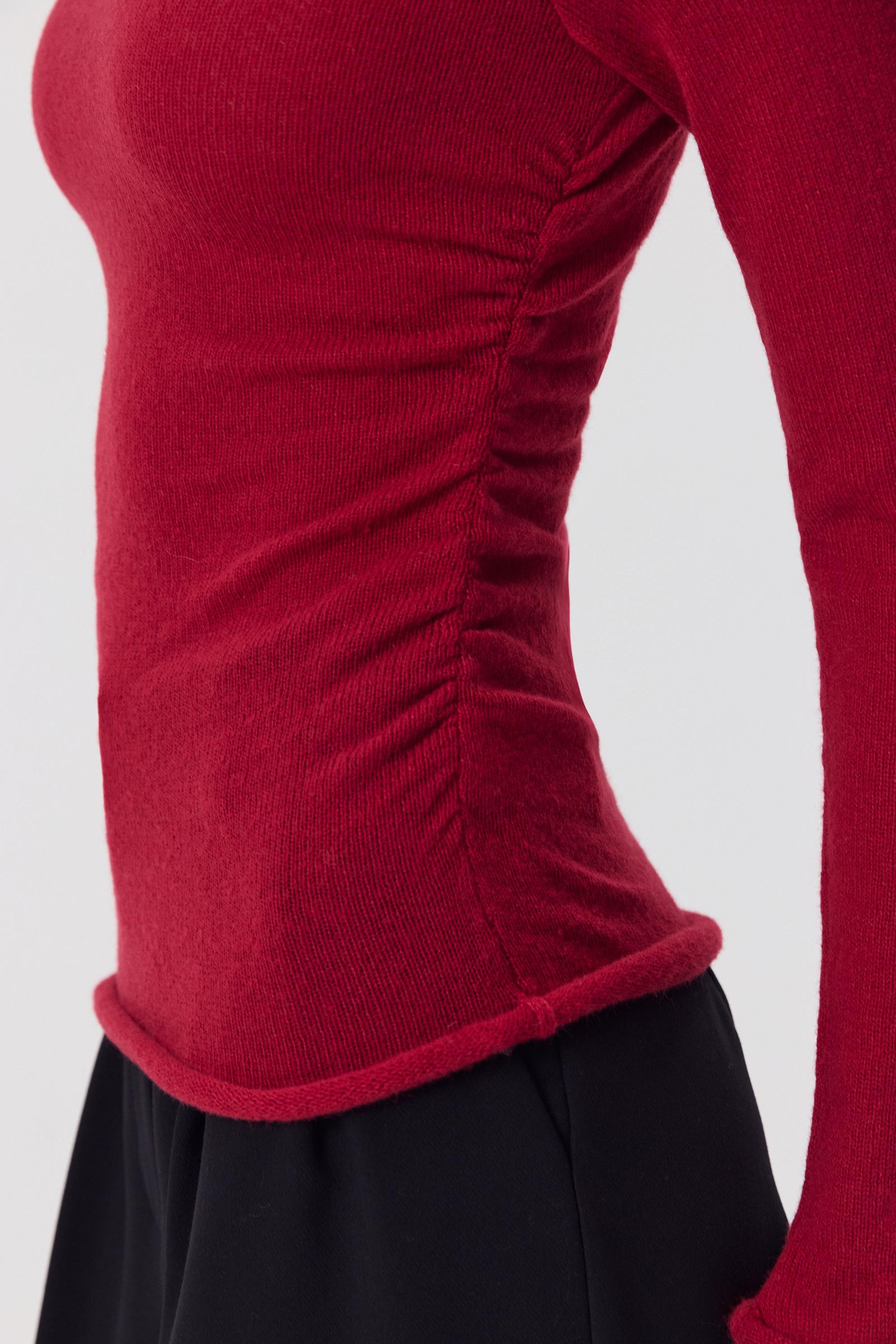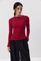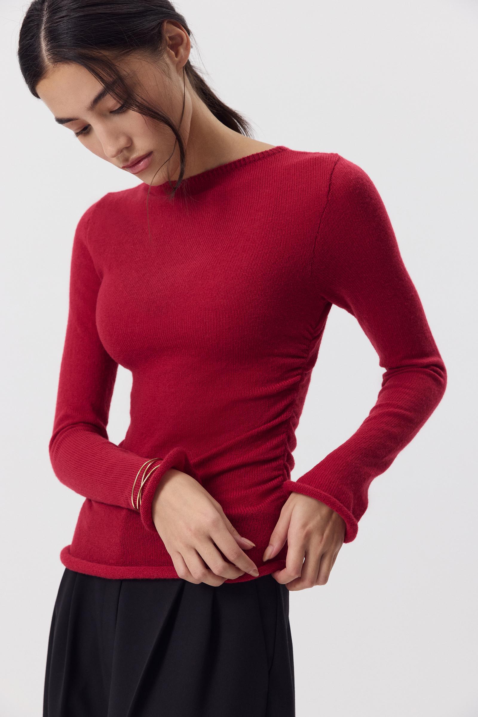 Женственный и элегантный лонгслив из мягкой пряжи со сборкой. Плотная и эластичная вязка комфортно прилегает к фигуре и создает изящный силуэт, а сборка по боковому шву добавляет акцент на линию талии. Изделие с длинным рукавом и круглой горловиной.