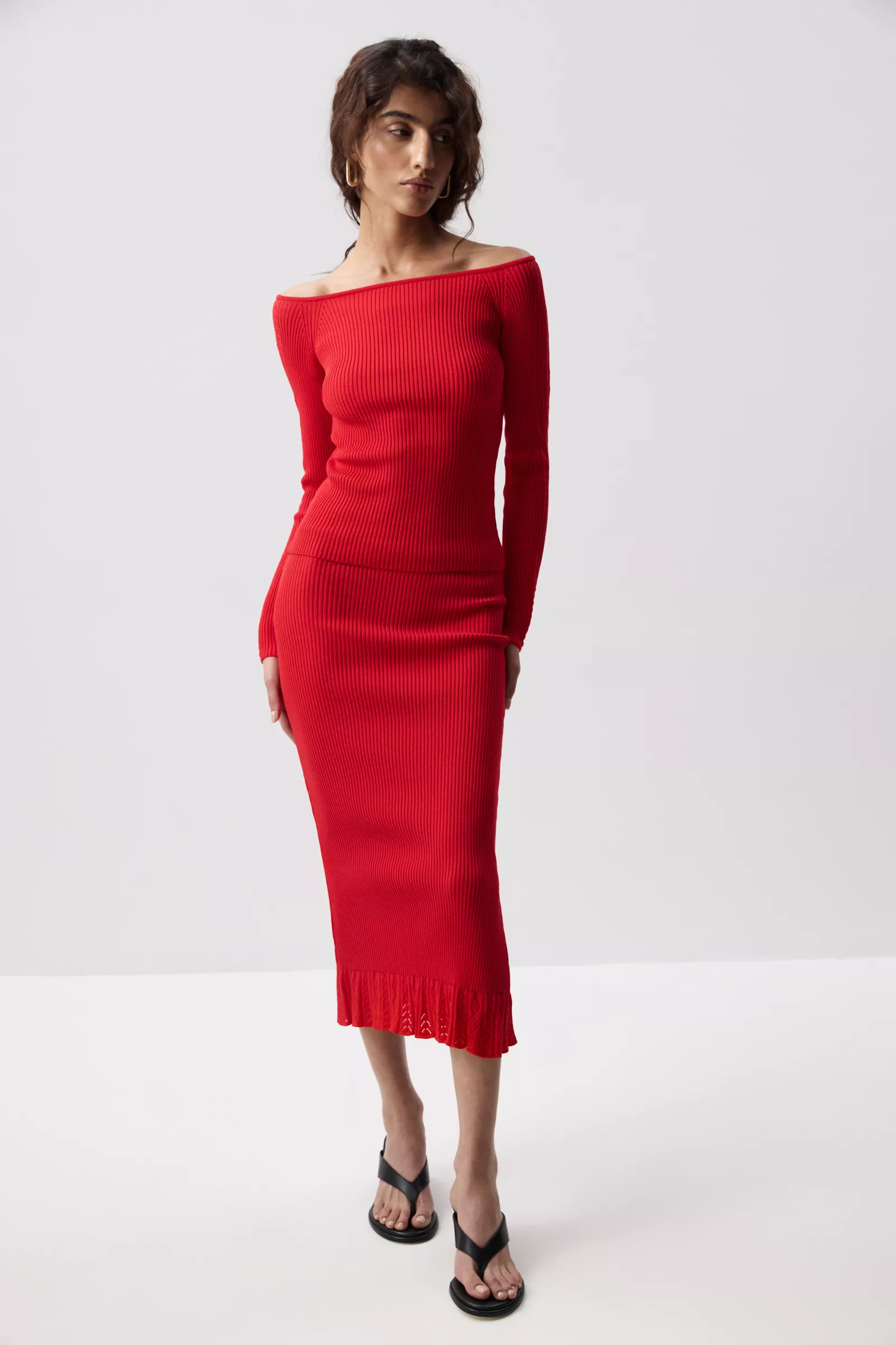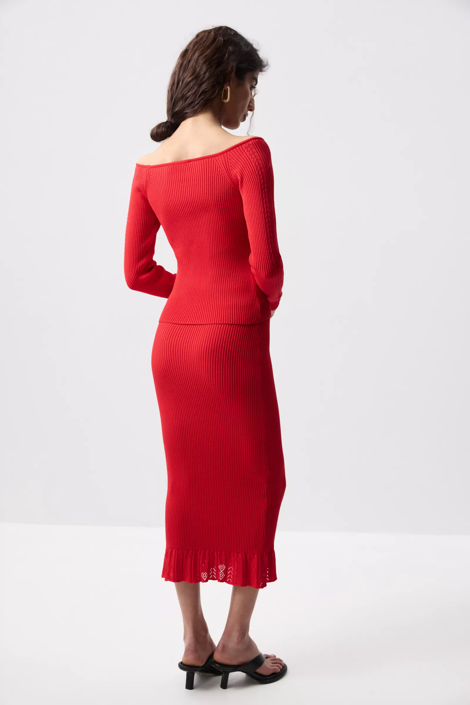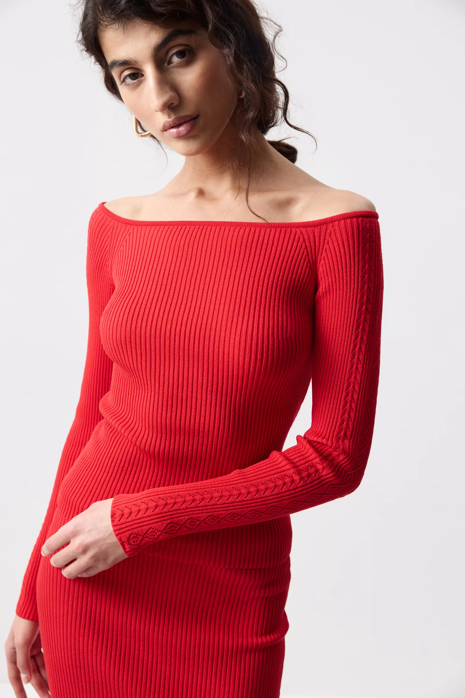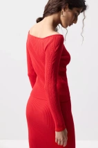 Вязаный лонгслив со спущенной линией плеча из пряжи с вискозой в составе. Приталенная посадка создаёт ощущение комфорта, аккуратно драпируясь по фигуре. Главный акцент — ажурная вязка по рукавам, которая добавляет образу деликатной выразительности. Она придаёт модели лёгкое романтичное настроение и делает её более интересной за счёт игры фактур.