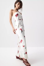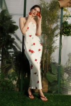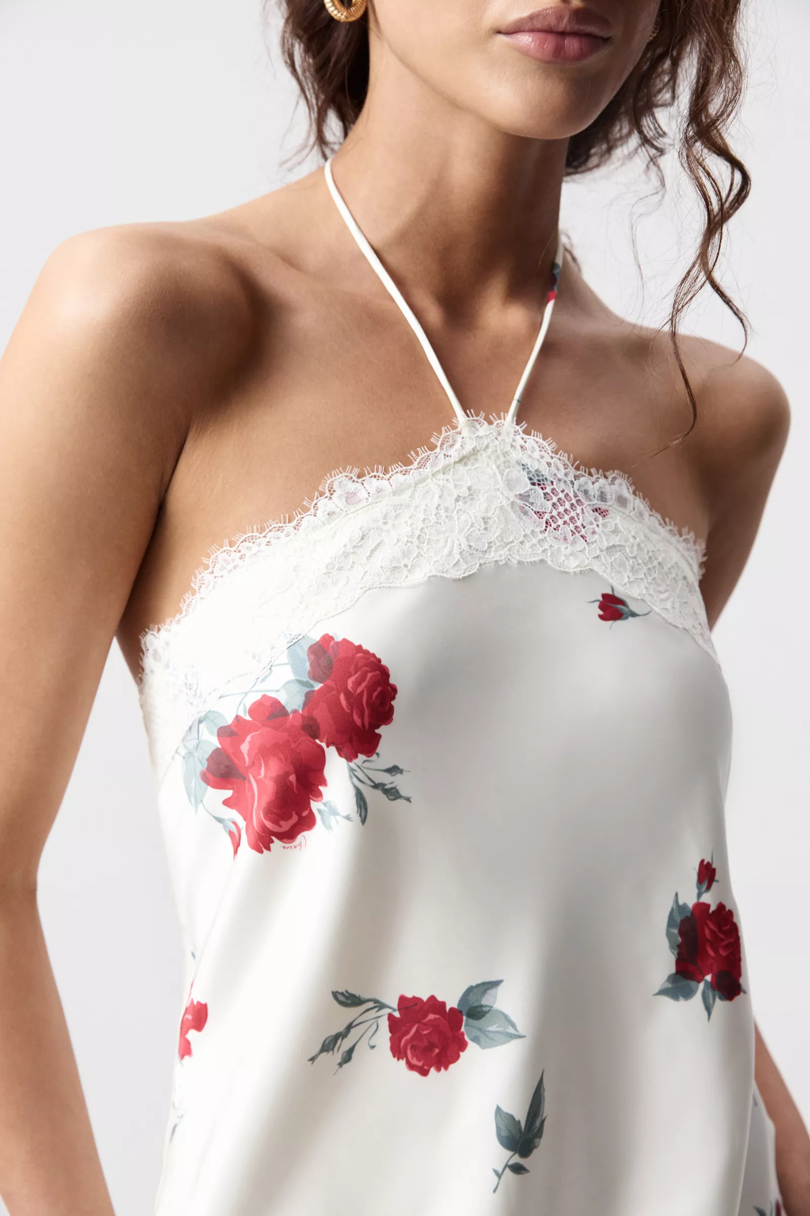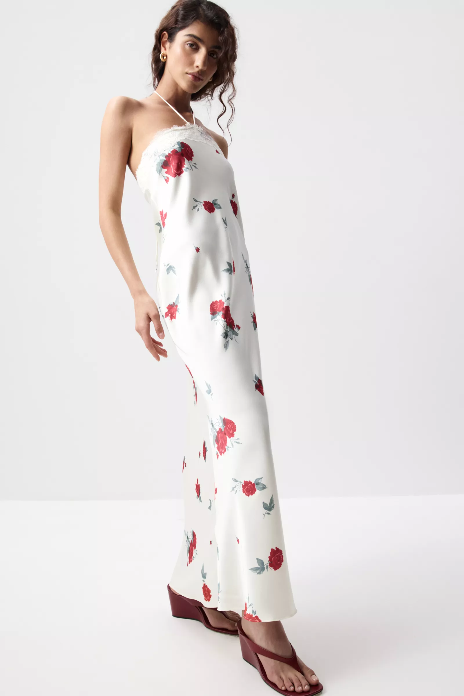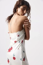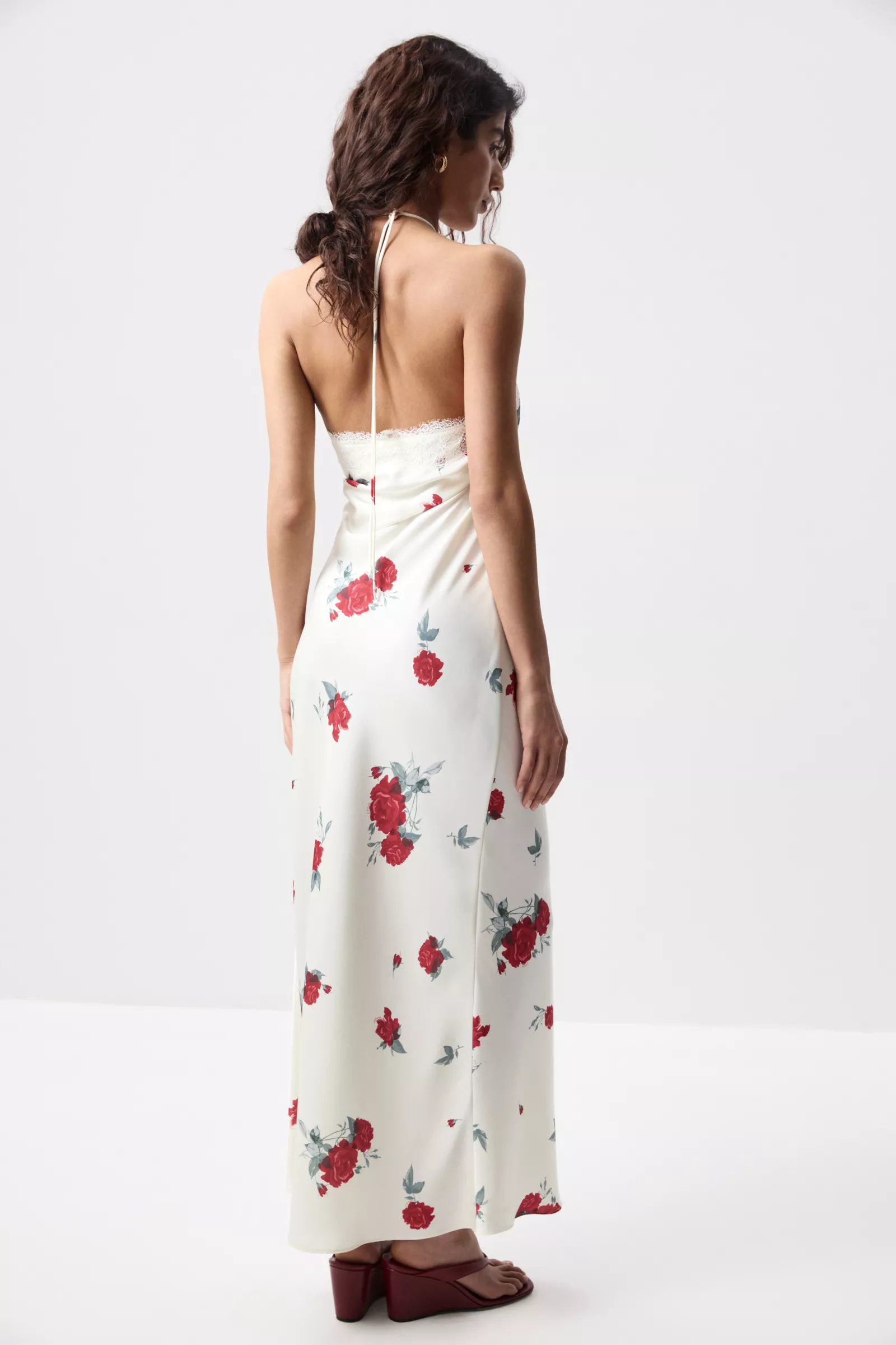 Сатиновое миди платье - утончённая модель, которая мягко повторяет линии тела и создаёт идеально струящийся силуэт, благодаря крою по косой. Бретели на шее в стиле халтер изящно открывает плечи и линию спины, добавляя образу чувственности и элегантности. Верх платья дополнен кружевной отделкой - выразительный акцент. Застежка на потайную молнию в боковом шве.