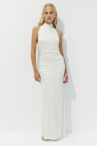 Облегающее макси платье с воротником халтер. Акцентом модели является воротник и эффектная открытая спина. Струящийся трикотаж деликатно прилегает к телу, обращая внимание на линию талии. За счет слегка расклешенного низа, модель очень удобна в носке. Большей выразительности платью добавляет драпировка по талии.