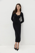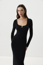 Платье из вискозного трикотажа в длине миди. Платье прилегающего силуэта с длинным рукавом. Глубокое декольте подчеркивает линию ключиц, а декоративный элемент в виде золотой розы добавляет платью акцент.