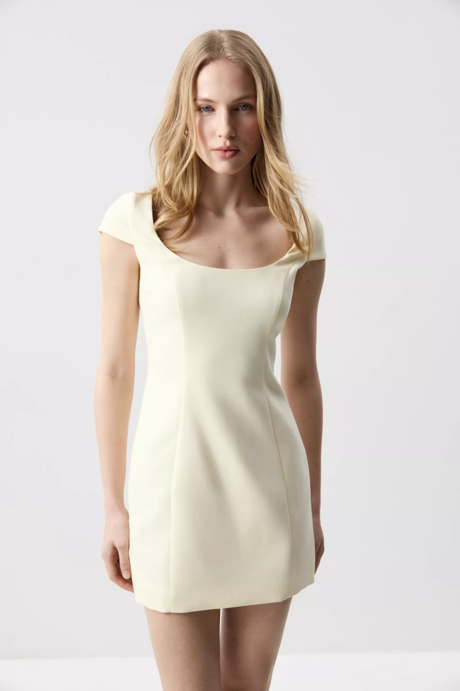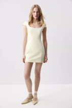 Платье мини с коротким рукавом. Платье из плотной костюмной ткани с вертикальными рельефами, подчеркивающими естественные изгибы фигуры. Короткий рукав и глубокая округлая горловина подчеркивает линию плеч и ключиц. Платье на подкладке с застежкой в среднем шве спинки.