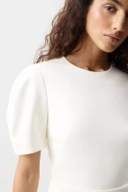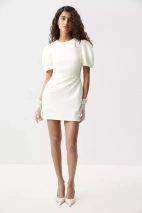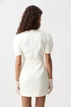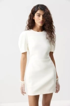 Лаконичное платье в длине мини. Платье из плотной костюмной ткани с рукавами буфами. По бедрам небольшие формообразующие накладки, которые создают акцентную линию бедер. Платье отрезное по линии талии с акцентными рукавами, на подкладке с застежкой в среднем шве спинки.