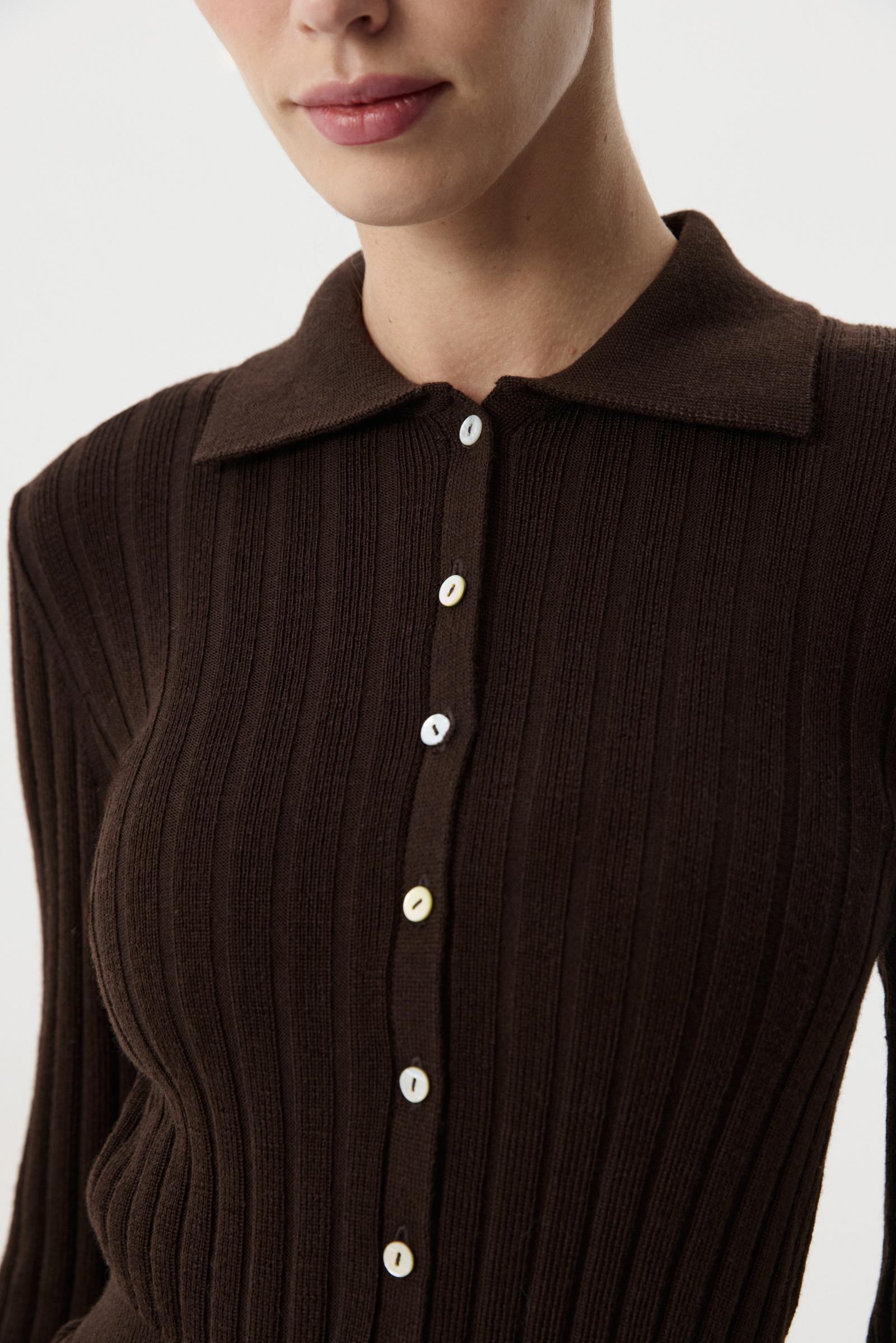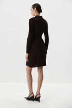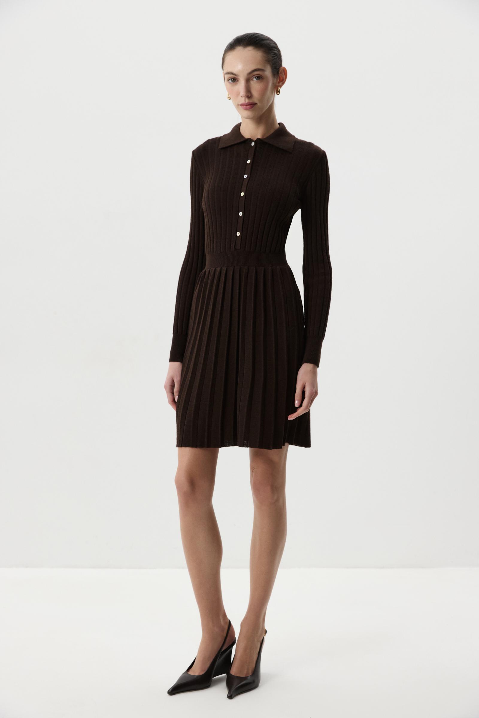 Вязанное платье- поло с мини юбкой плиссе - это стильный микс комфорта и женственности. Лаконичный верх с длинной застежкой планкой на пуговицы придает образу элегантность, а плиссированная юбка в длине мини создает изящное движение при ходьбе. Для платья была выбрана пряжа на основе шерсти мериноса.