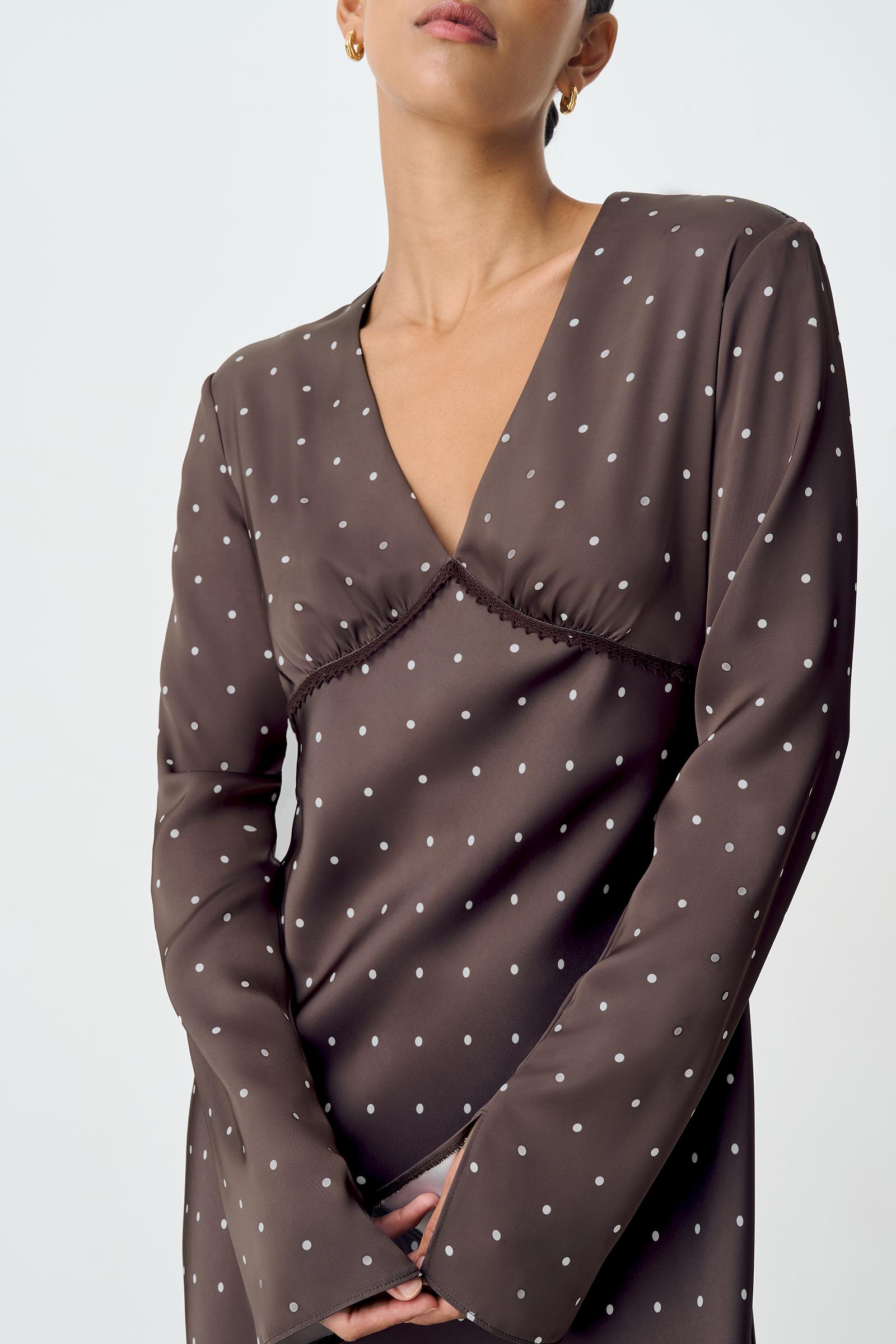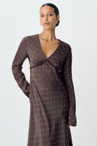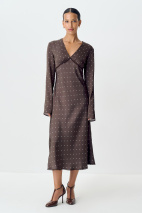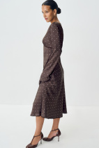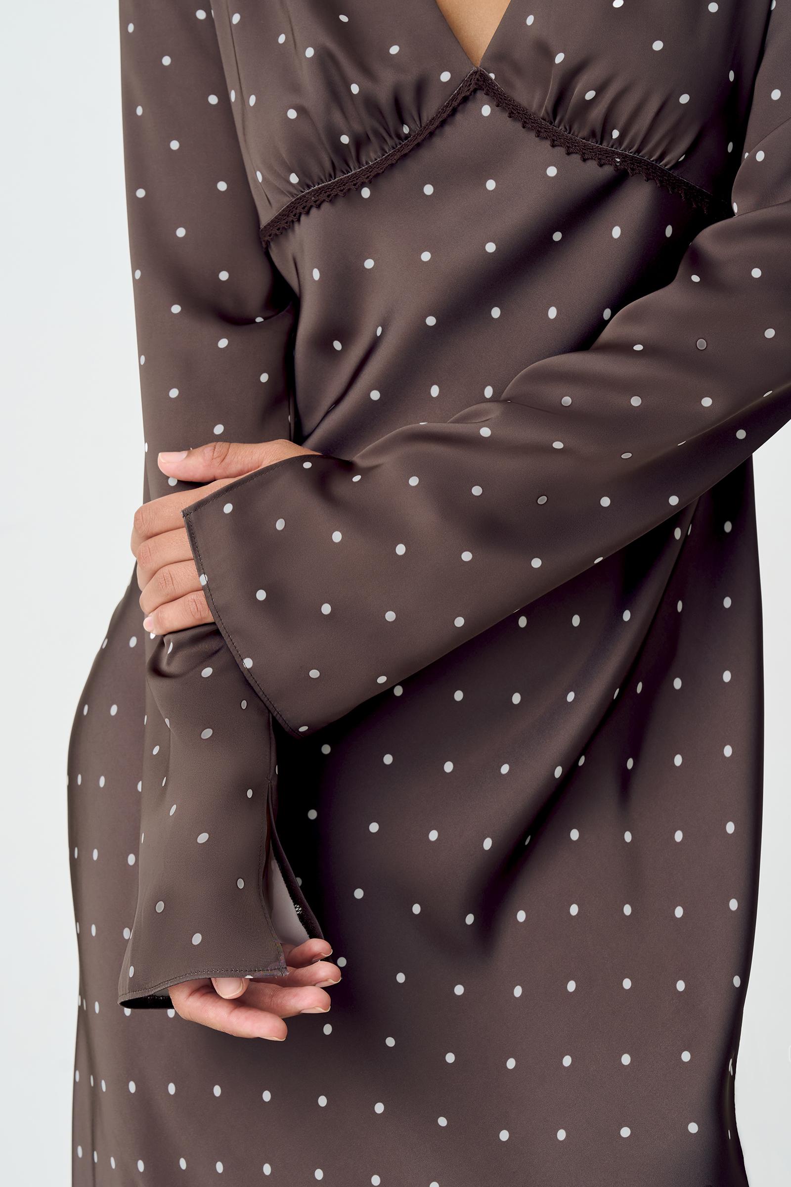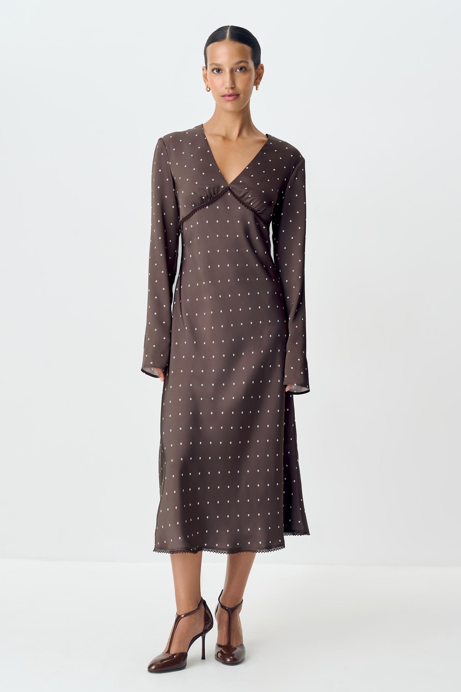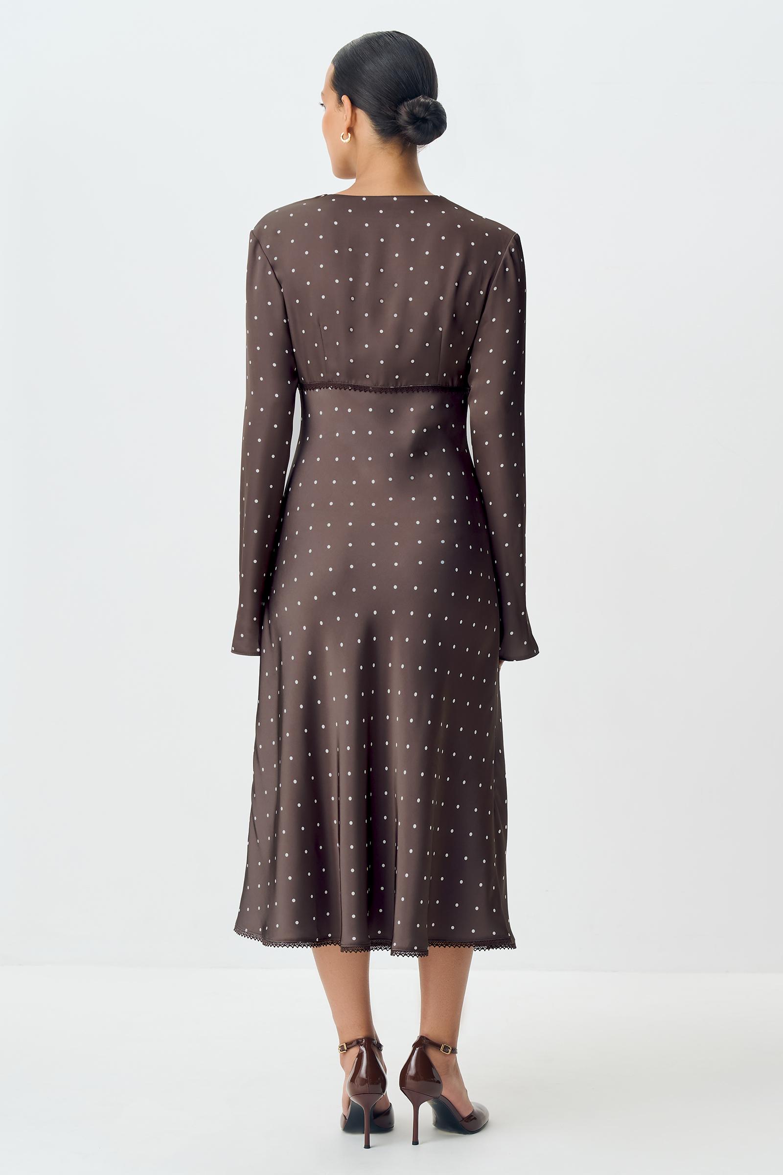 Отрезное по линии груди миди платье из мягкой струящейся ткани, с вискозой в составе. Платье с V-образным вырезом, декорированным изящным кружевом. Платье скроено по косой, что позволяет струиться по фигуре. Зауженный к низу длинный рукав с аккуратным разрезом, вместо манжета. По низу изделия лаконичная кружевная отделка.
