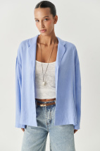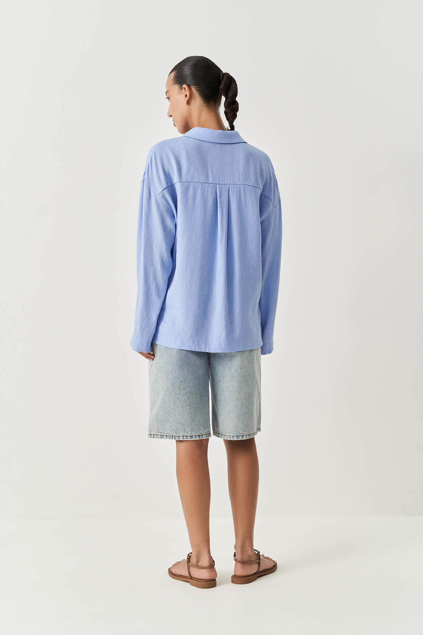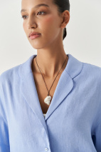 Льняная рубашка с круглыми лацканами. Рубашка- жакет с прямым рукавом, длина до линии бедер, воротник с округлыми концами. Отрезная кокетка на спинке со складкой по центру, для большего объема. Застежка на 5 пуговиц.