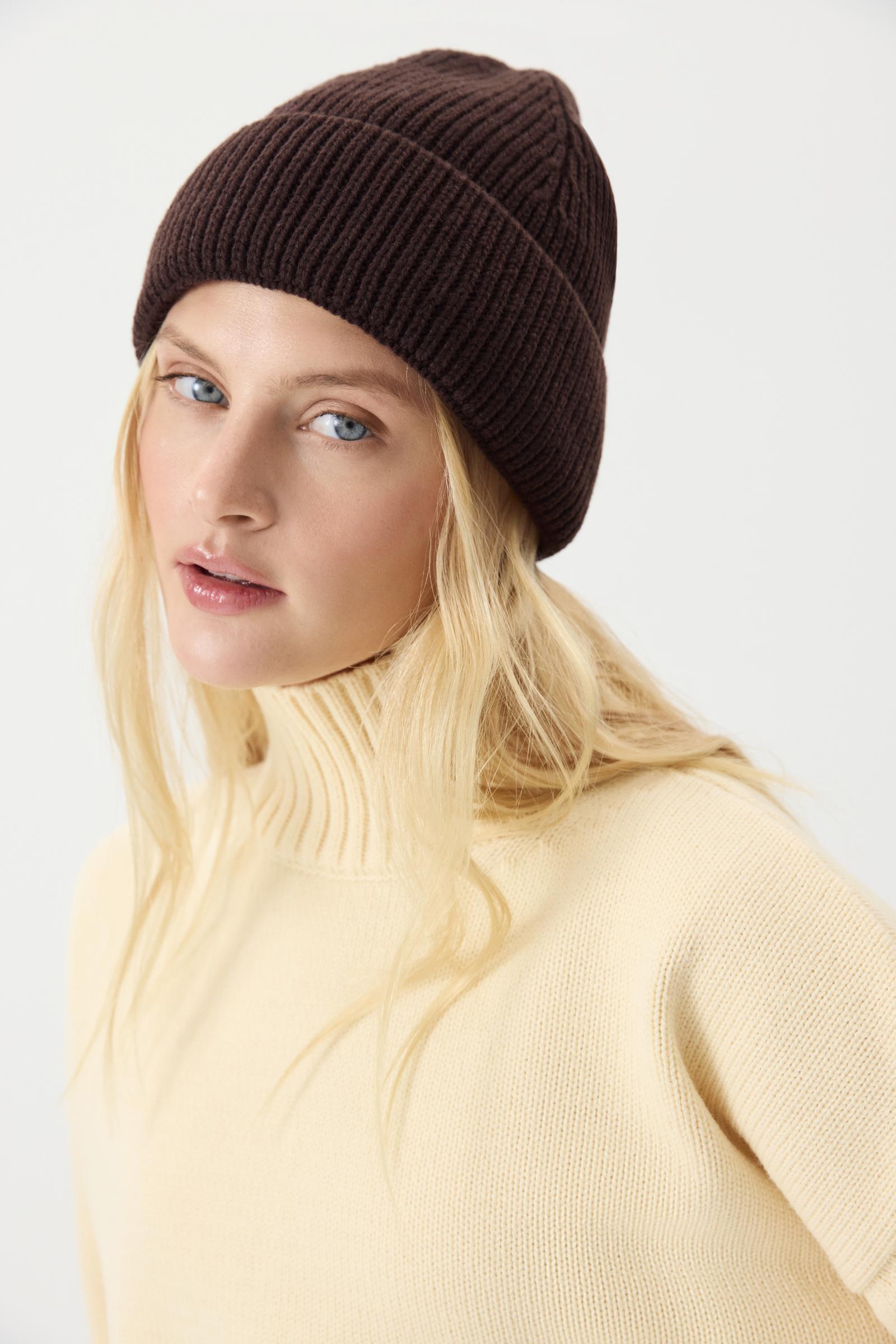 Шапка из мягкой и теплой шерсти мериноса комфортно облегает голову благодаря эластичному переплетению. Отворот регулируется по высоте, а универсальные оттенки и минималистичная форма позволяют сочетать шапку с любой верхней одеждой, от пуховиков до пальто