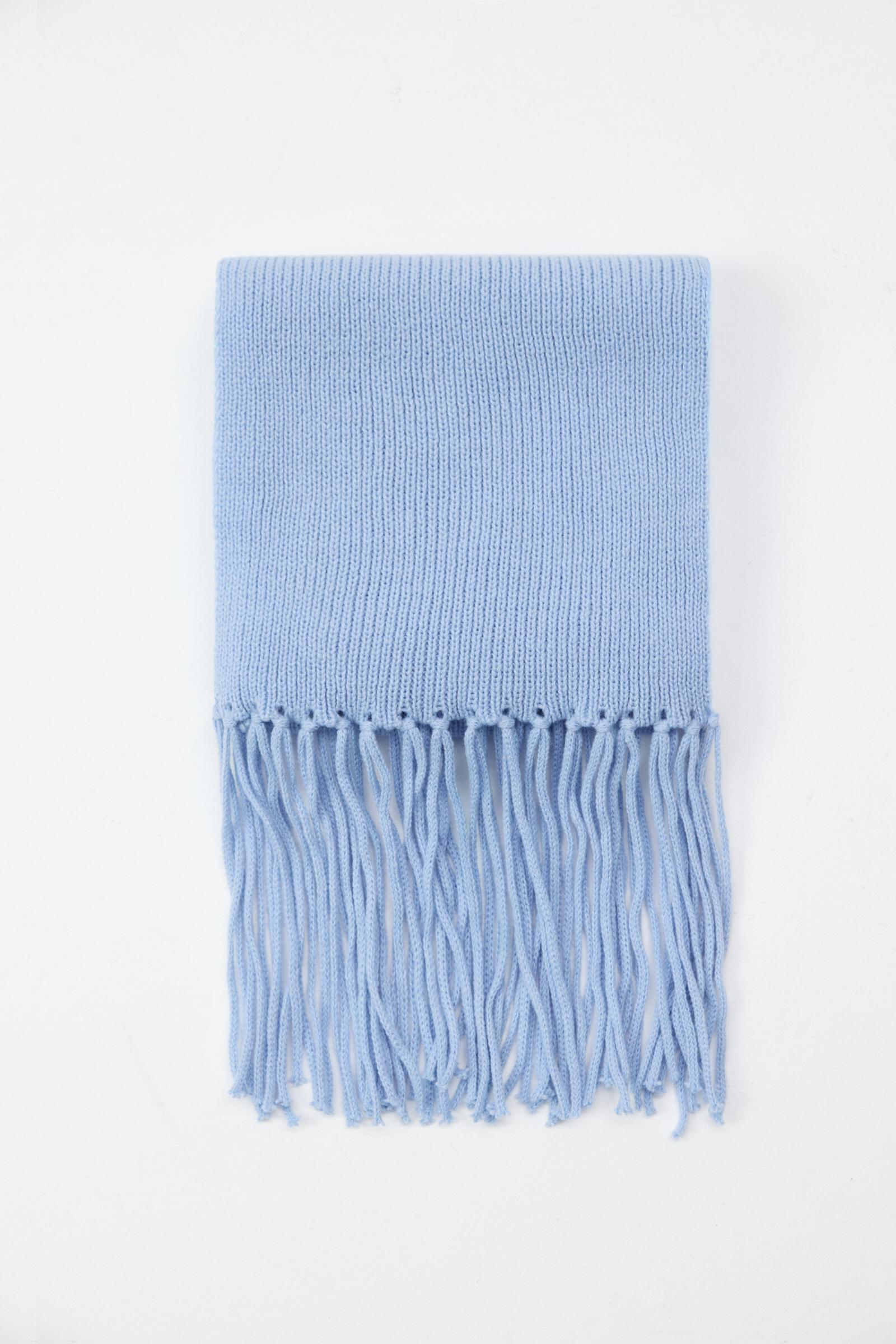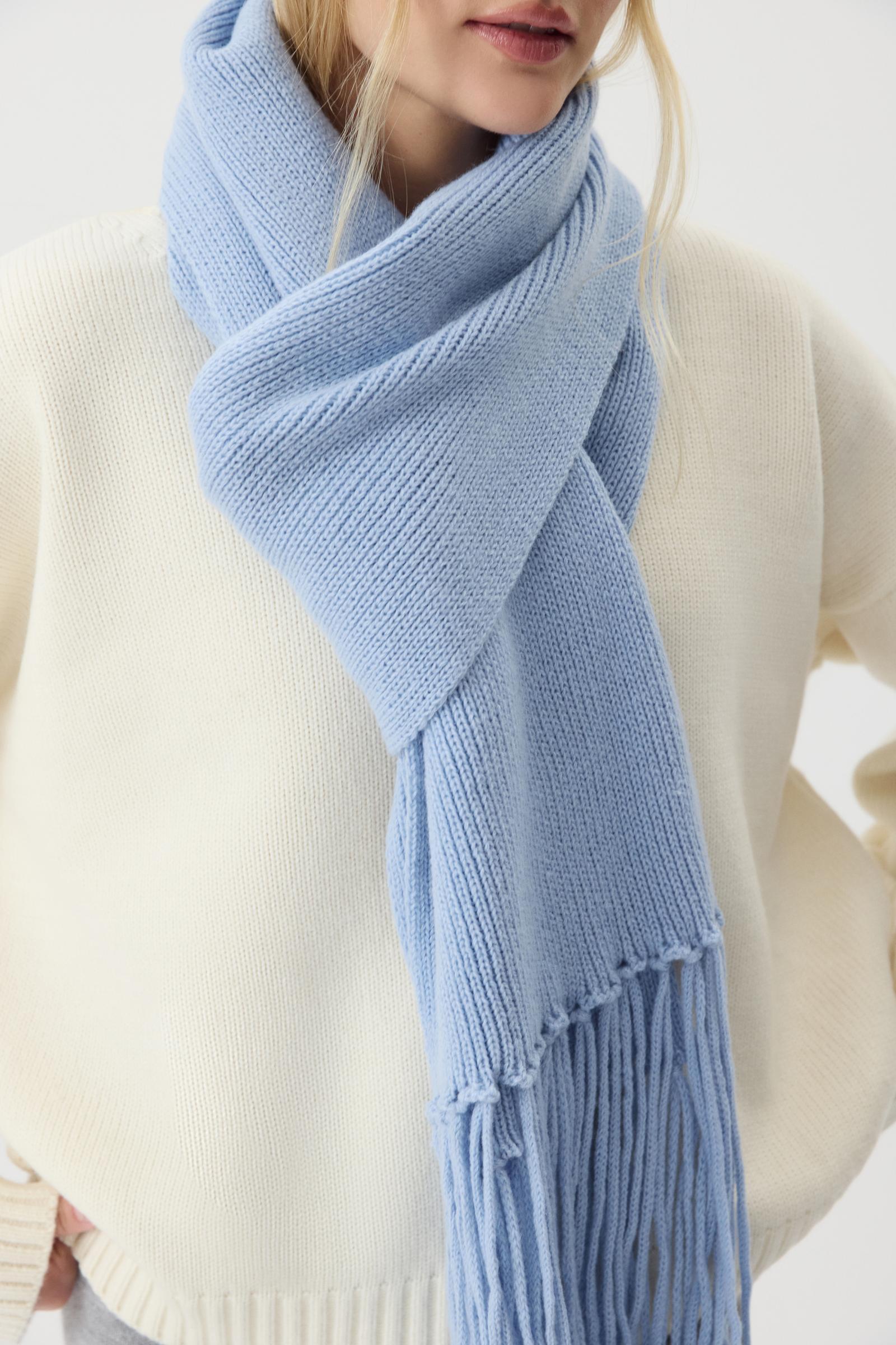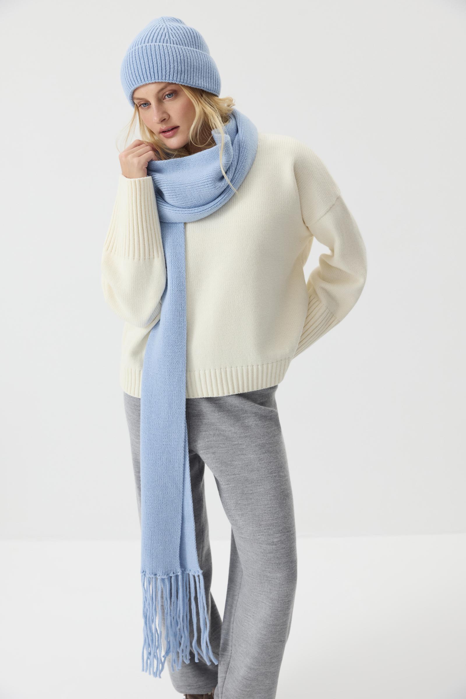 Длинный и теплый шарф, связанный из мягкой шерсти мериноса. Вы можете не только обернуть его вокруг шеи, но и накинуть поверх пальто: образ получится расслабленным и комфортным, благодаря длинной густой бахроме.