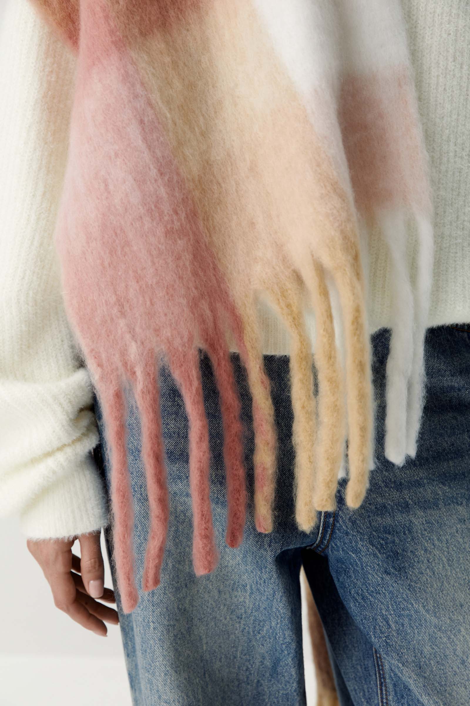 Носите поверх пуховиков и пальто. Шарф достаточно длинный, чтобы повторить модный стайлинг-трюк - заправить его под пояс от пальто.