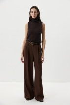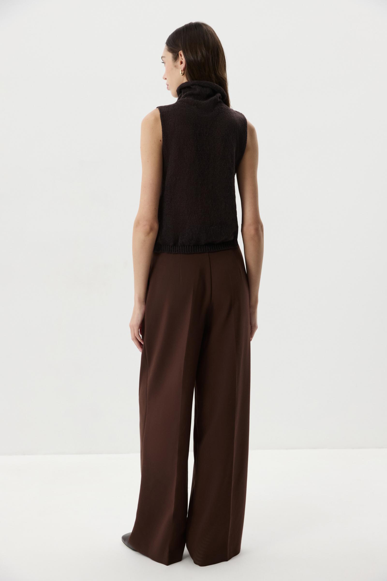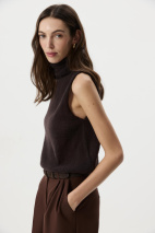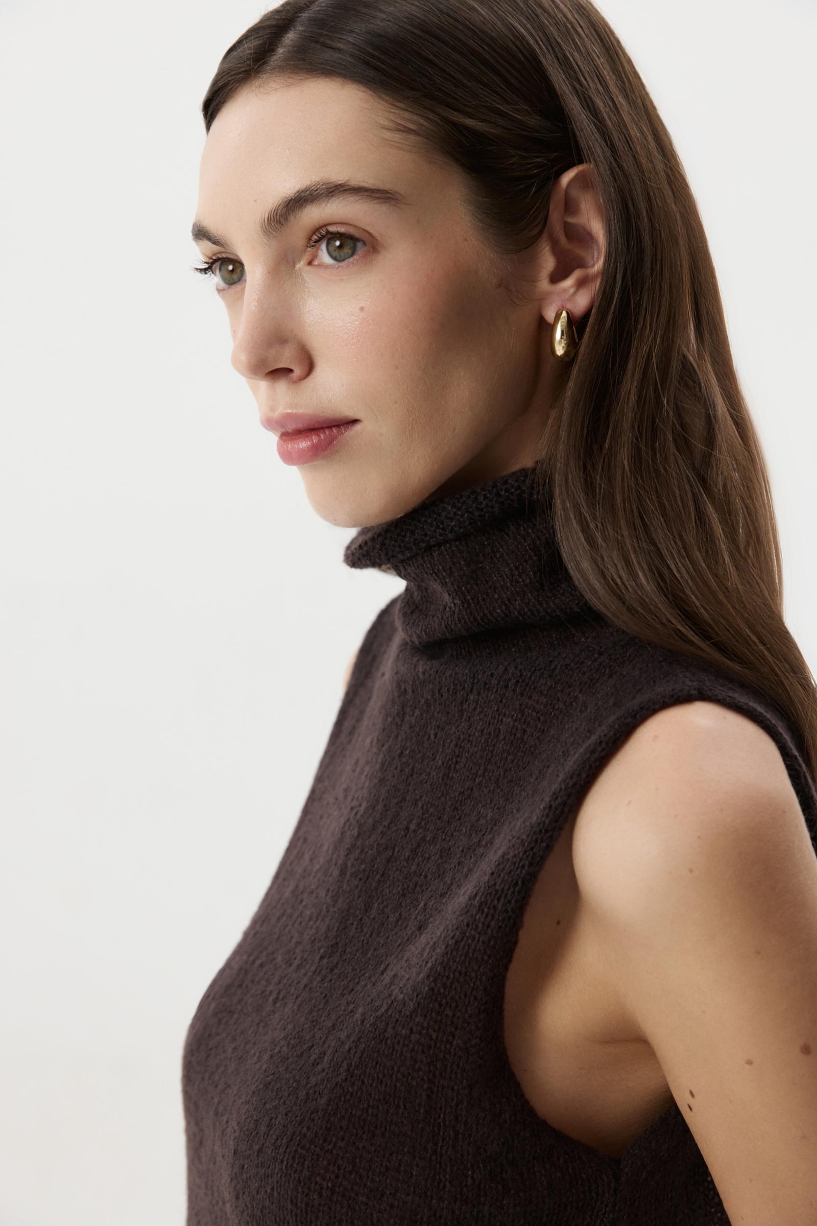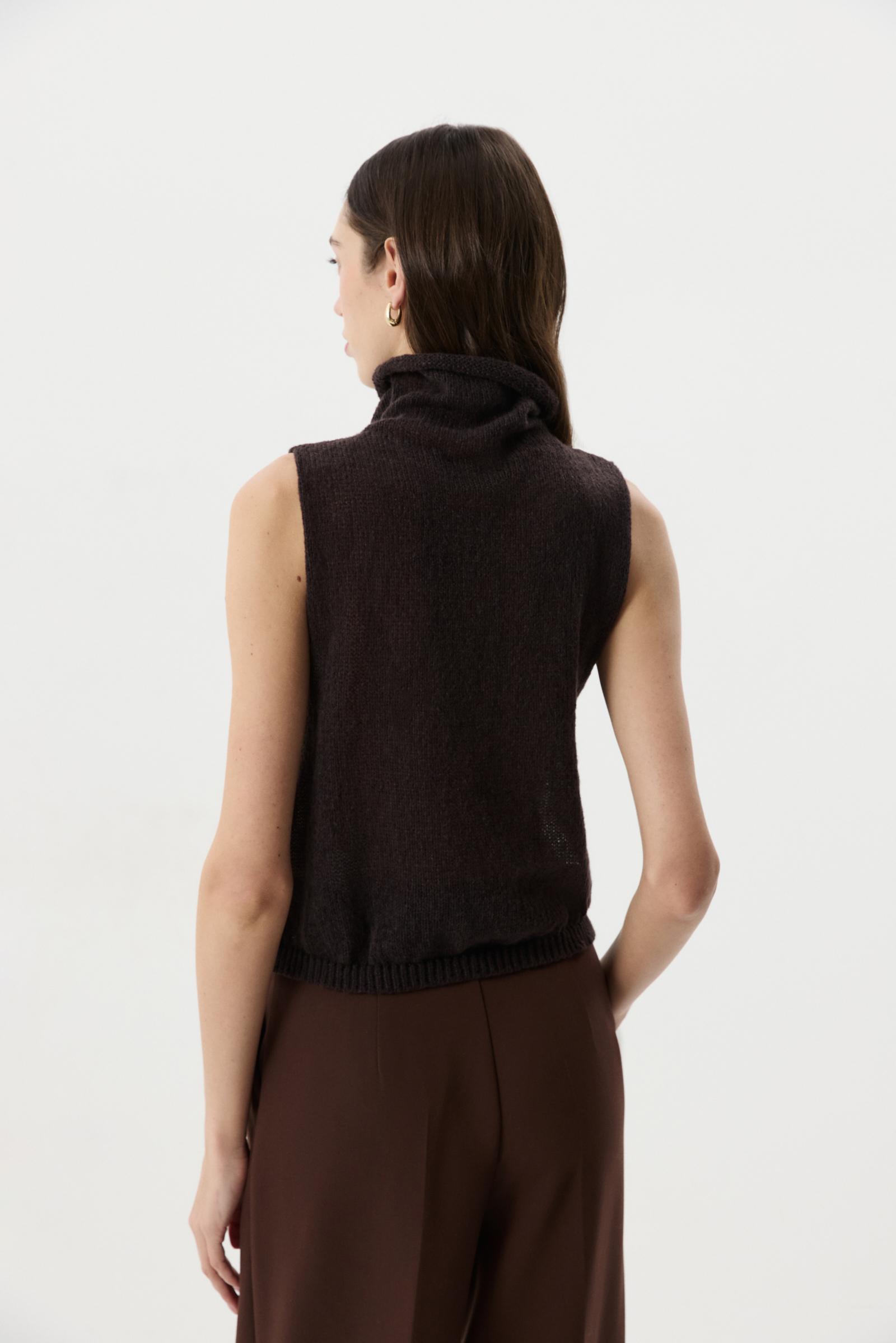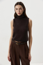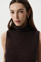 Ажурный вязаный топ без рукавов из пряжи с мохером в составе. Топ аккуратно облегает фигуру, подчеркивая линию плеч, а высокий воротник визуально удлиняет шею.