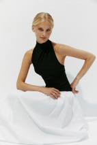 Женственный топ облегающего силуэта. Особенным акцентом модели является высокая аккуратная горловина. Топ дополнен драпировкой по бокам, которая подчеркивает линии талии, делая силуэт более выразительным. Для пошива изделия был выбран мягкий вискозный трикотаж.