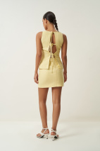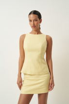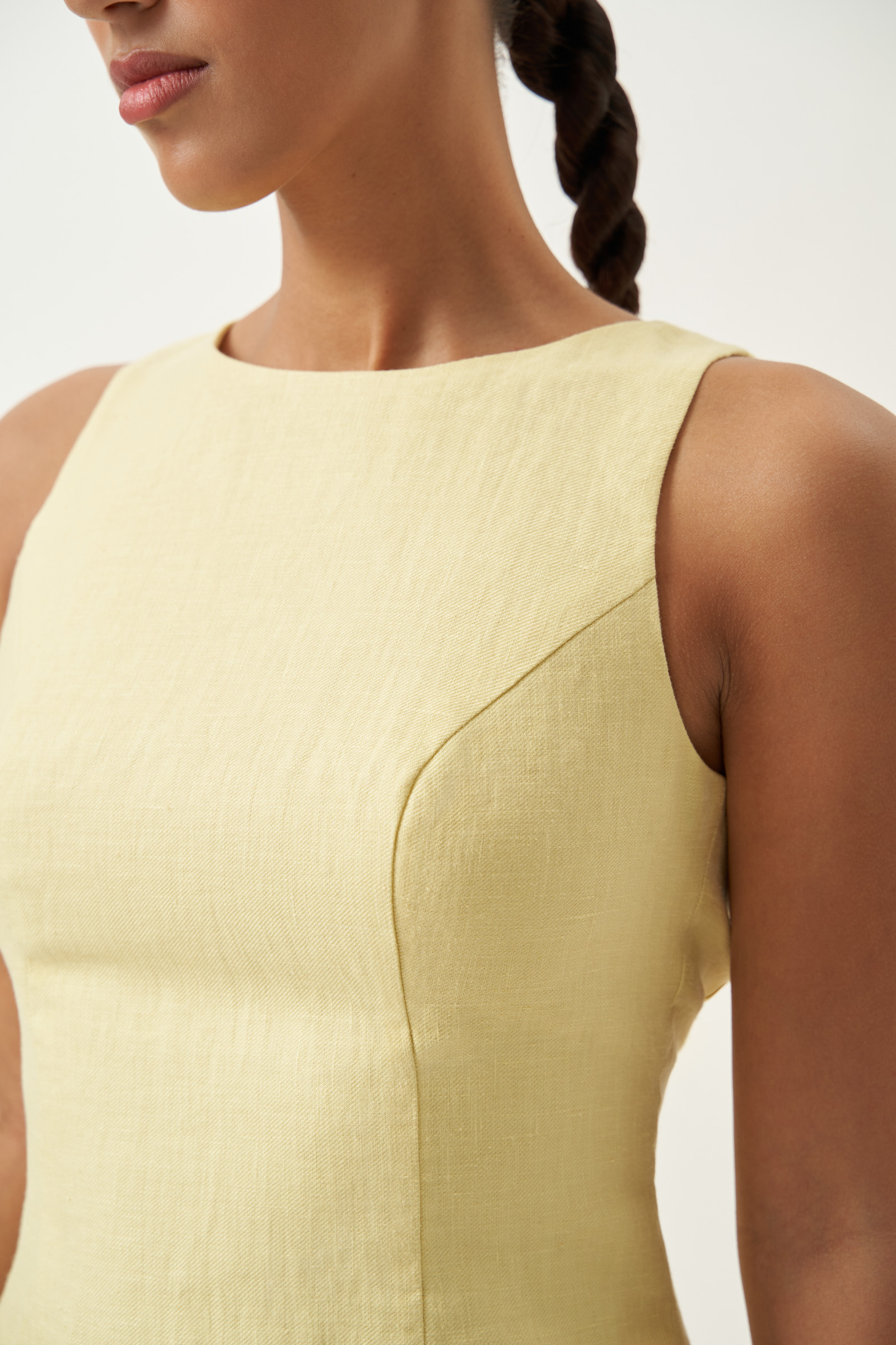 Лаконичный льняной топ с горловиной- лодка на подкладке. Топ с формообразующими рельефами на передней половинке и спинке, что хорошо сажает изделие по фигуре. На спинке функциональные завязки, позволяющие регулировать степень прилегания, делать посадку более прилегающей или свободной. Если не хотите постоянно завязывать все завязки, зафиксируйте покрепче две нижние и пользуйтесь только верхней. Длина до середины бедра.
