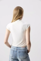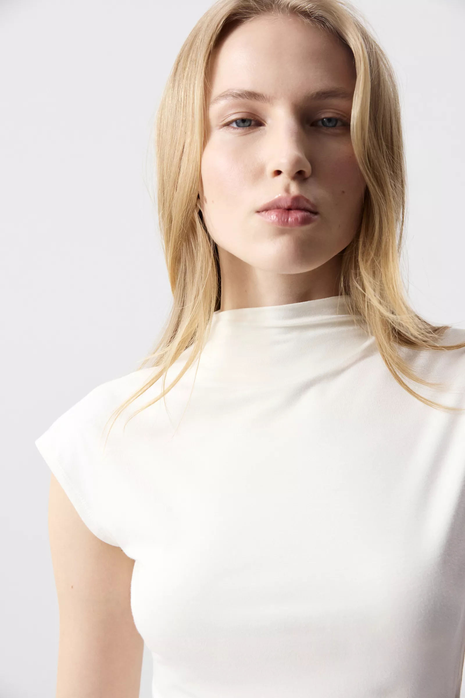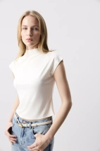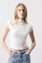 Топ из трикотажа с горловиной-стойкой — лаконичная модель с акцентом на чистый силуэт и современную эстетику. Цельнокроеный короткий рукав формирует плавную линию плеча. Горловина-стойка подчёркивает шею.