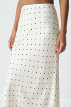 Юбка миди из мягкой струящейся ткани, с вискозой в составе и гороховым принтом. Юбка силуэта - рыбка с резинкой в поясе, скроена по косой.