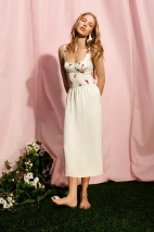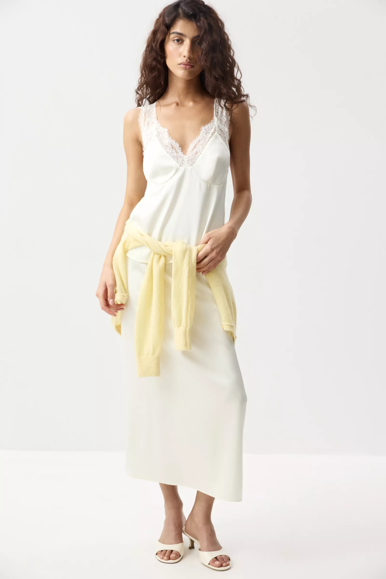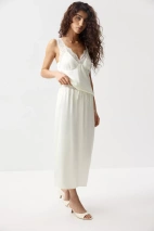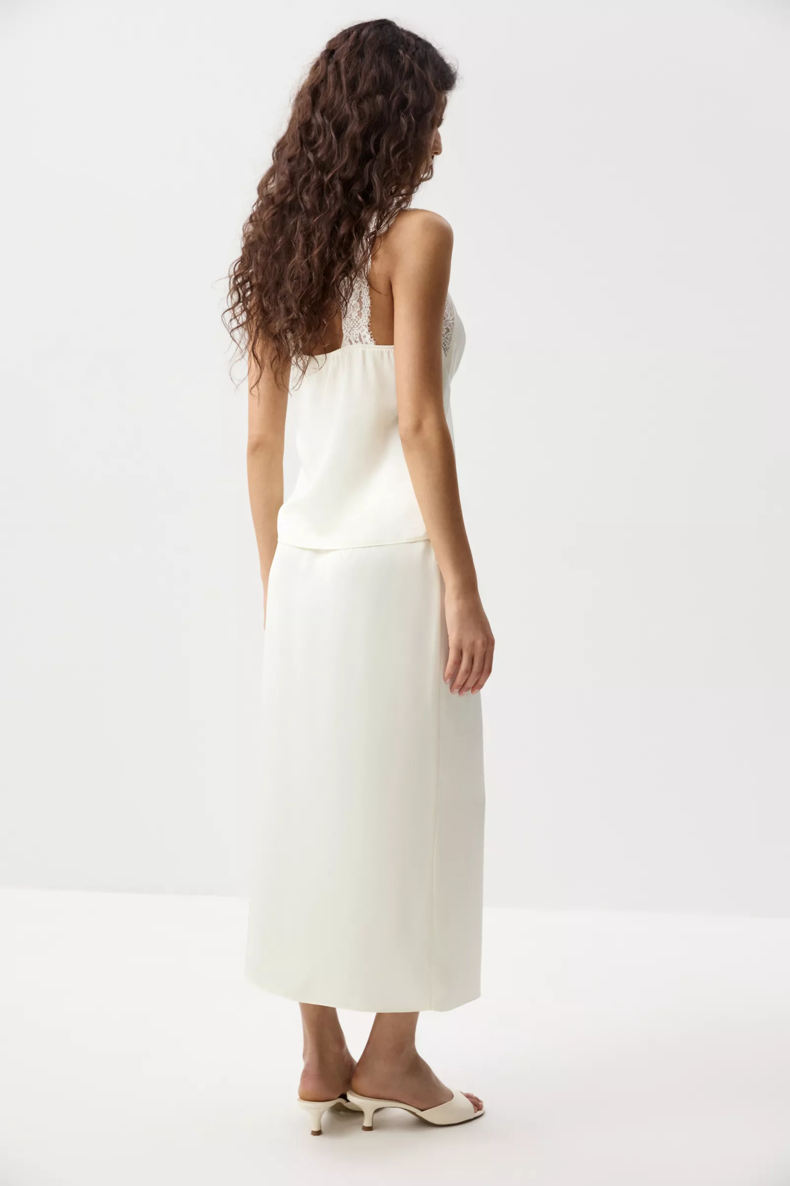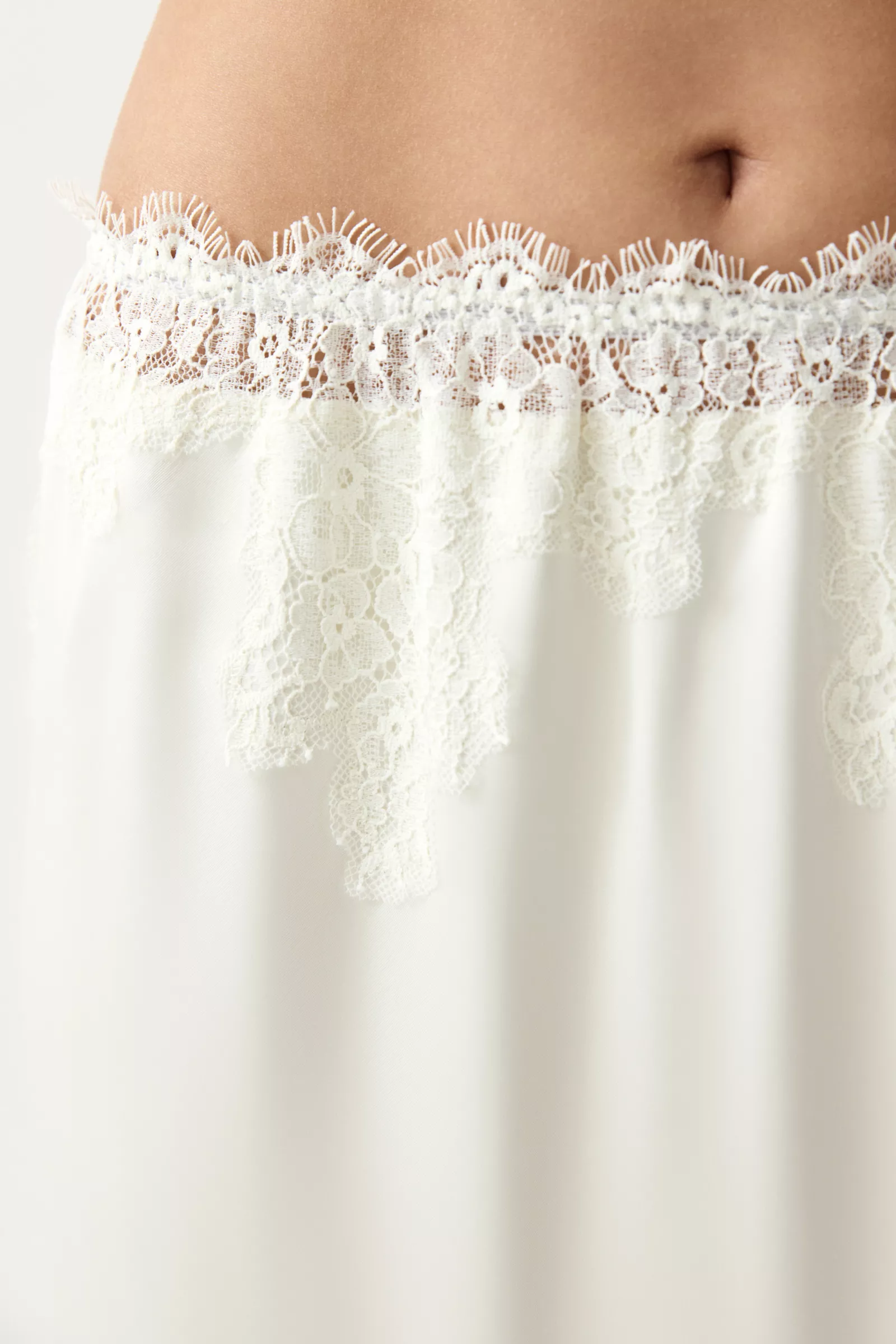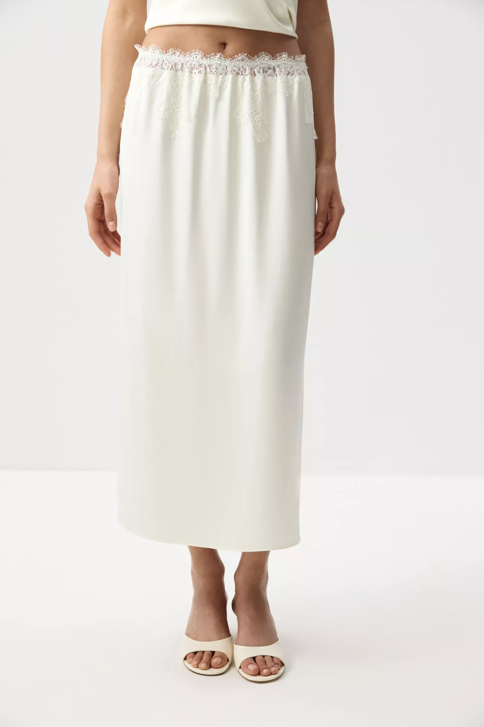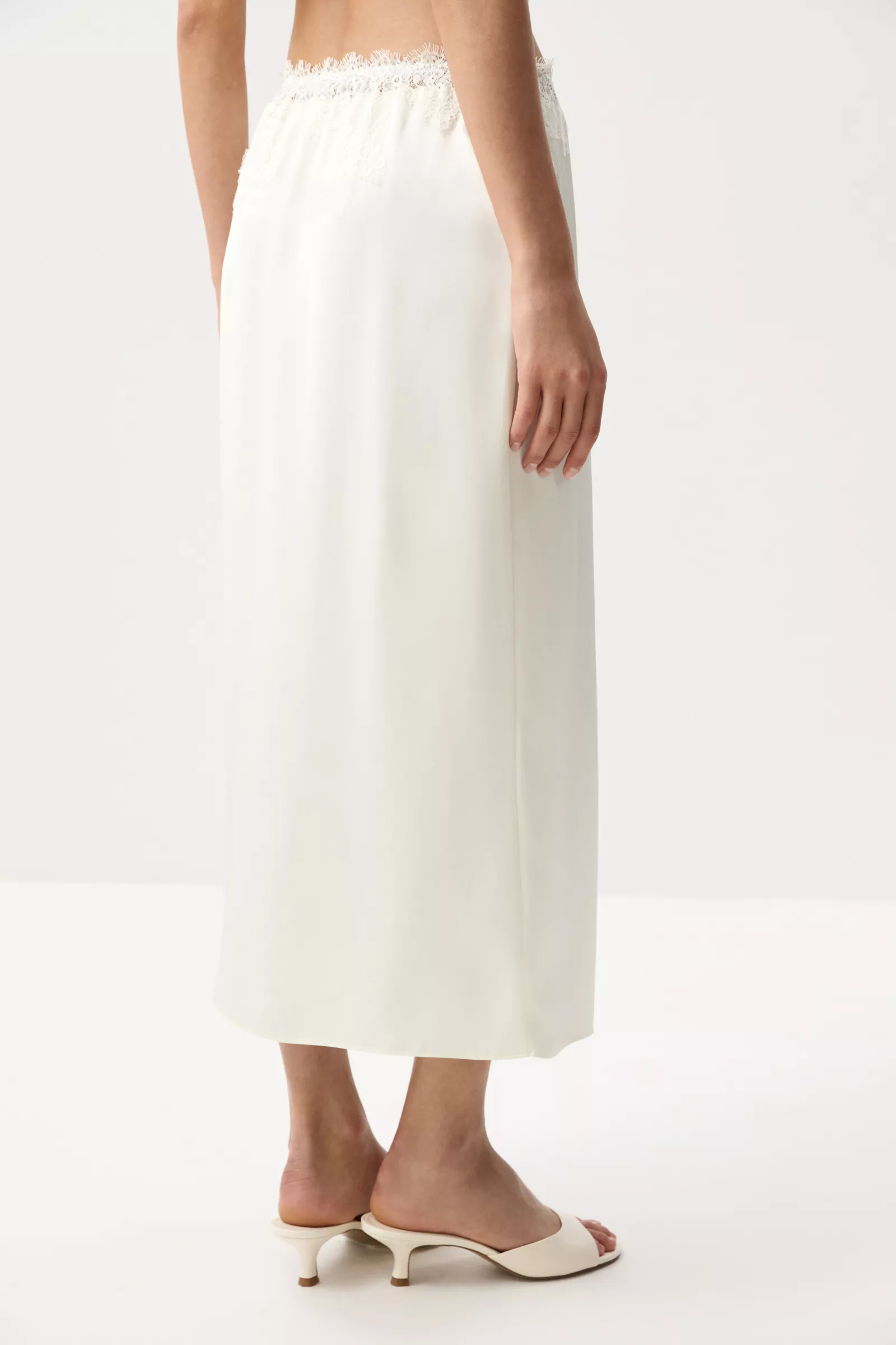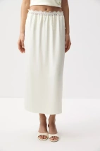 Юбка из мягкого сатина с легким блеском. Широкая кружевная вставка по верхнему краю изделия изящно подчеркивает линию талии. Контраст фактур - гладкого сатина и ажурного кружева - делает модель выразительной, но при этом чувственной.