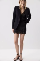 Юбка мини из плотного сатина с деликатным блеском, на подкладке. По низу изделия фигурно настрочено деликатное кружево. Застежка на потайную тесьму молнию в боковом шве.