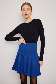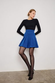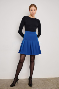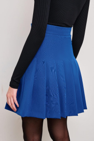 Мини юбка на высокой посадке, с потайной молнией и декоративными складками. Свободный, расклешенный силуэт не сковывает движения. Модель плотно прилегает по линии талии и бедрам, изящно делая акцент на фигуре. Юбка выполнена в длине чуть выше колена, ткань не мнется и комфортна в носке.