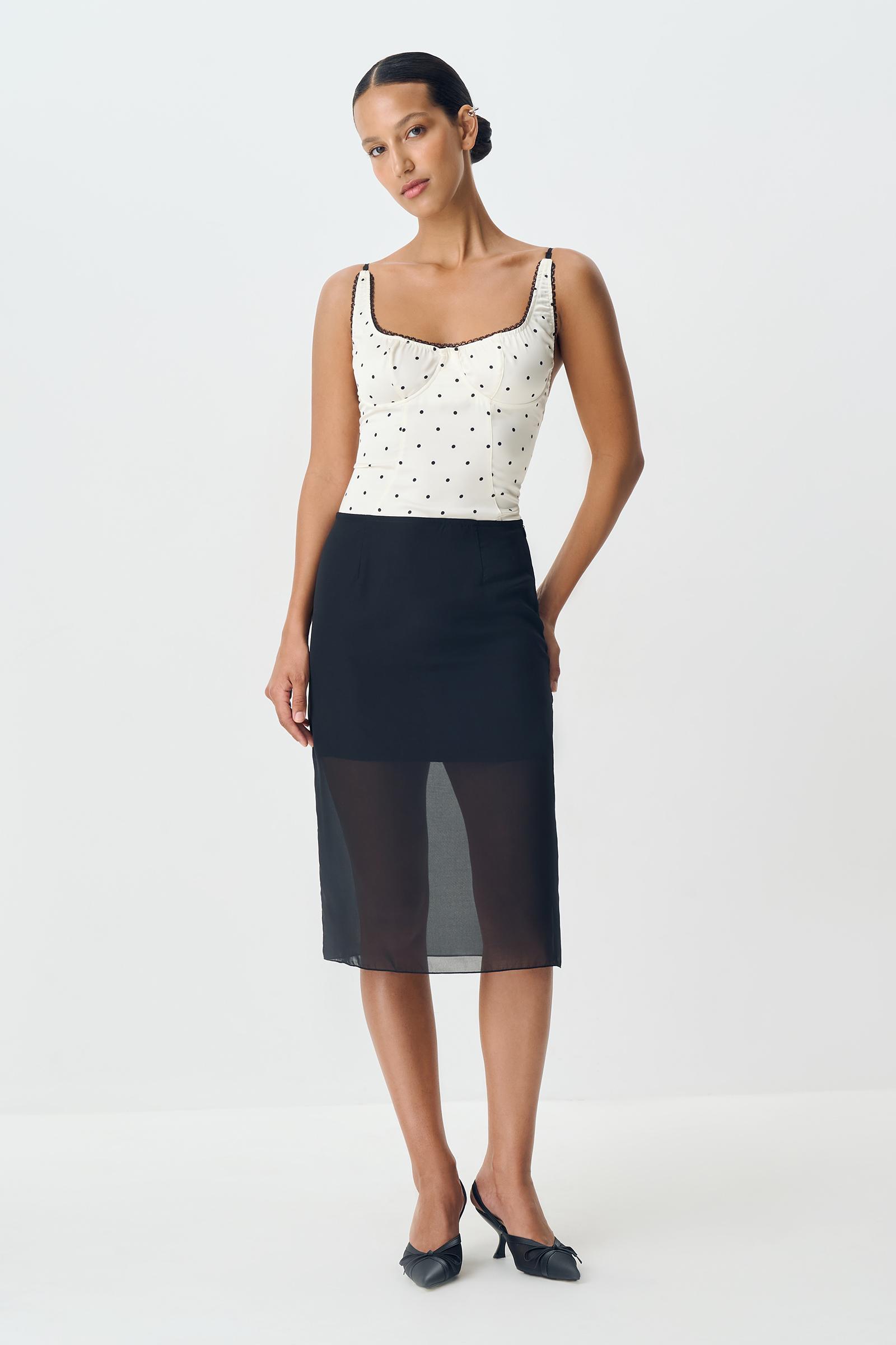 Юбка из мягкого полупрозрачного шифона. Модель прямого силуэта, имеет подклад - мини юбку. В изделие посадка средняя и длина миди.