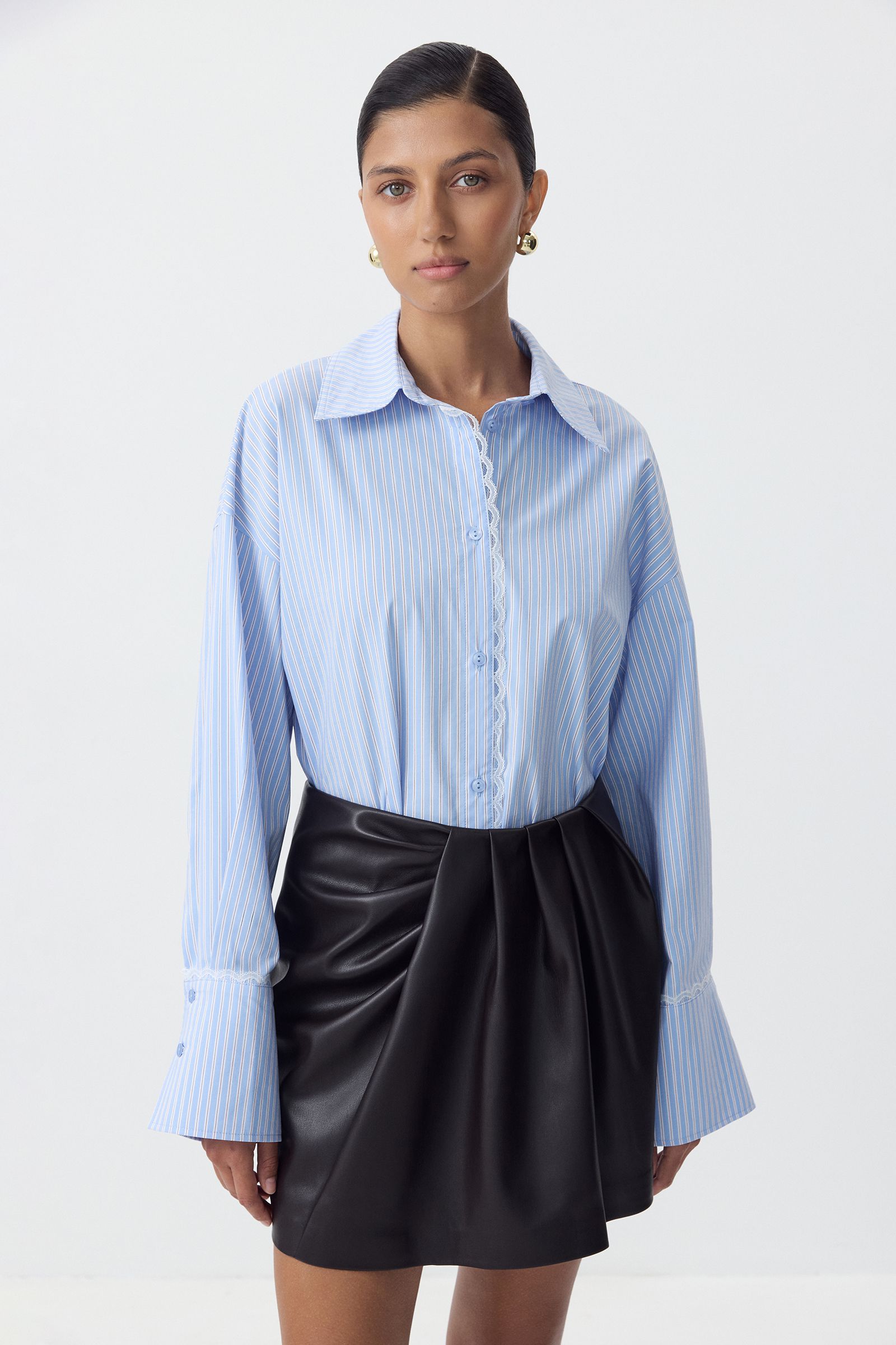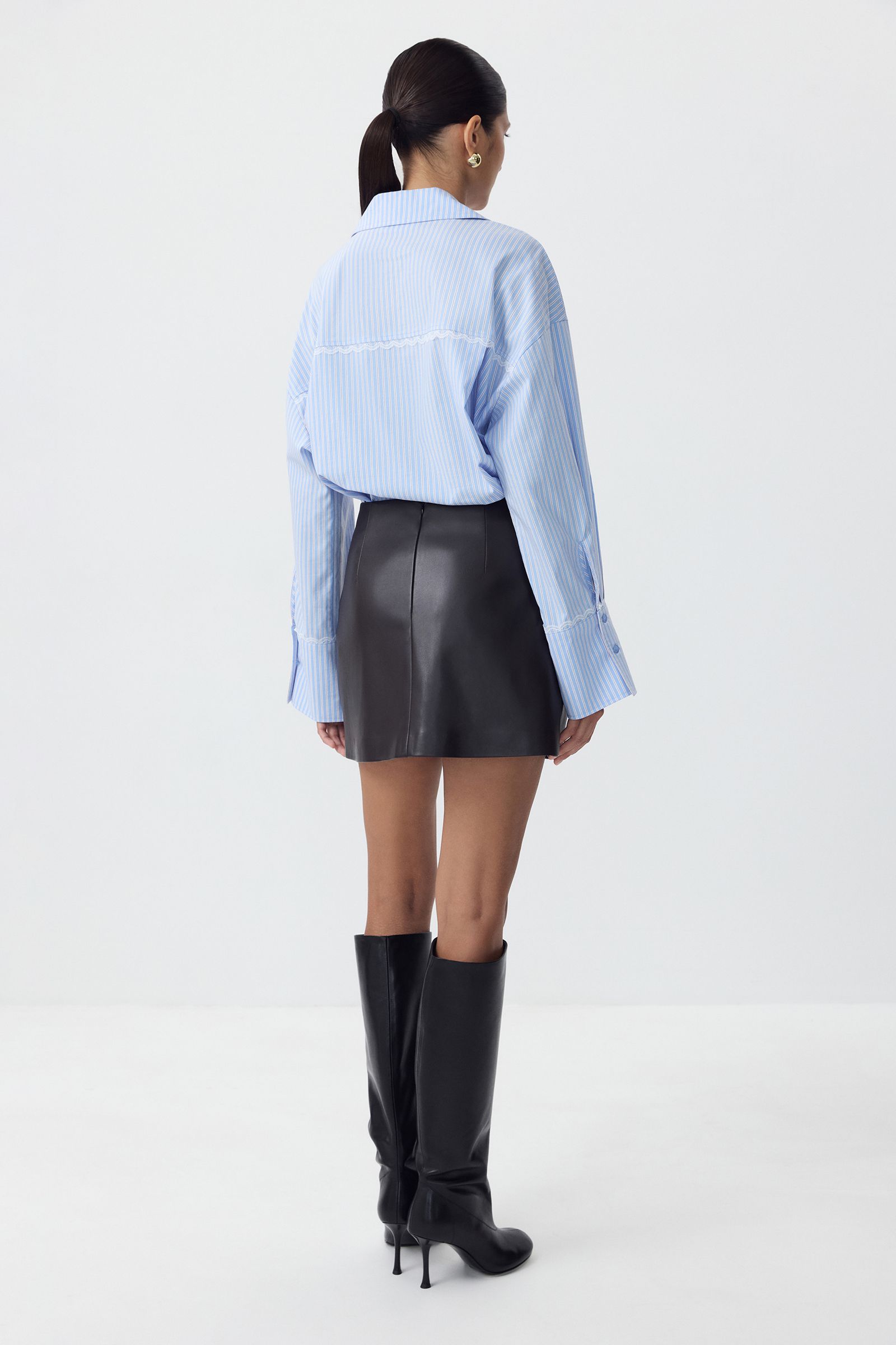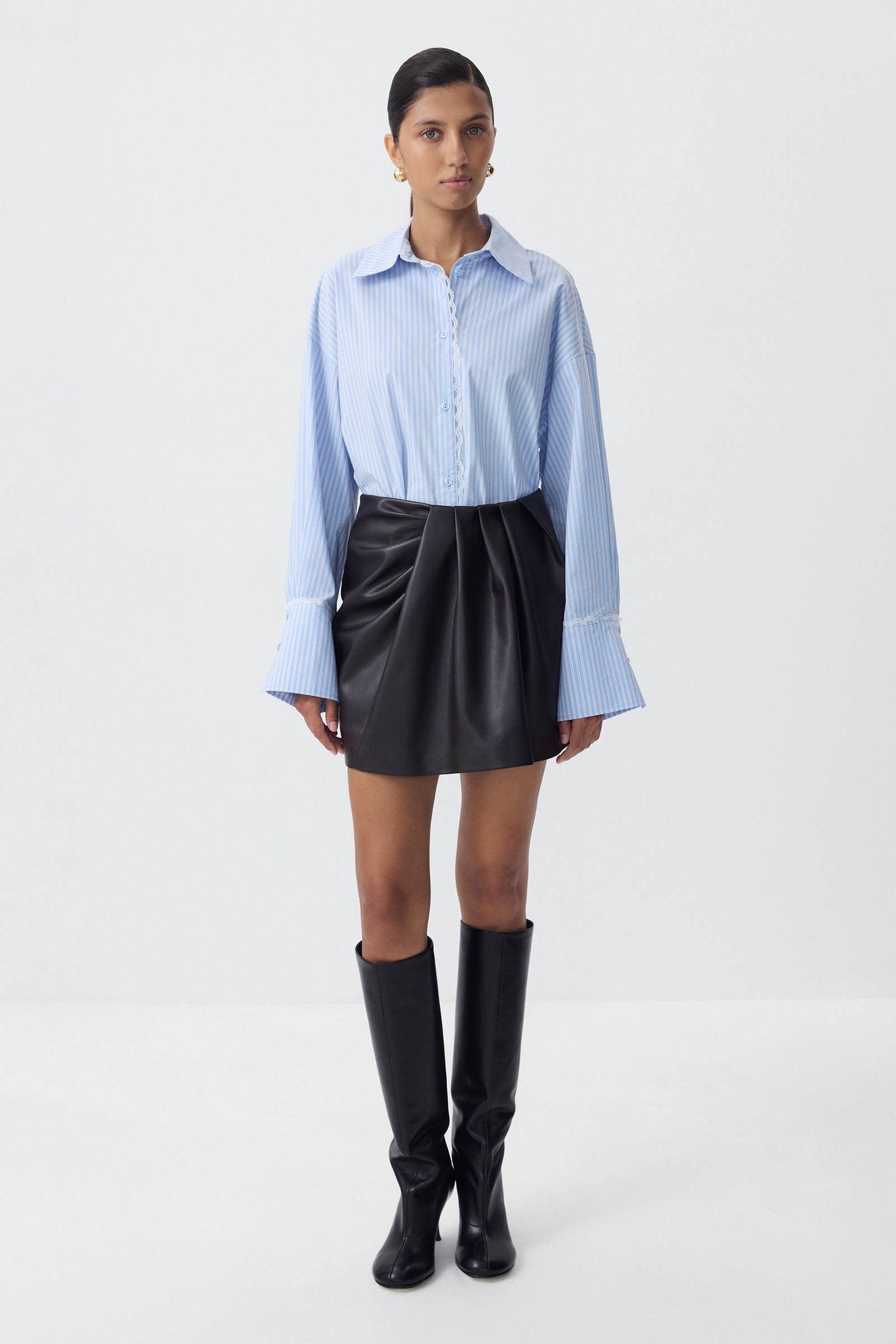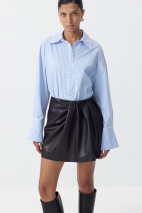 Юбка из эко-кожи длины мини с акцентной драпировкой на полчке. Поможет создать женственный силуэт. Юбка на эластичной подкладке, застежка на молнию в боковом шве.