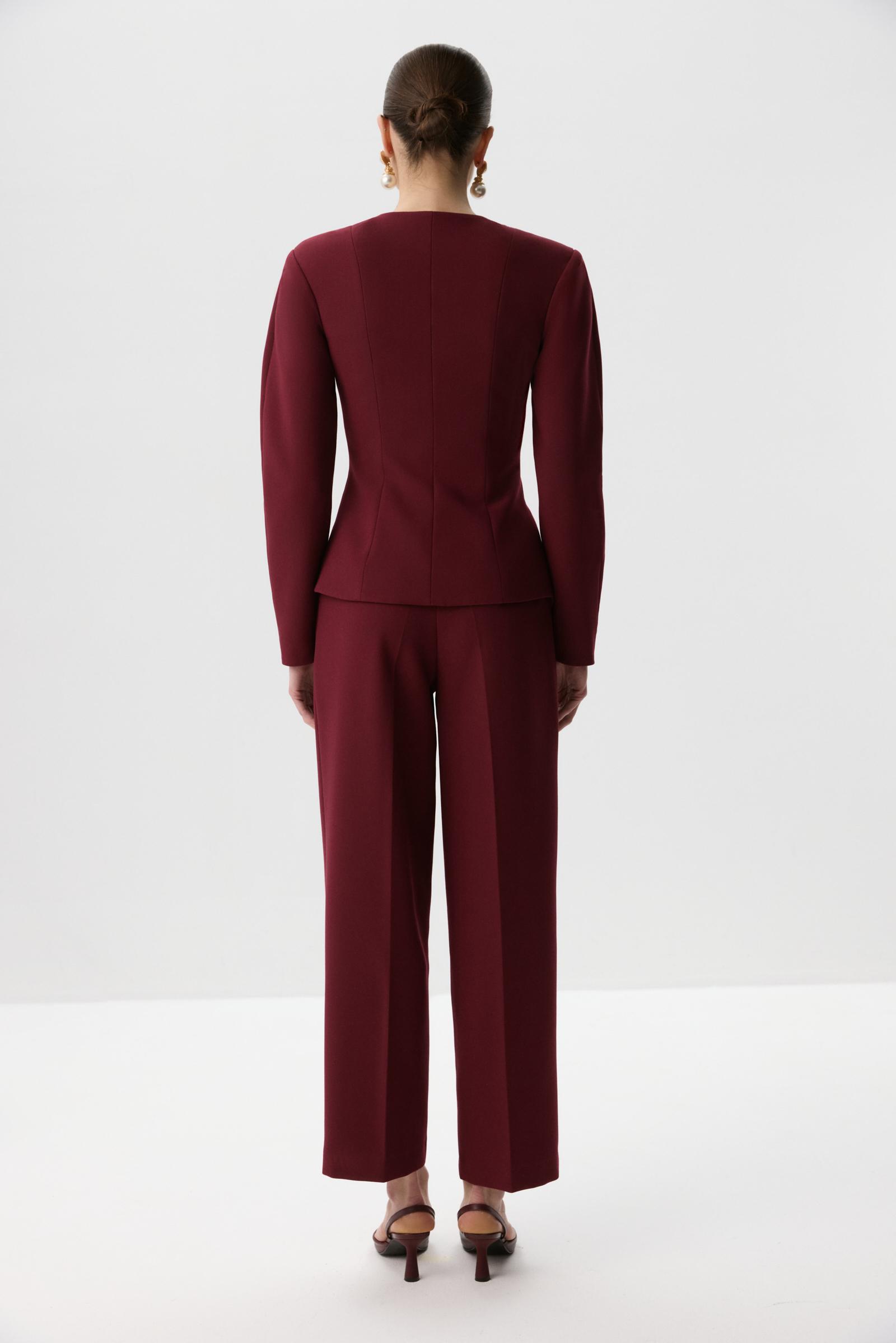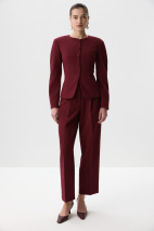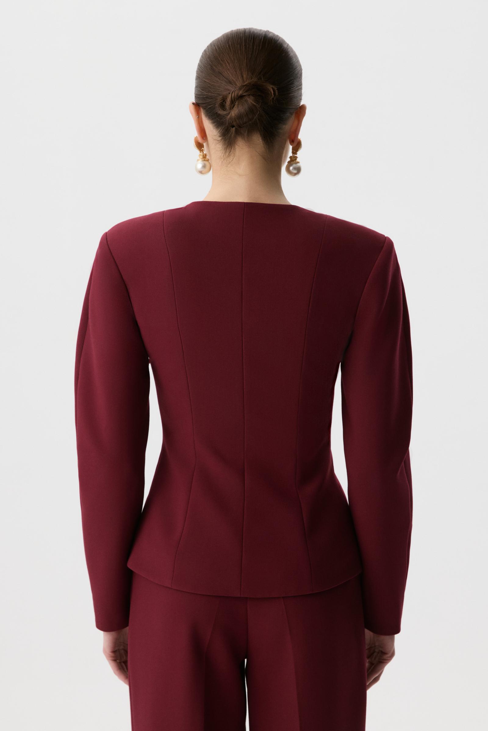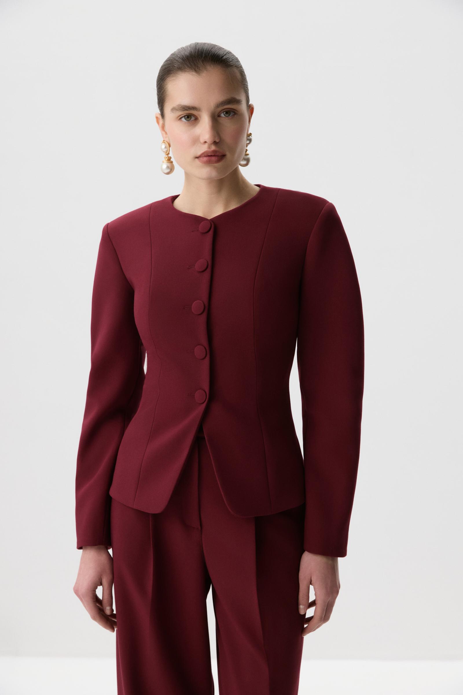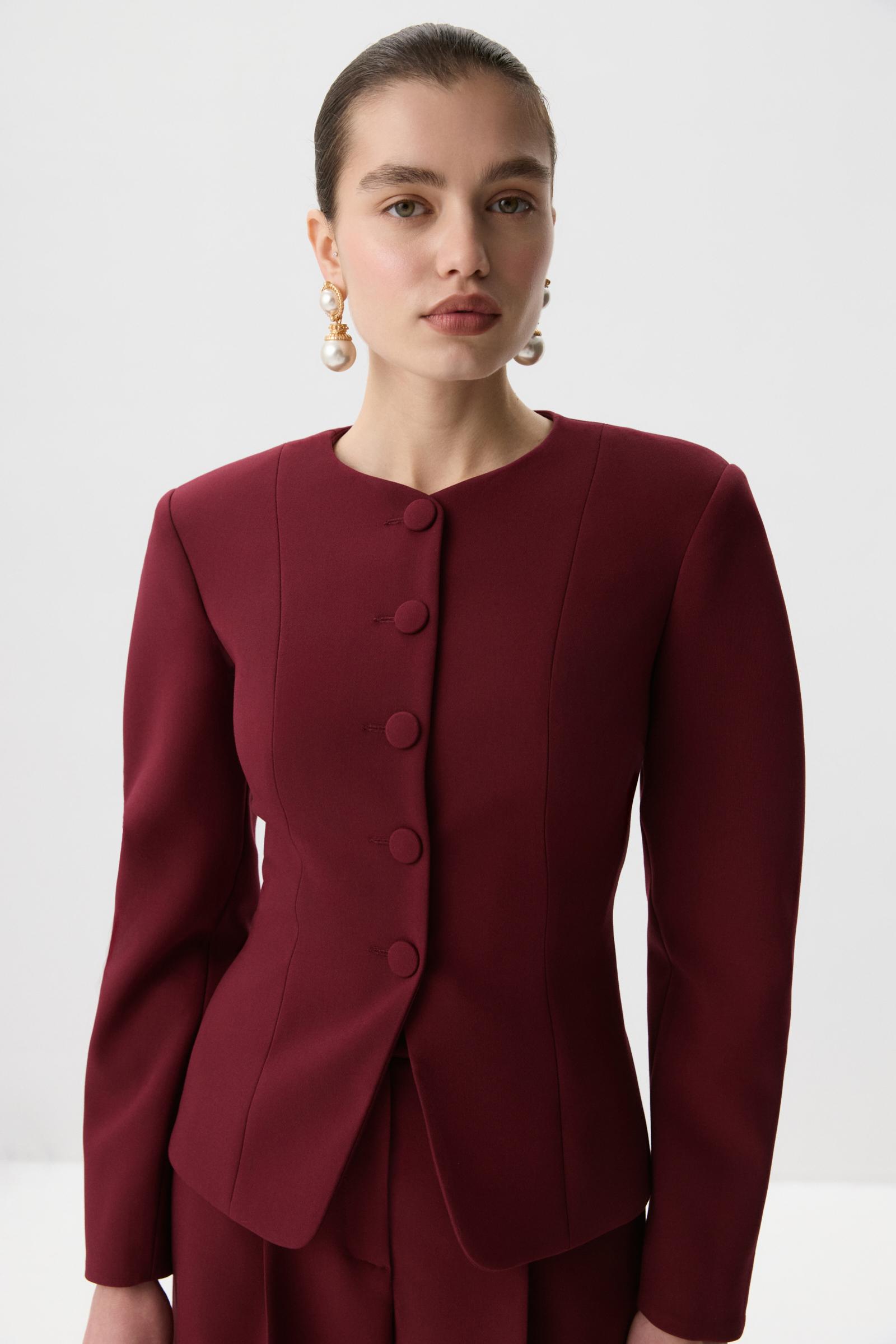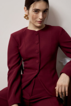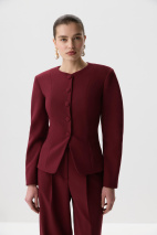 Жакет приталенный без воротника, о-образного силуэта. Изделие с вертикальными формообразующими рельефами на полочке и спинке. Застежка на пять больших, обтянутых основной тканью пуговиц, средний шов на спинке, скругленные края борта. Удлиненная линия плеча, двухшовный округлый рукав. Изделие на подкладке.