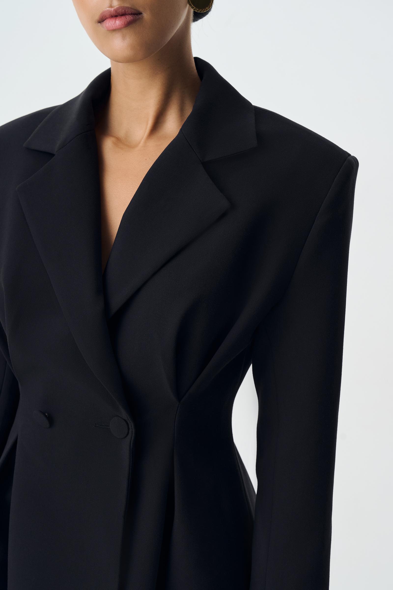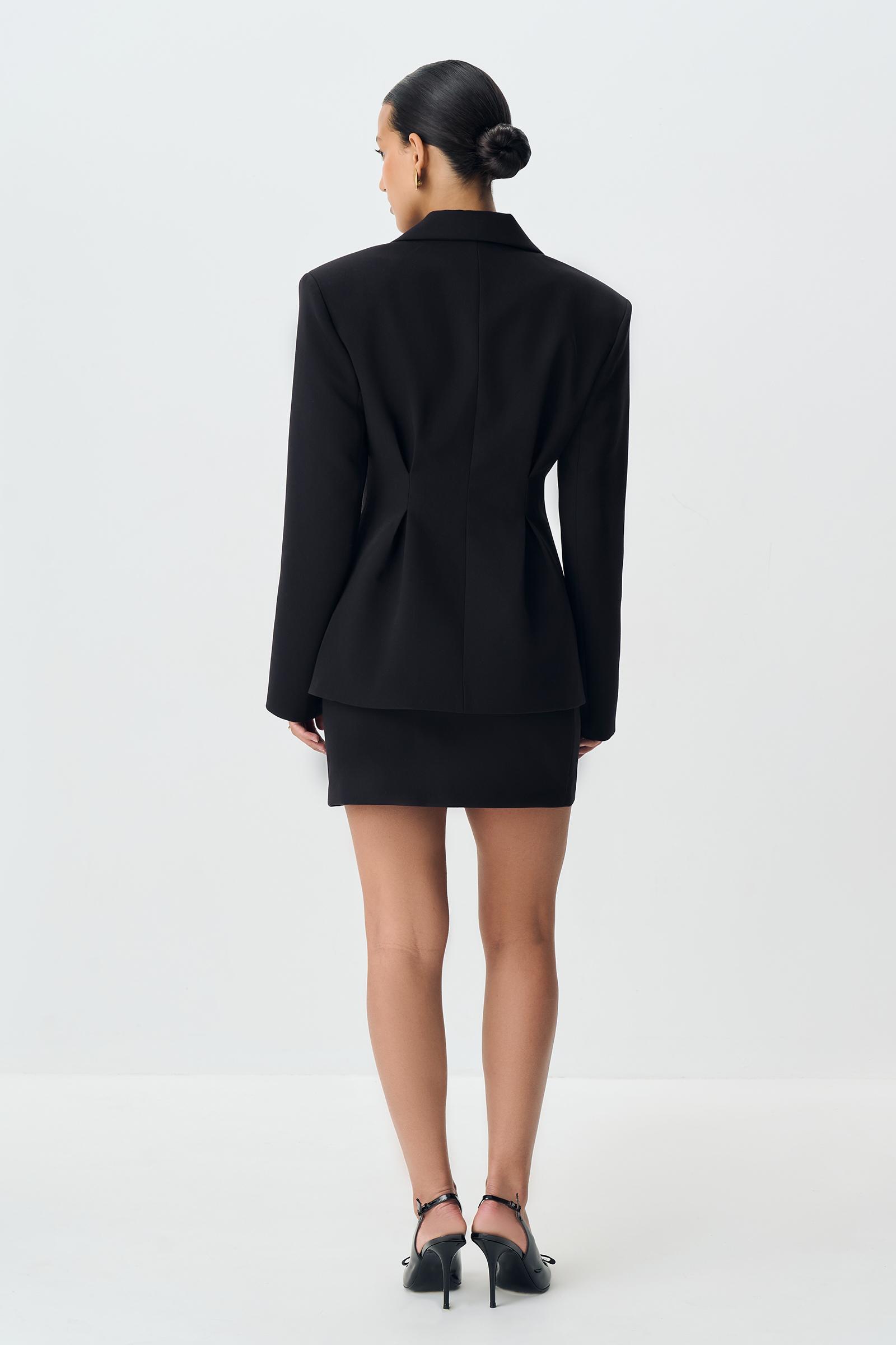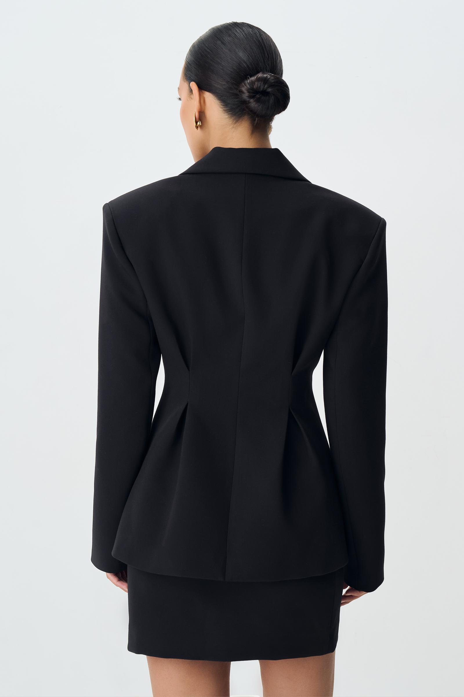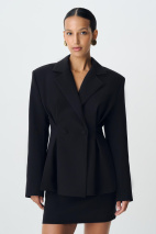Приталенный жакет с защипами из костюмной ткани. Изделие с расширенной линией плеча, объемным низом, который формирует силуэт песочных часов, скульптурными складками и застежкой на пуговицы по центр