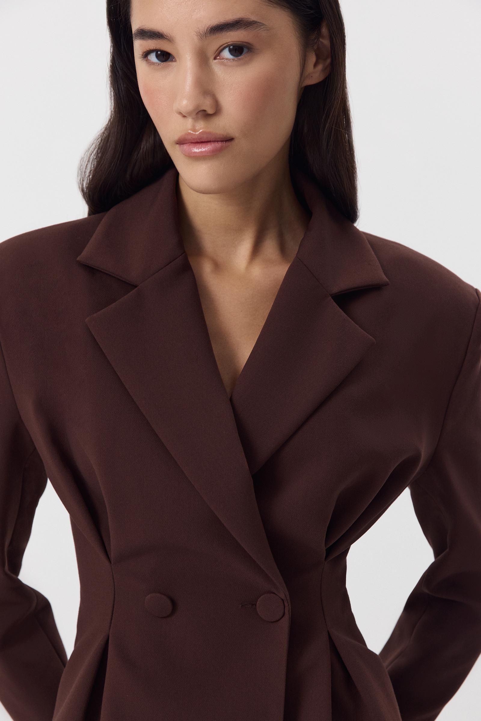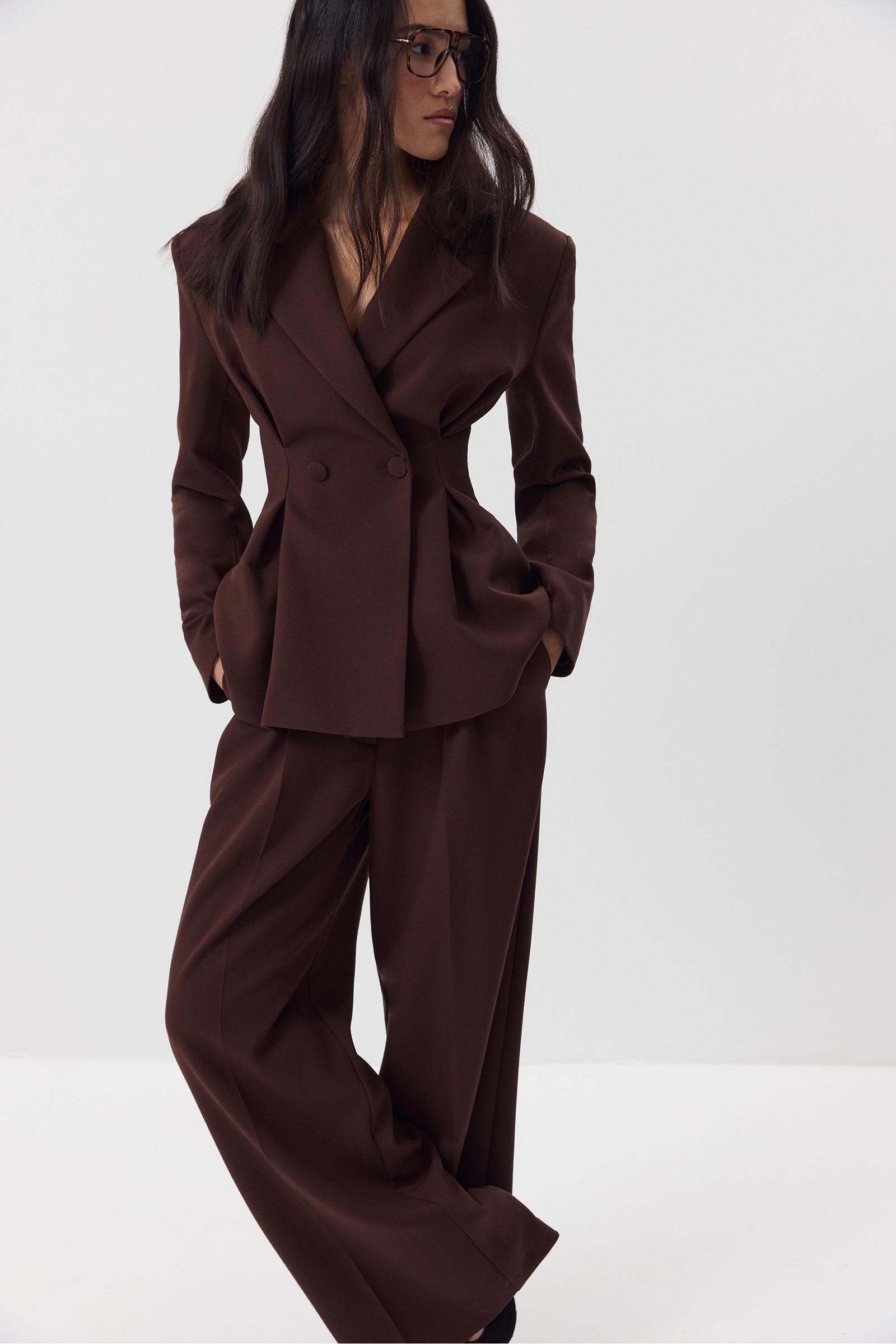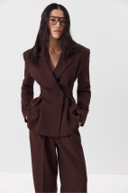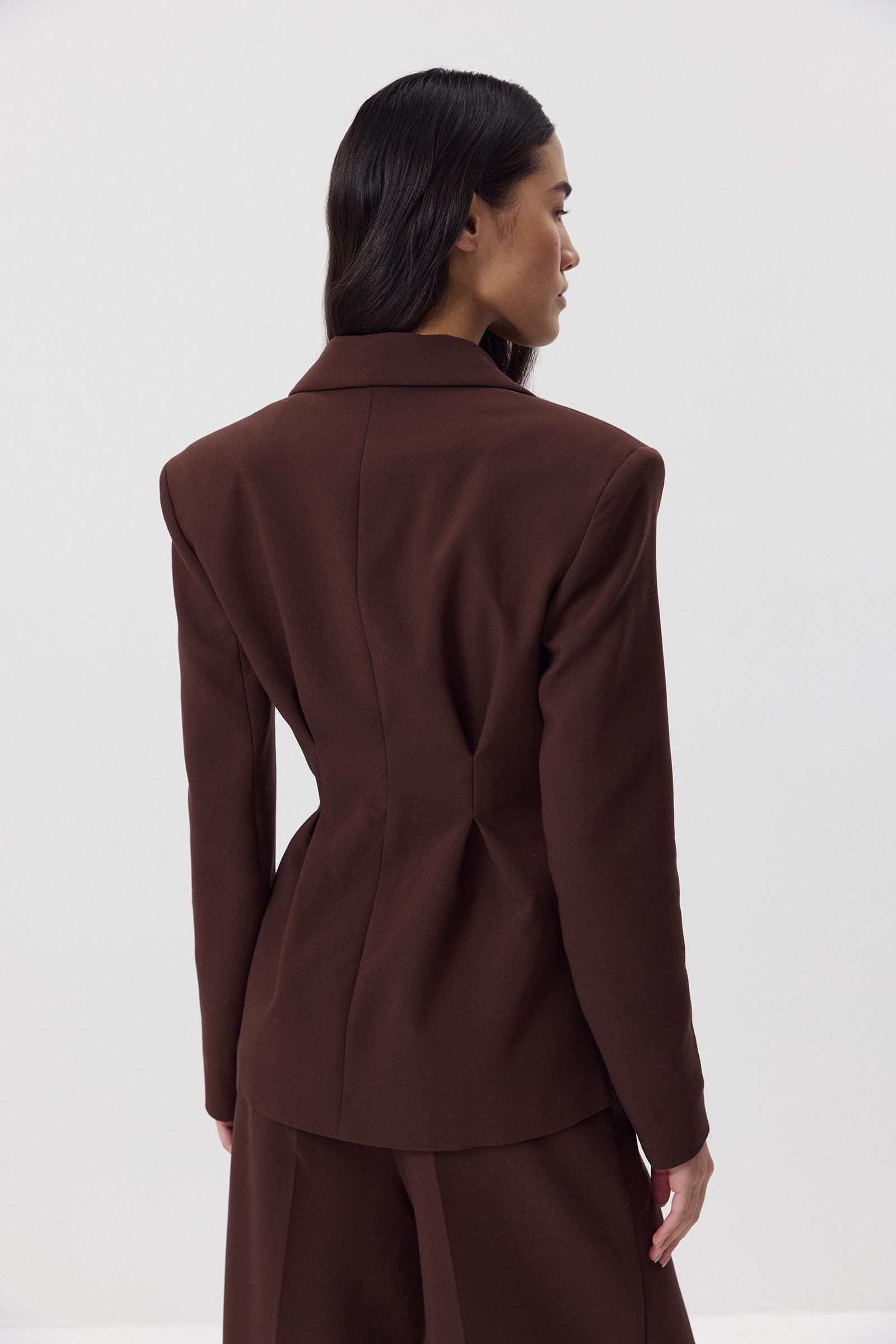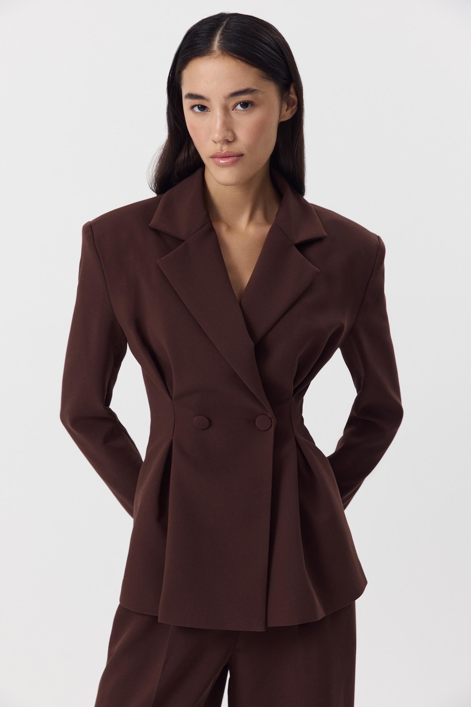 Приталенный жакет с защипами из костюмной ткани. Изделие с расширенной линией плеча, объемным низом, который формирует силуэт песочных часов, скульптурными складками и застежкой на пуговицы по центр