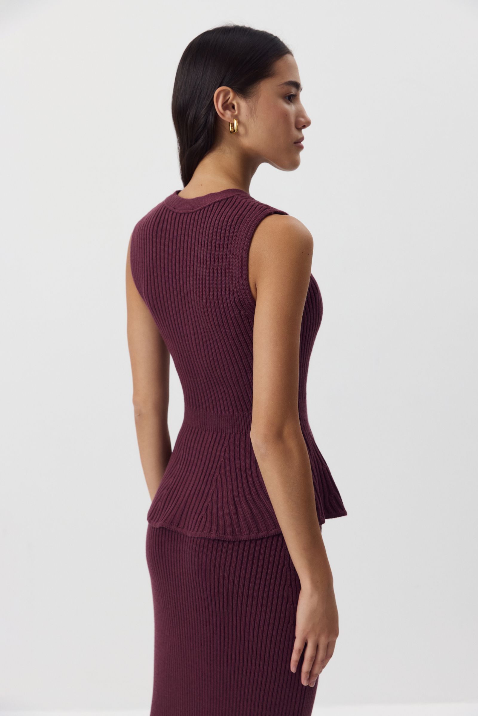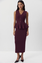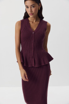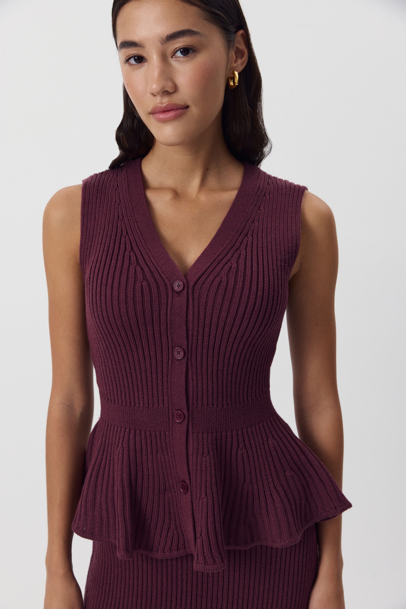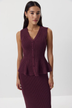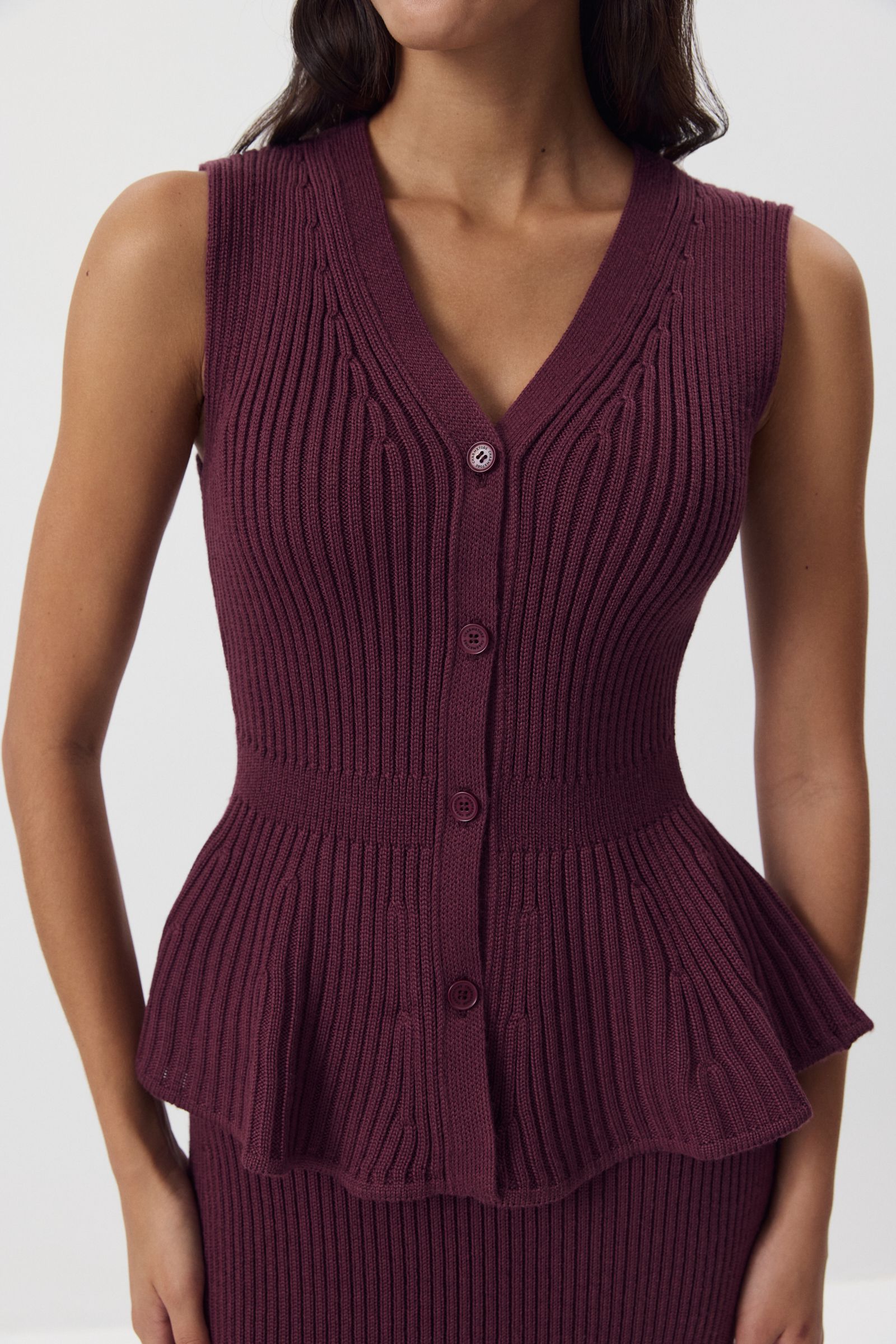 Аккуратный вязаный жилет с v-вырезом создает подчеркнуто женственный силуэт. Жилет прилегающего силуэта с баской связан из тонкой и гладкой нитки на основе шерсти мериноса.